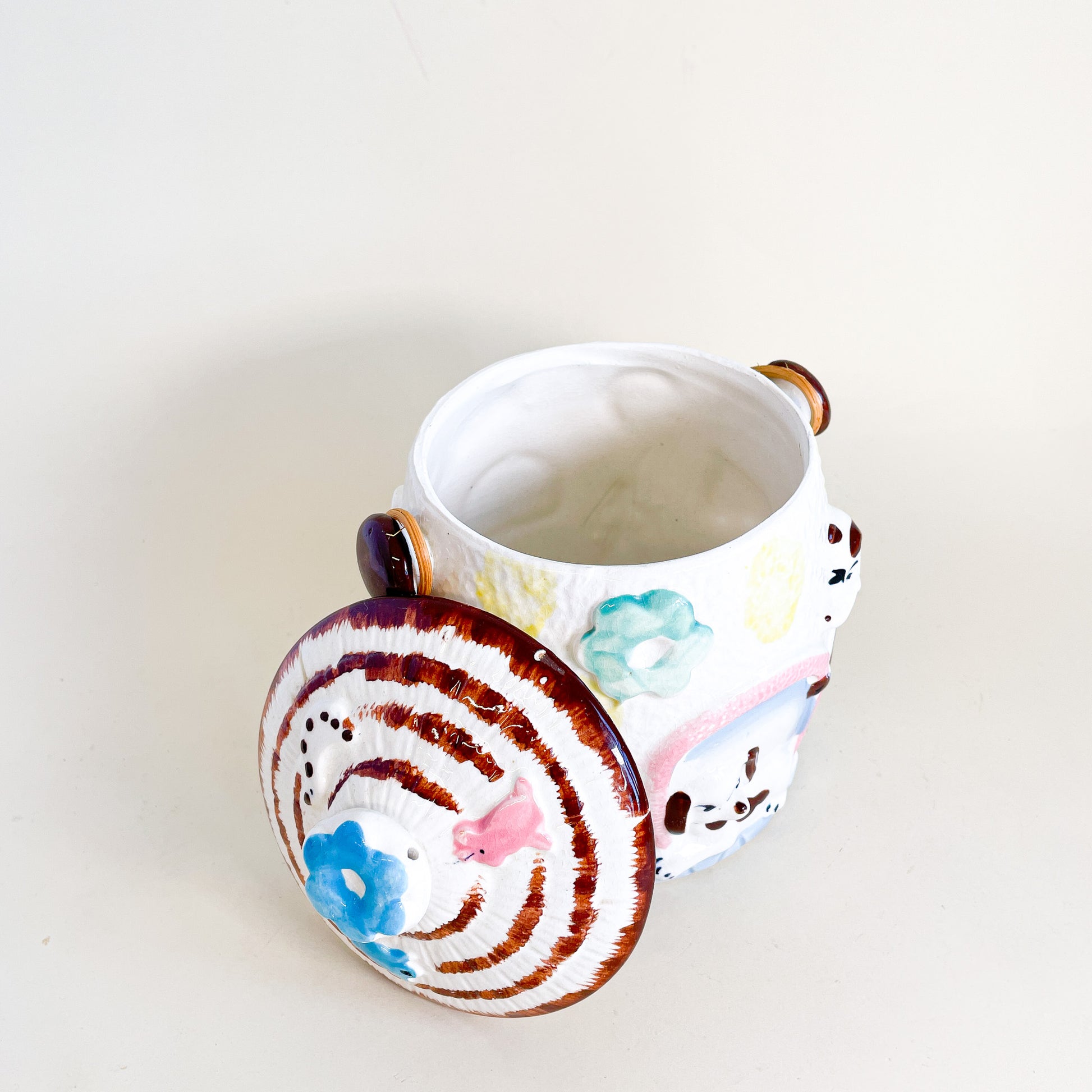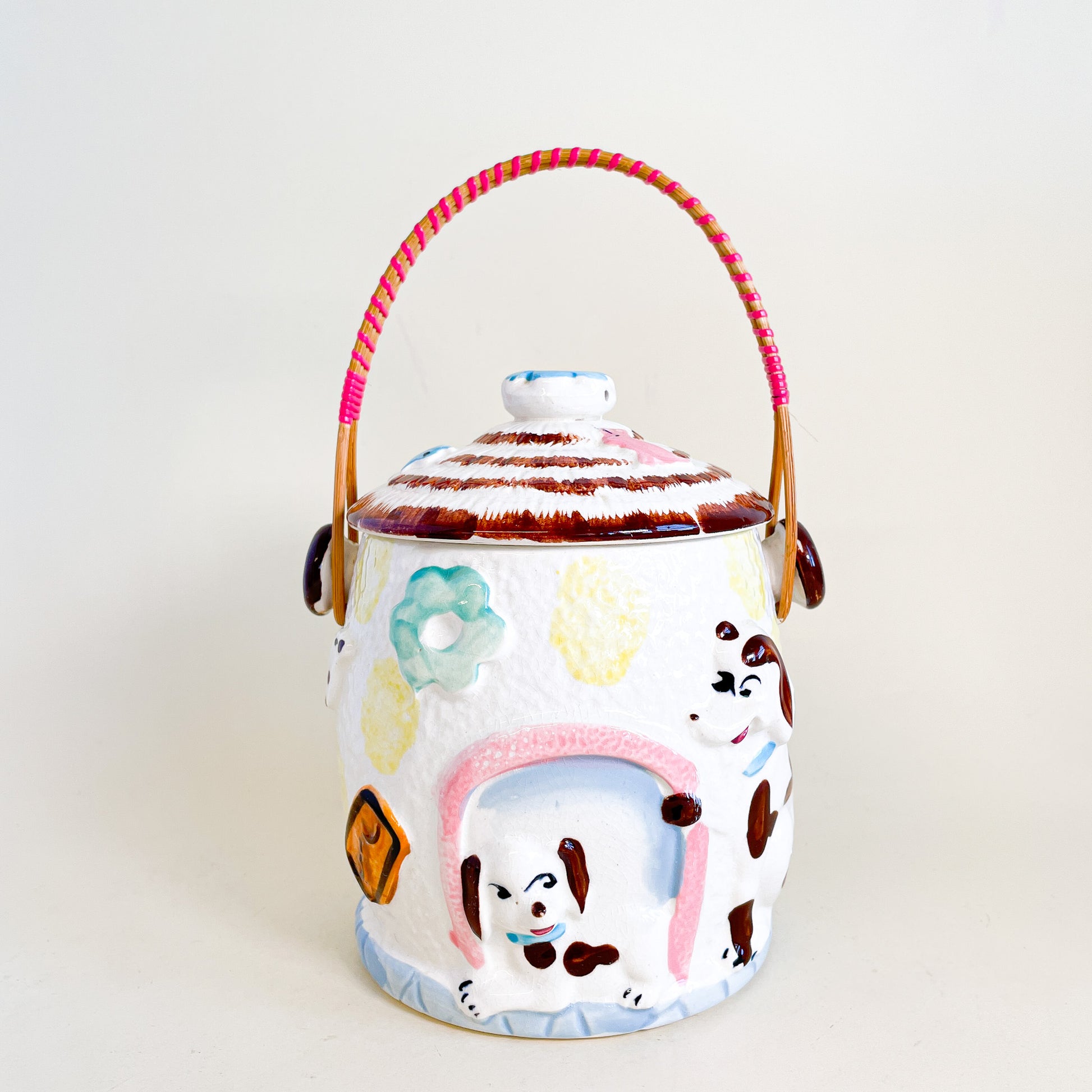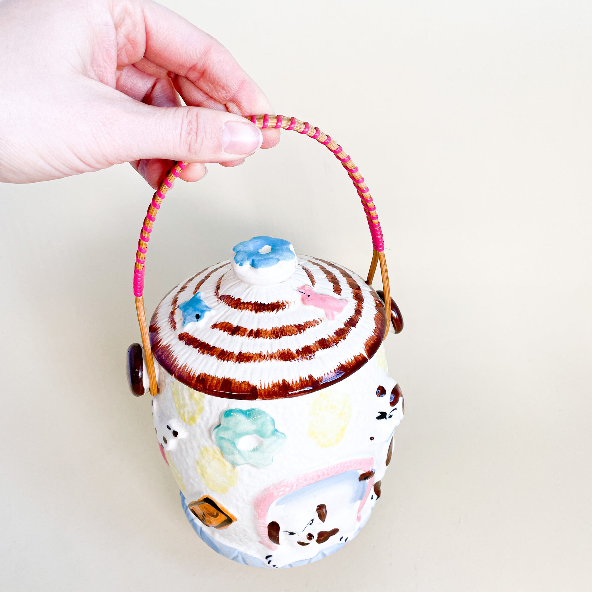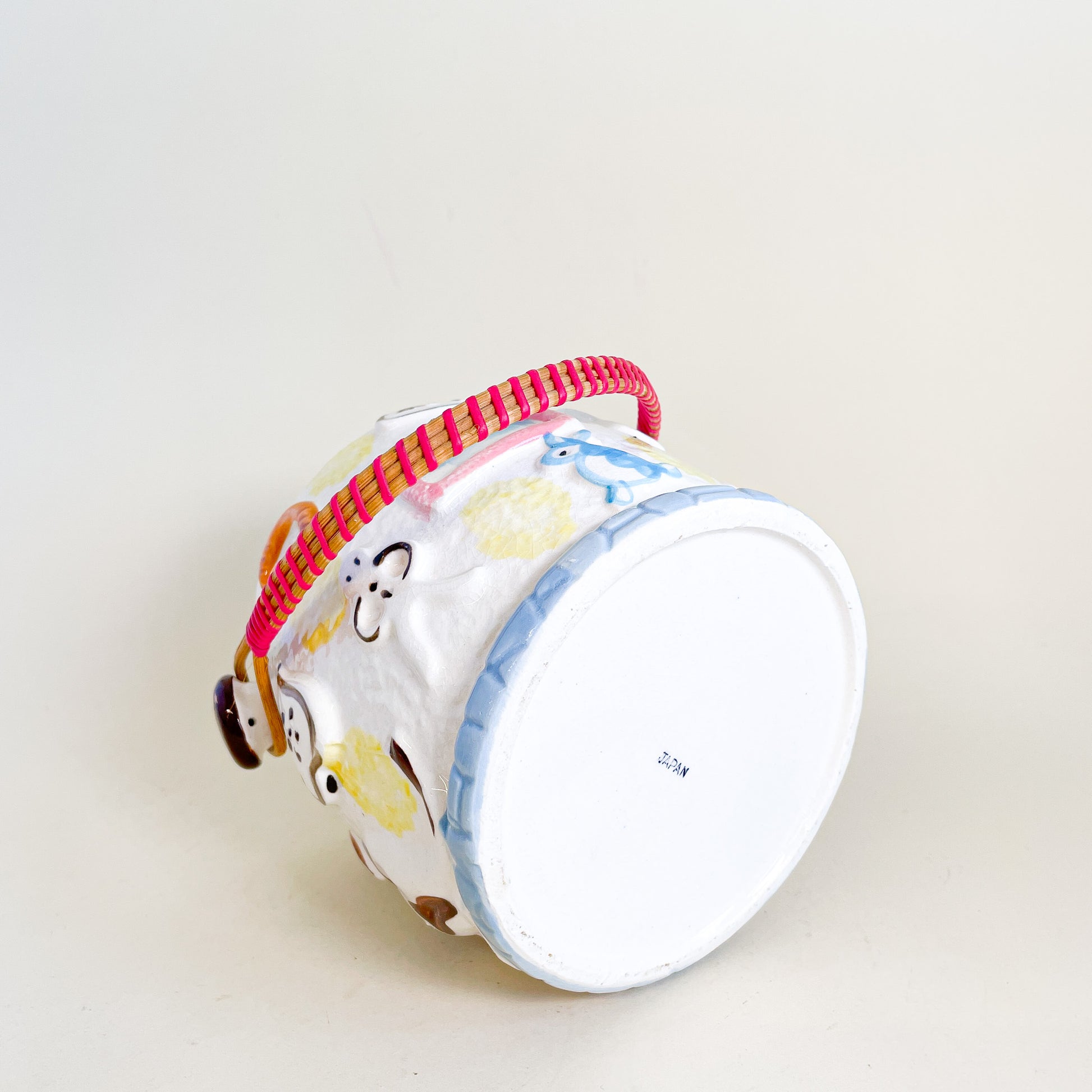 Jarre en céramique fabriquée au Japon décorée de chiens et d'autres petits animaux. Anse en bois cintré recouvert d'un fil de plastique rose.