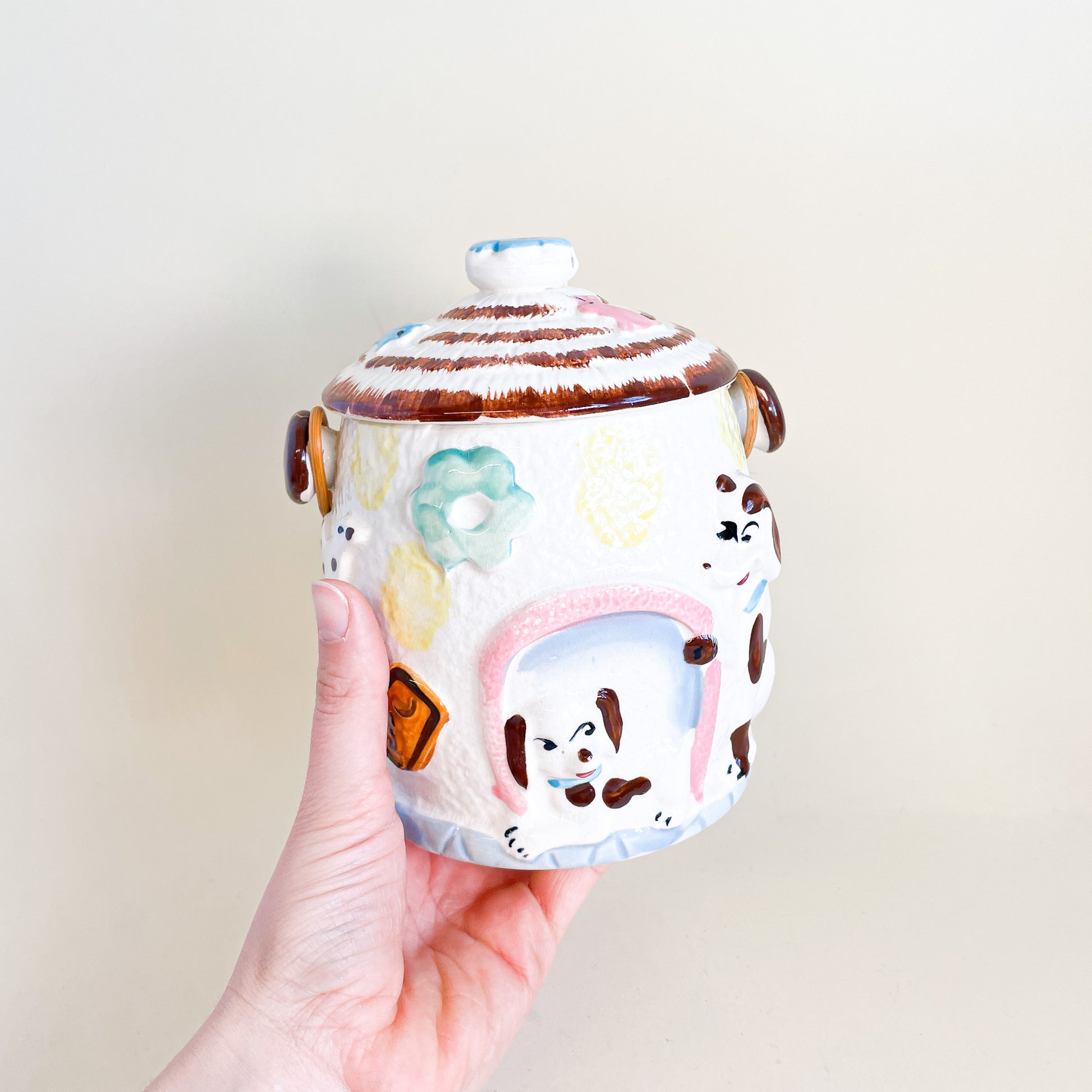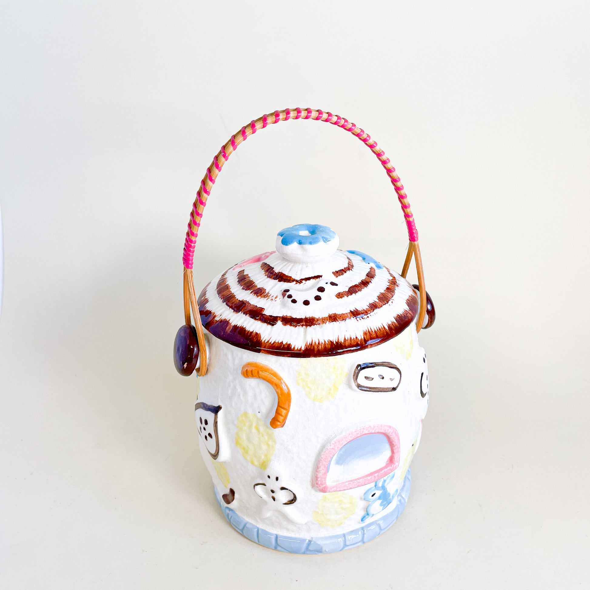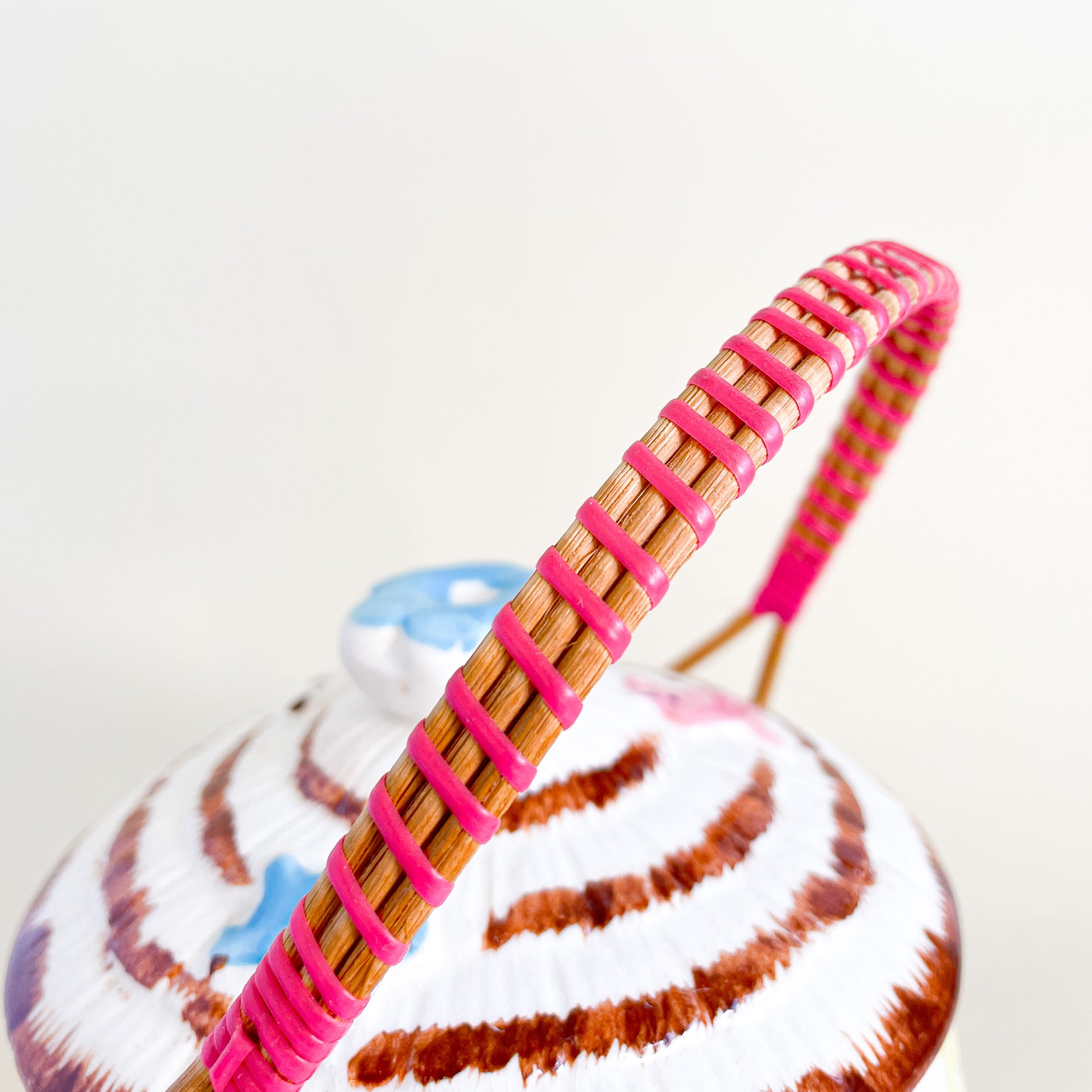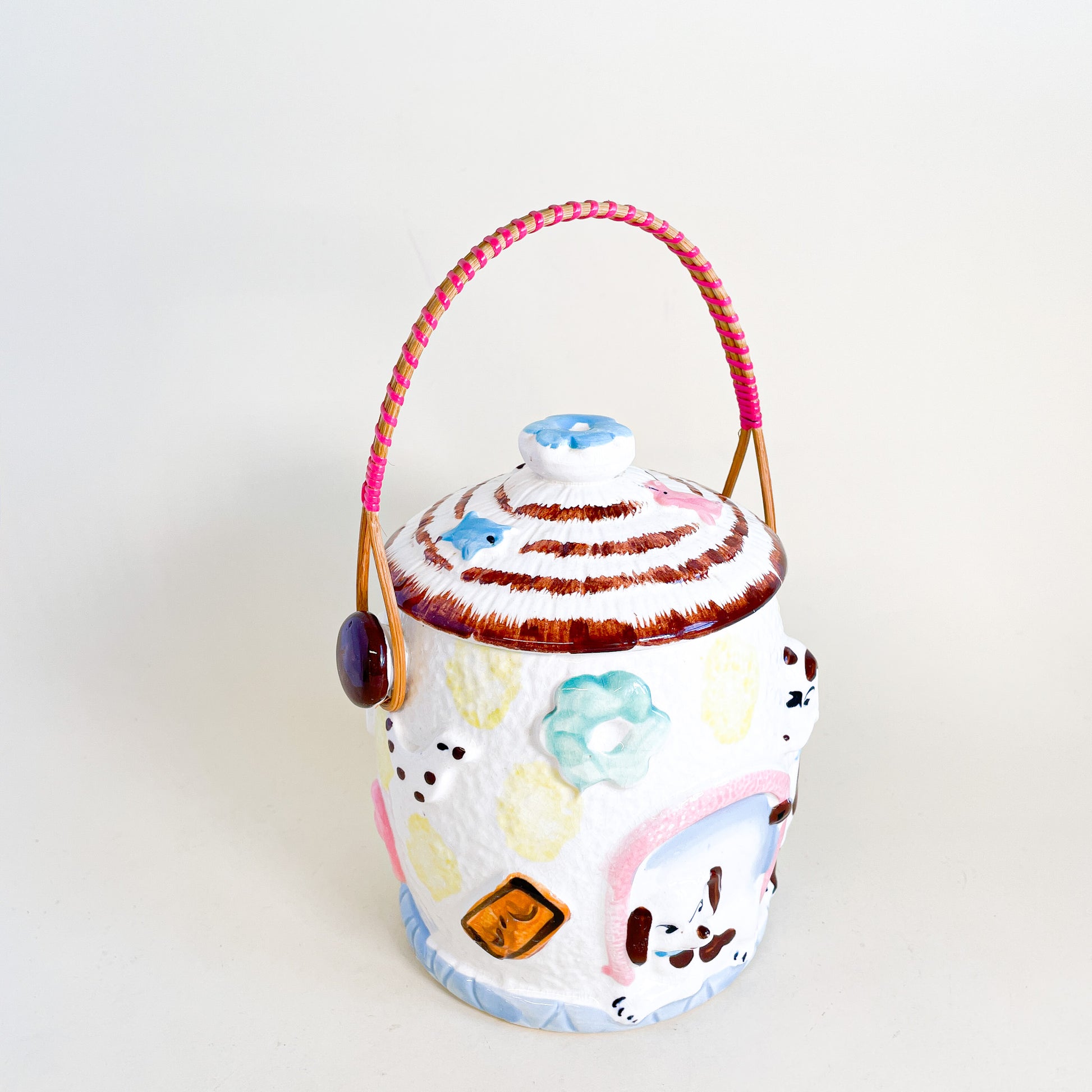Jarre en céramique fabriquée au Japon décorée de chiens et d'autres petits animaux. Anse en bois cintré recouvert d'un fil de plastique rose.