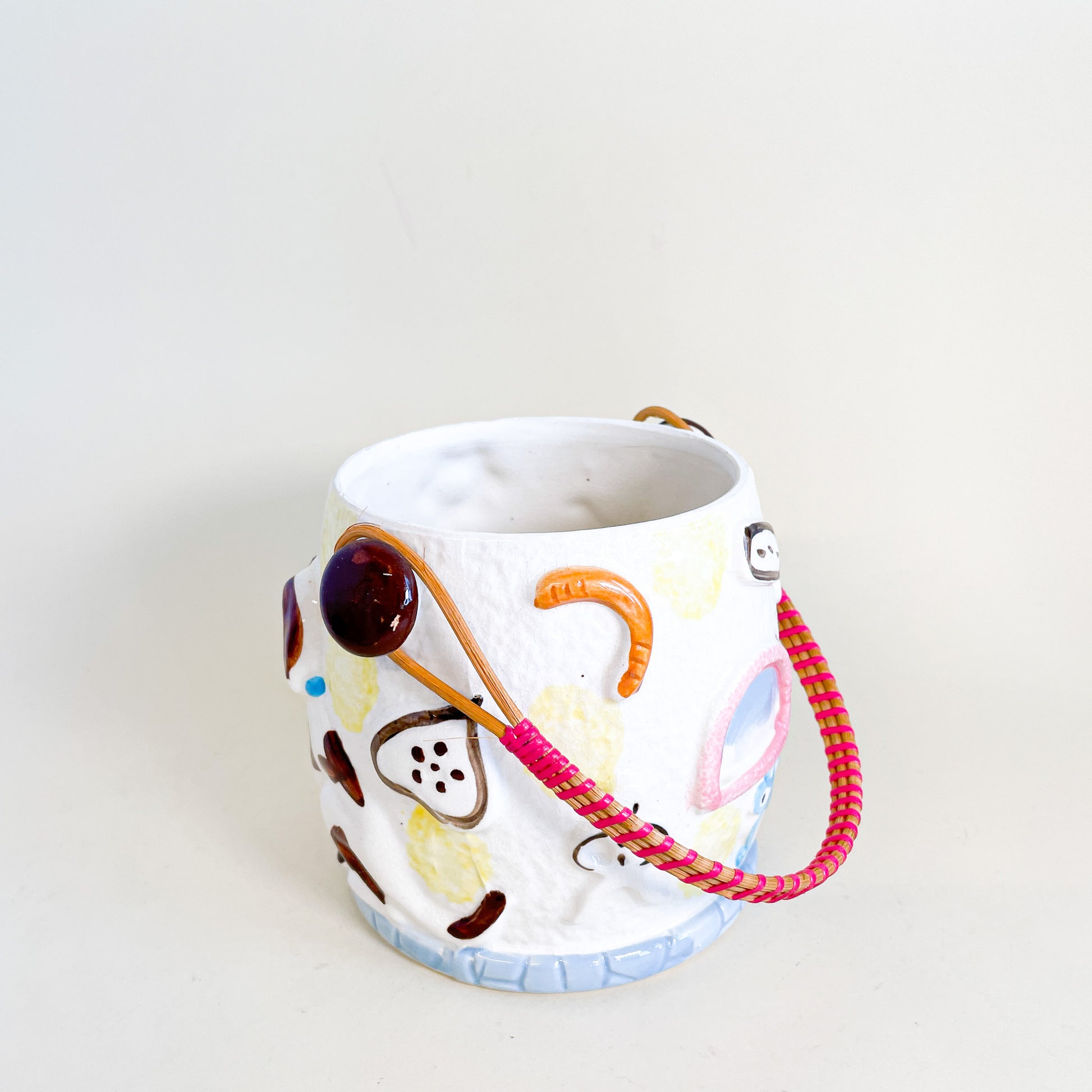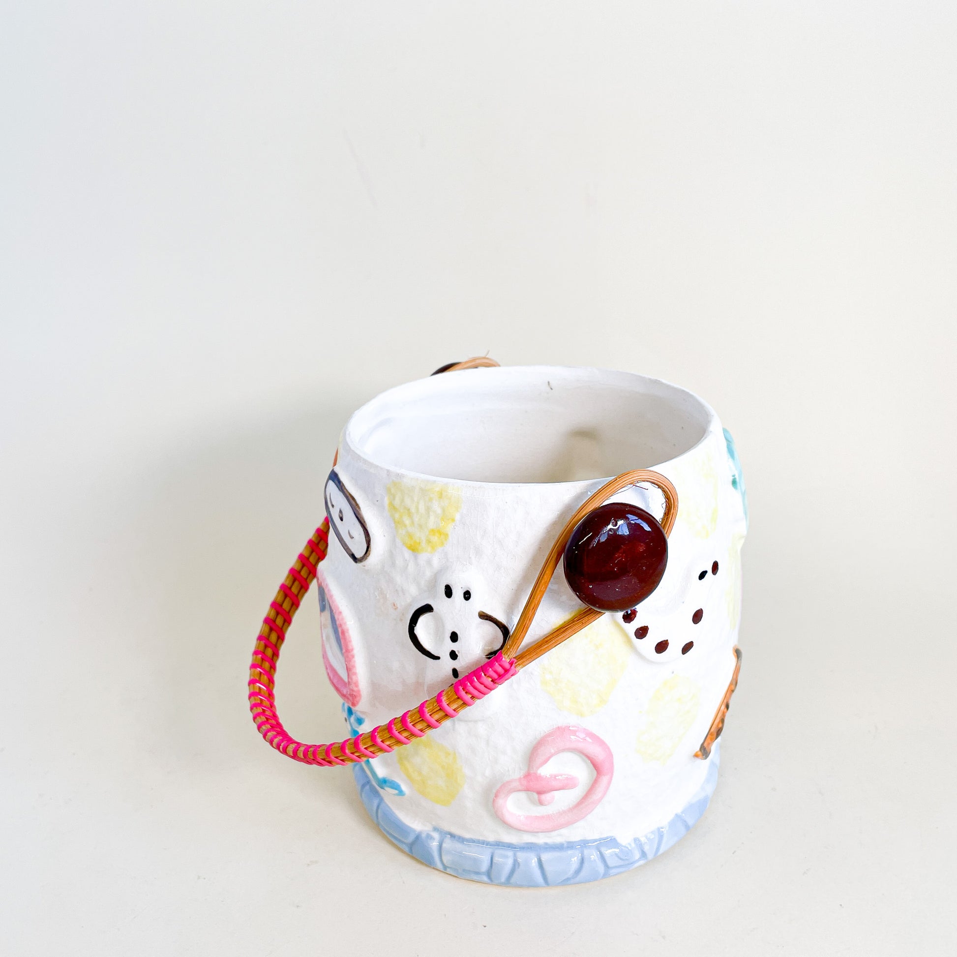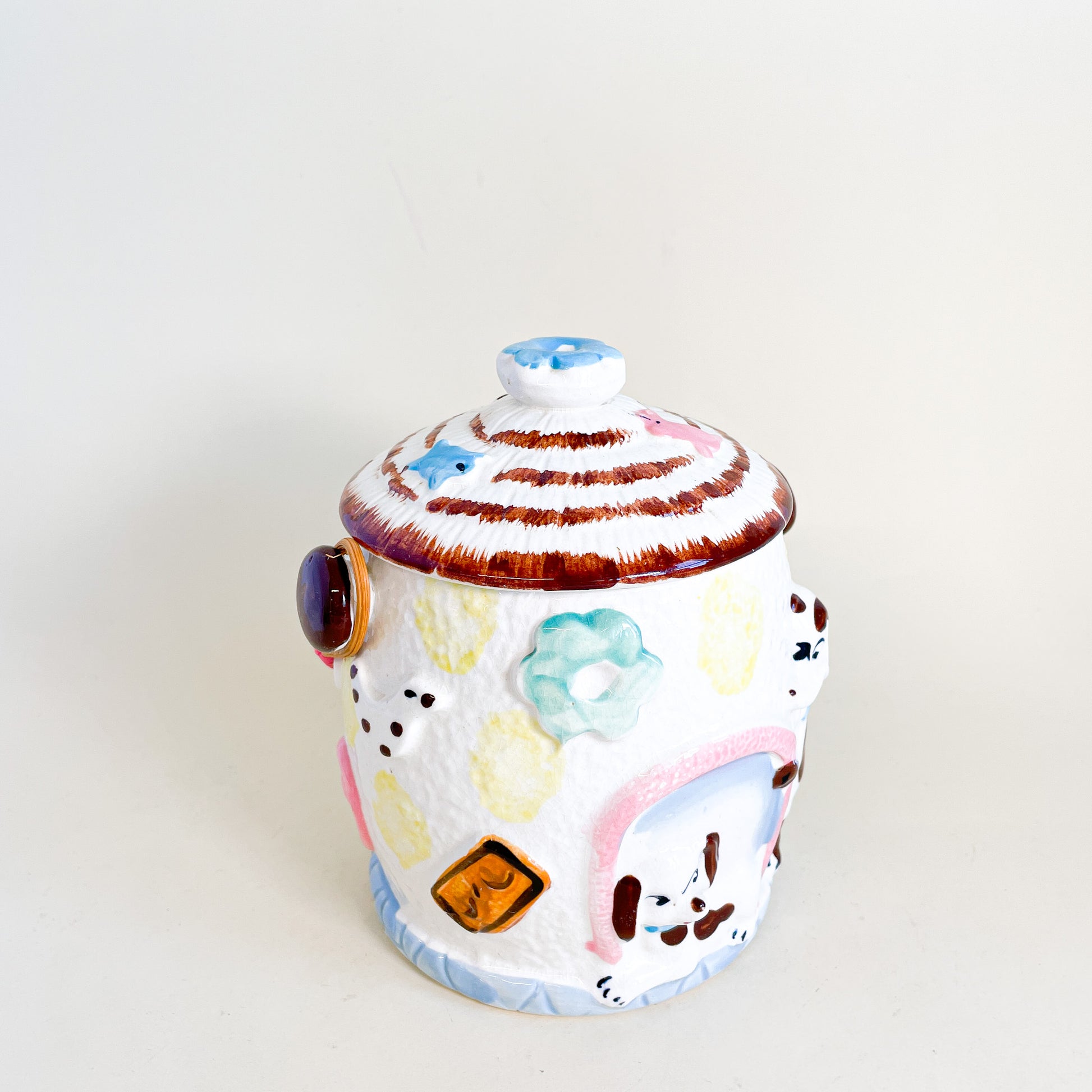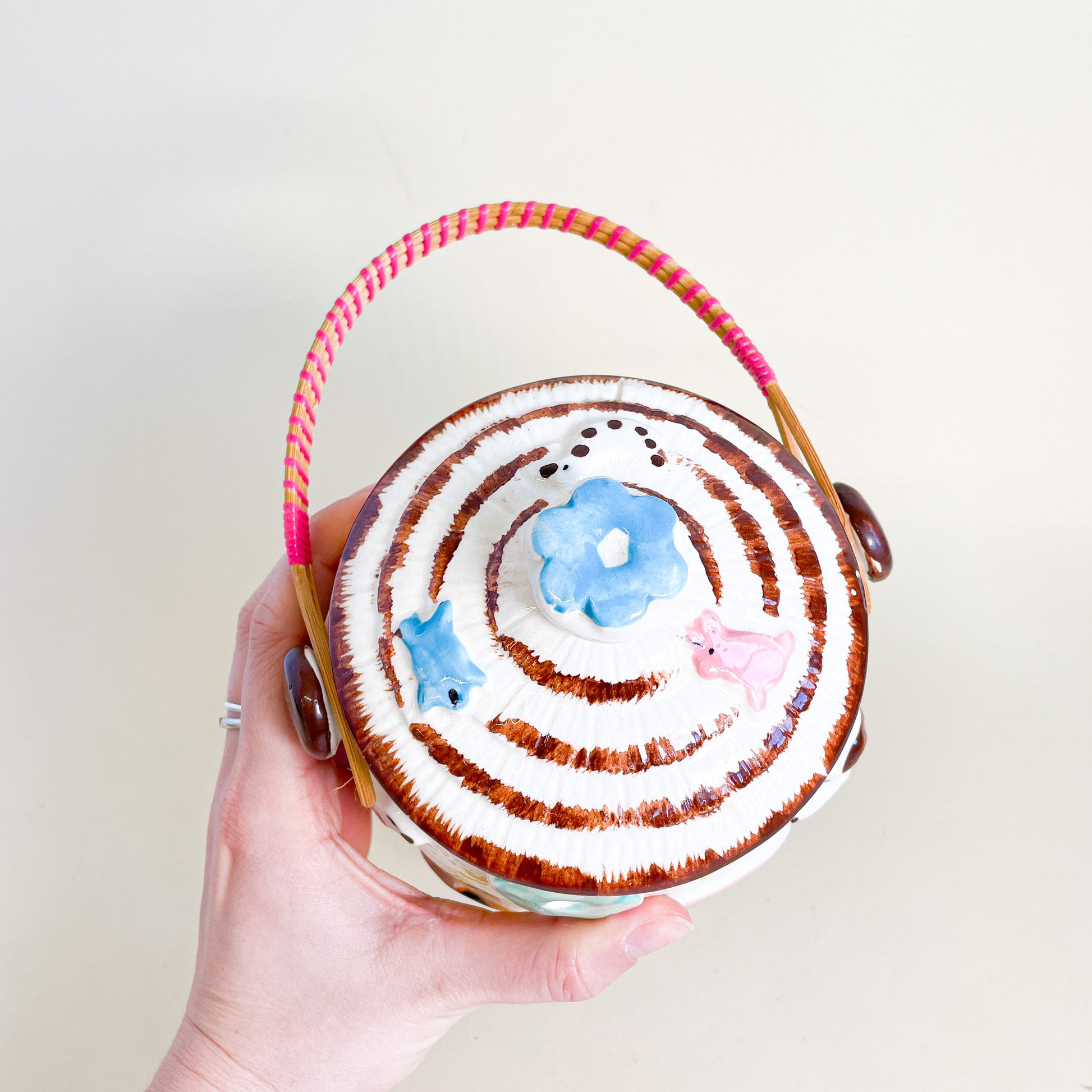 Jarre en céramique fabriquée au Japon décorée de chiens et d'autres petits animaux. Anse en bois cintré recouvert d'un fil de plastique rose.