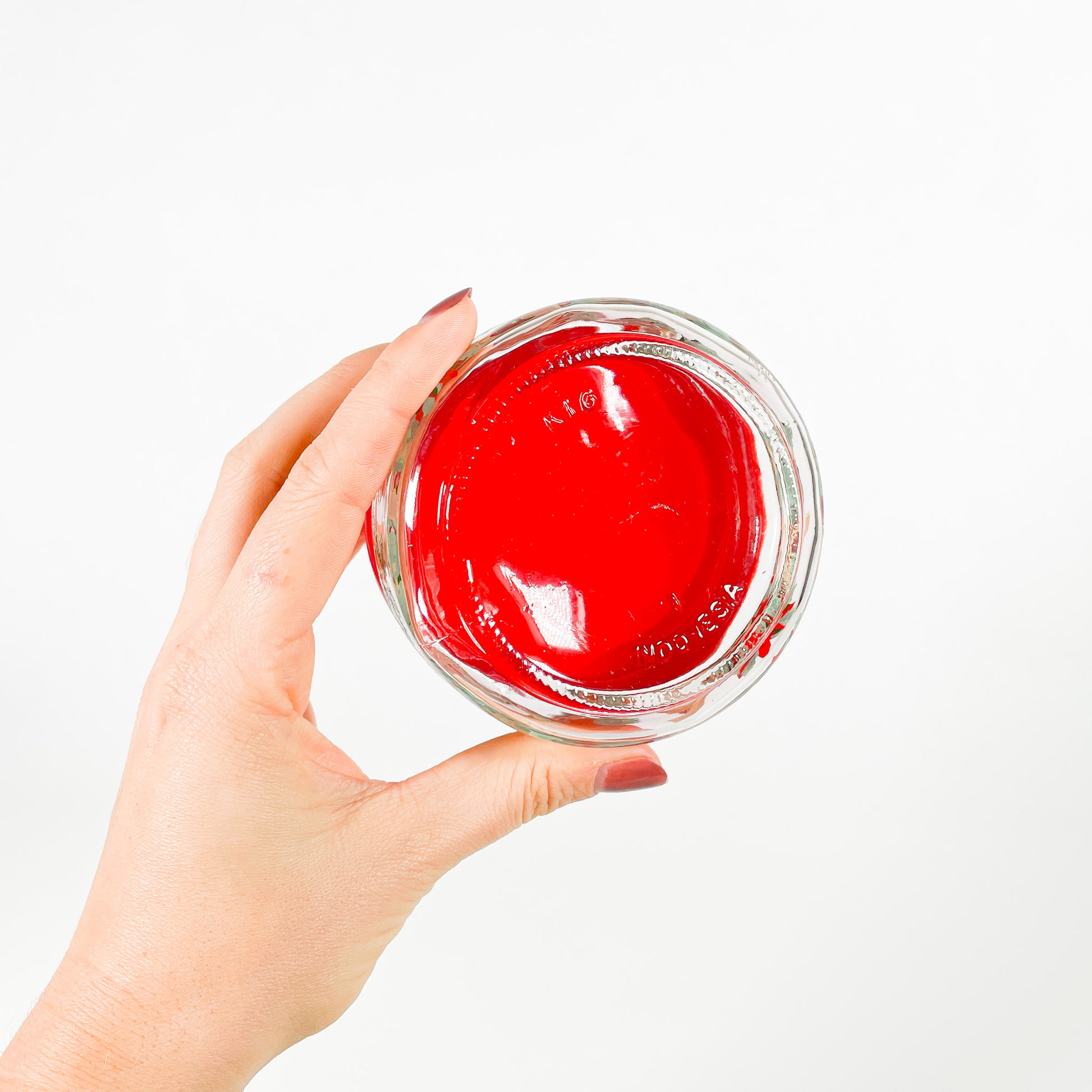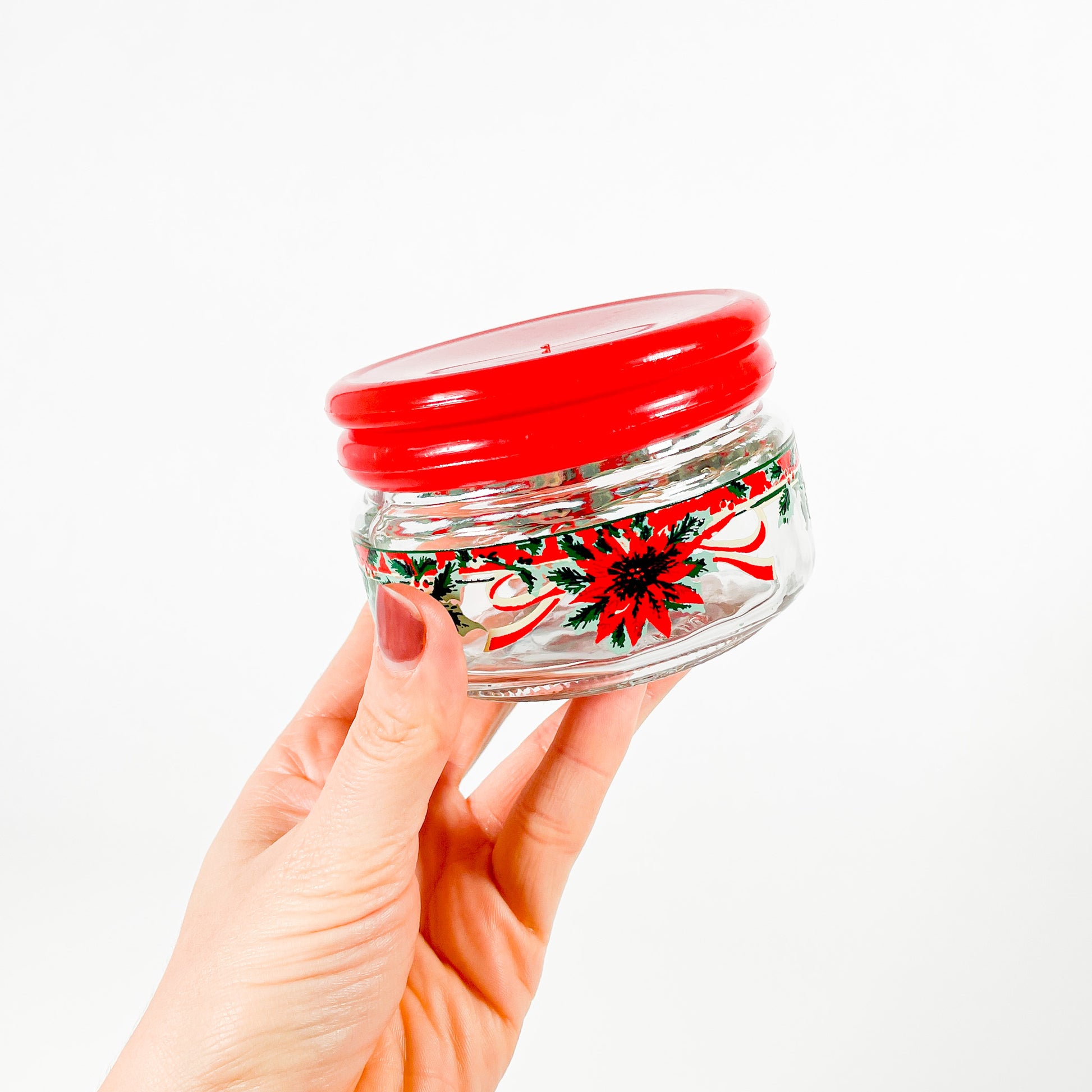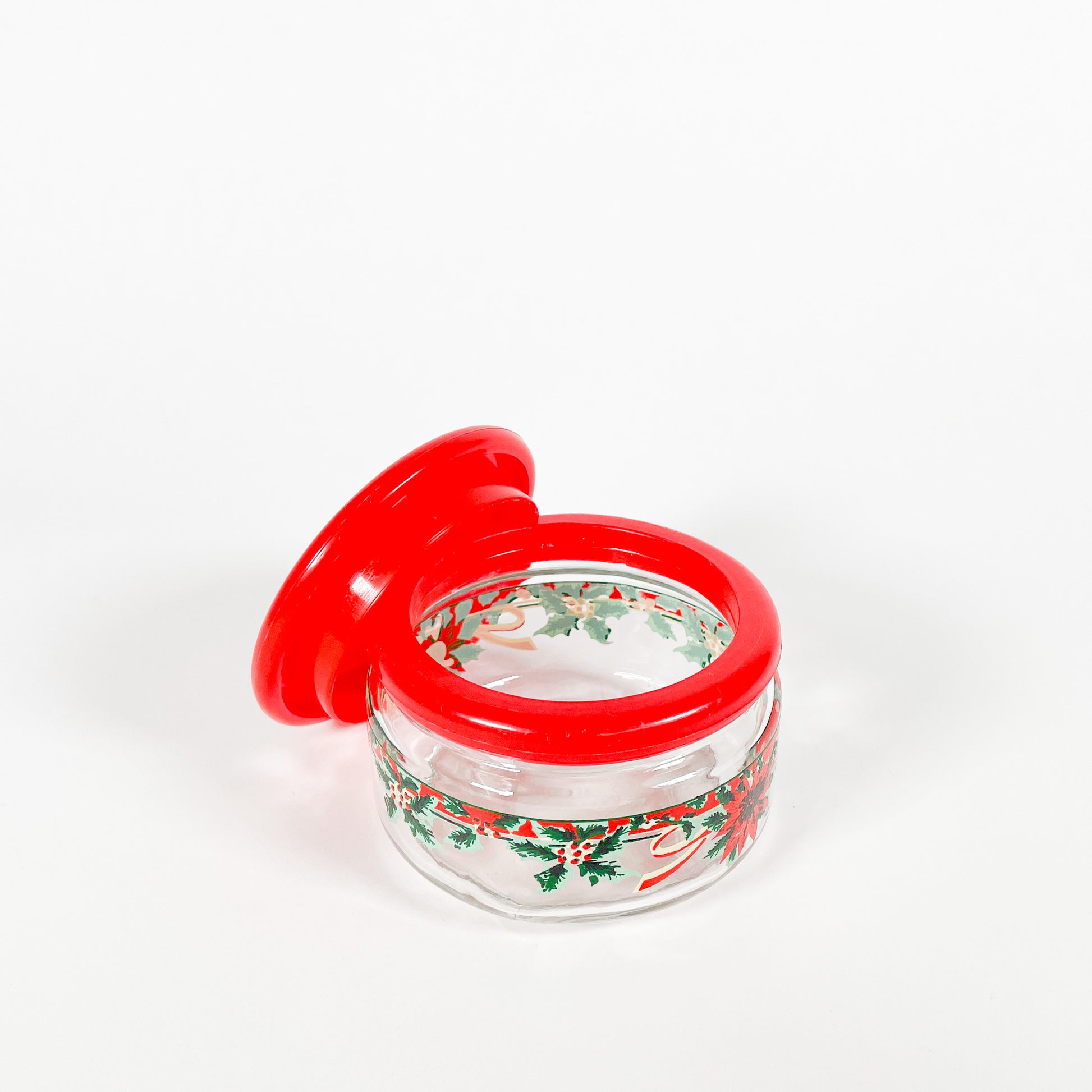 Petite jarre en verre avec couvercle en plastique rouge, fabriquées par KIG Indonesia.