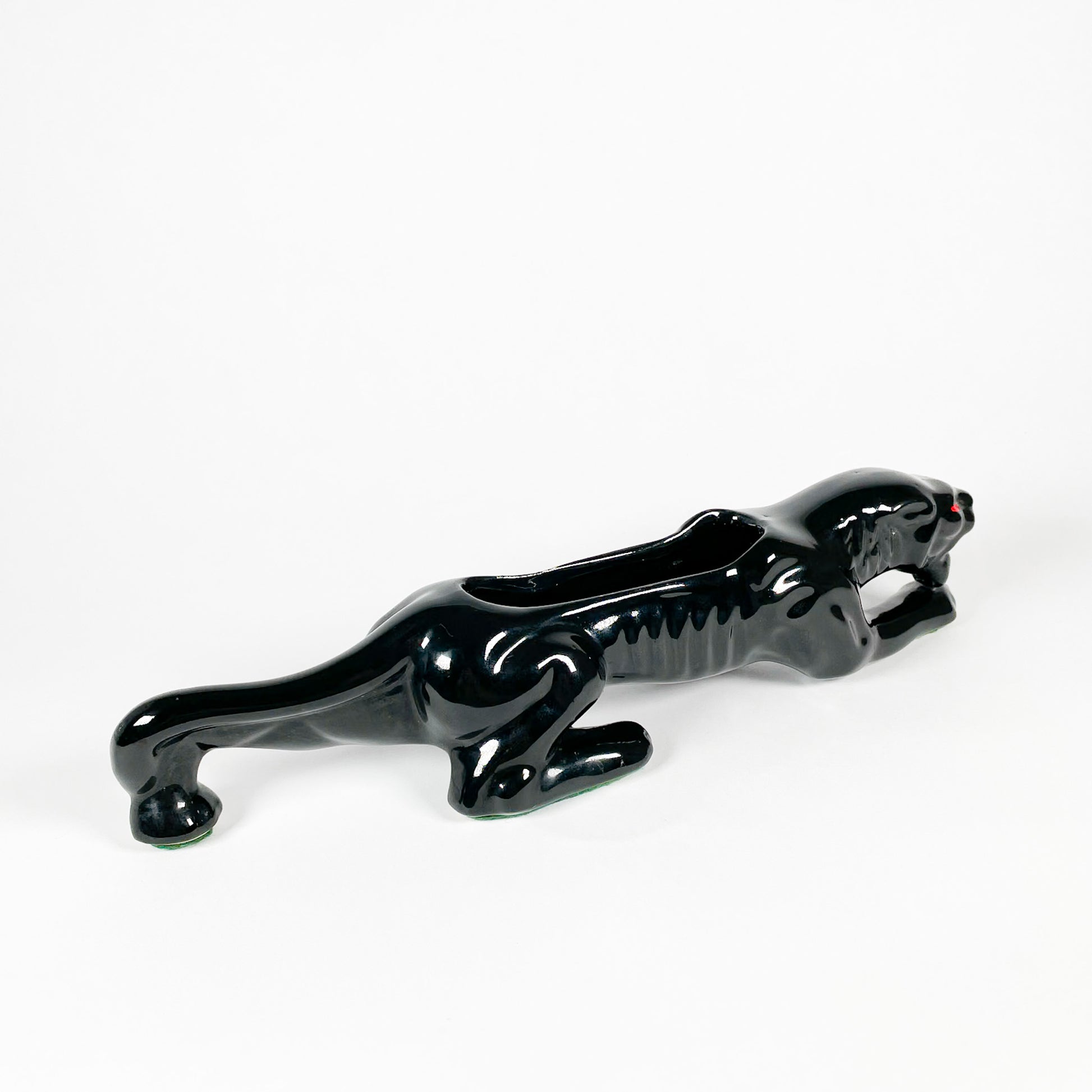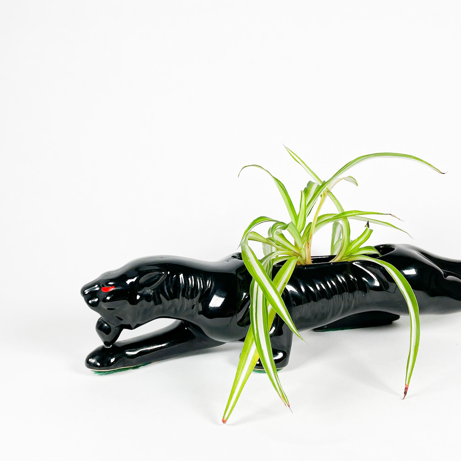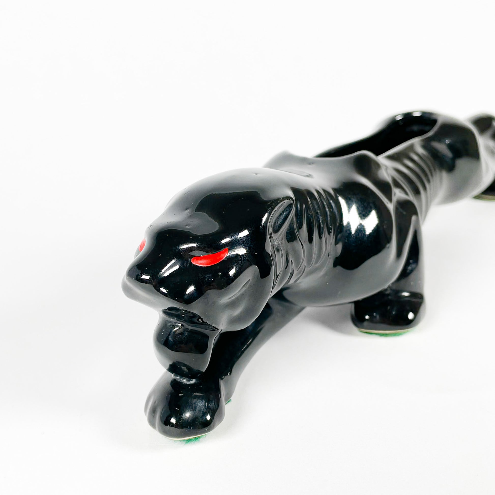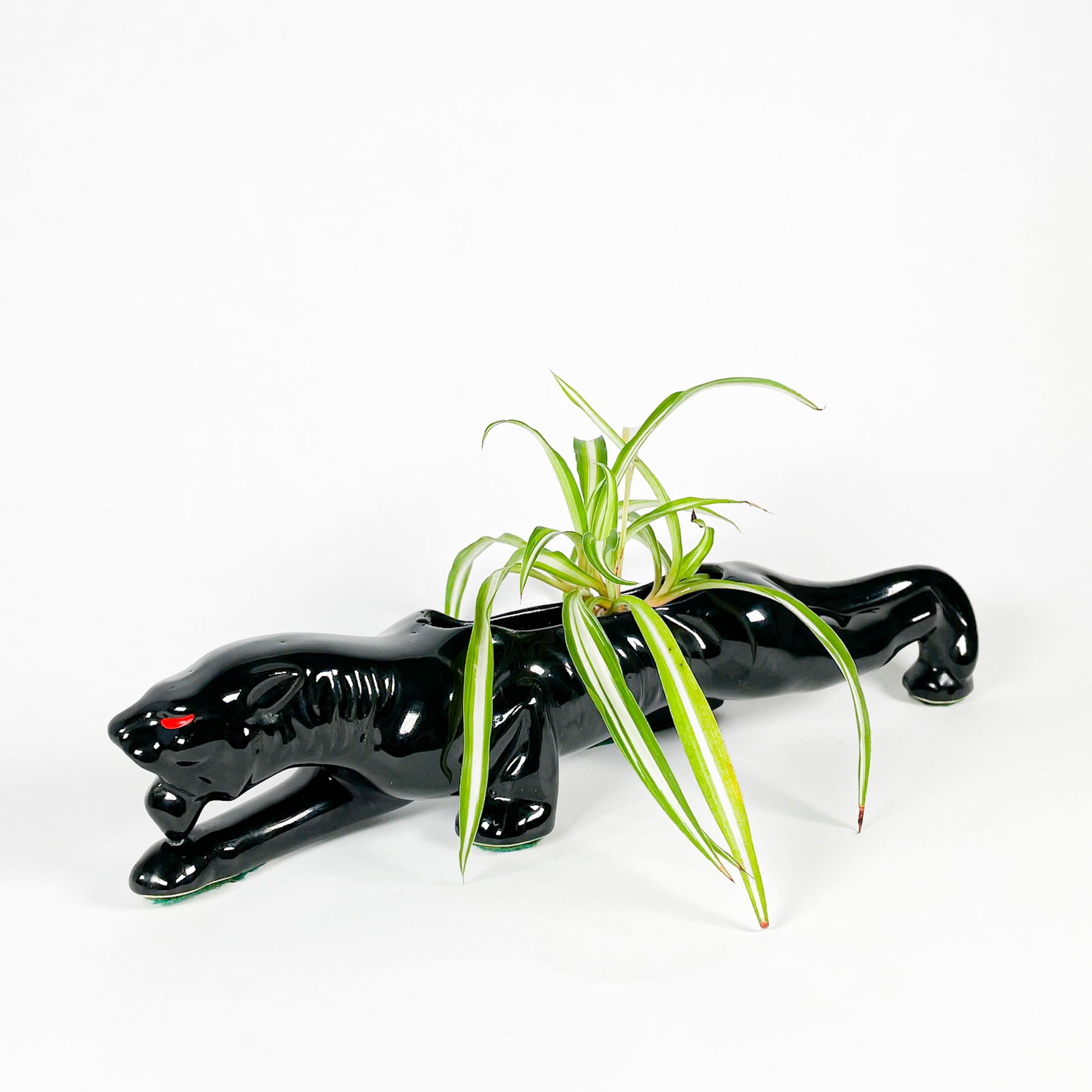 Panthère en céramique noire avec yeux rouges peints à la main. Il y a un trou au centre pour y mettre une petite plante ou des boutures.