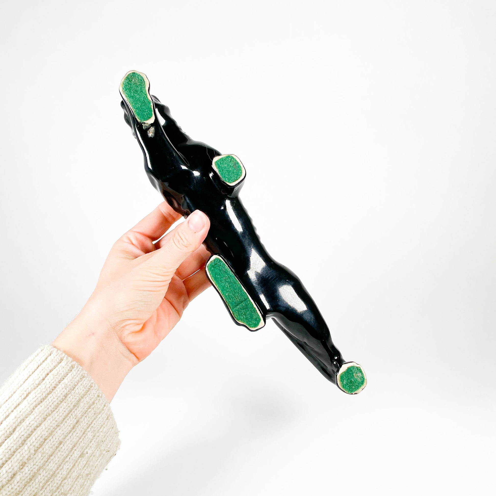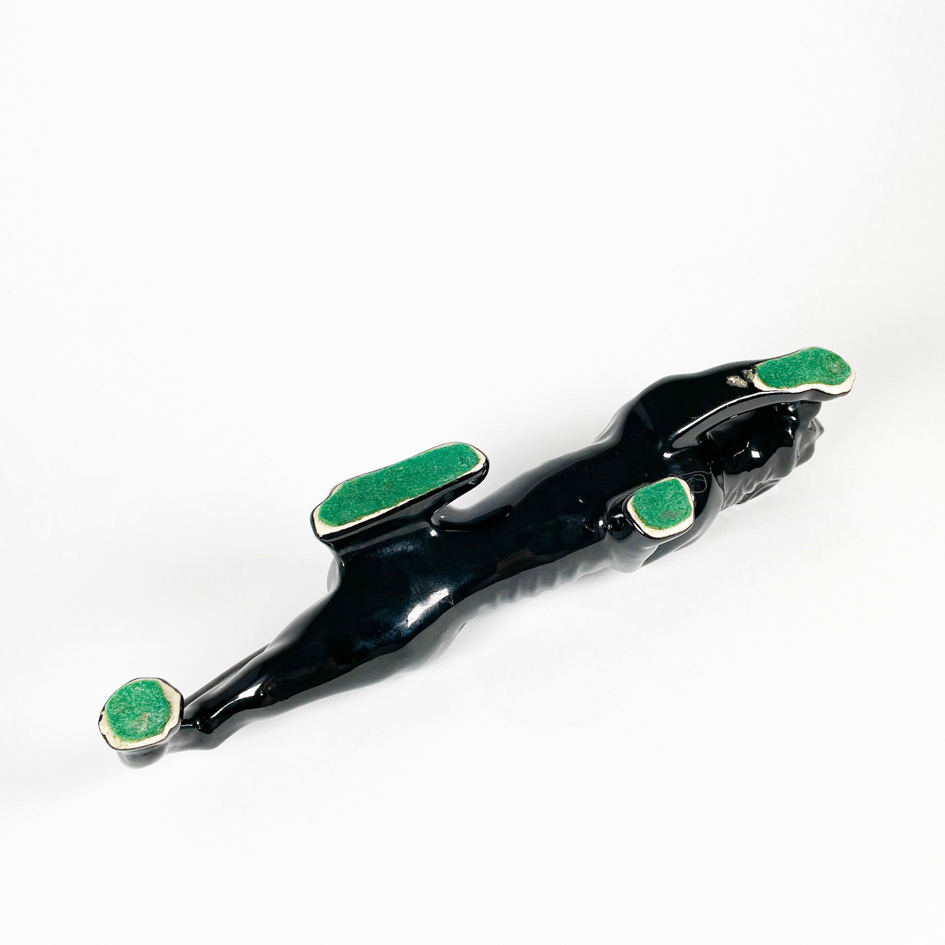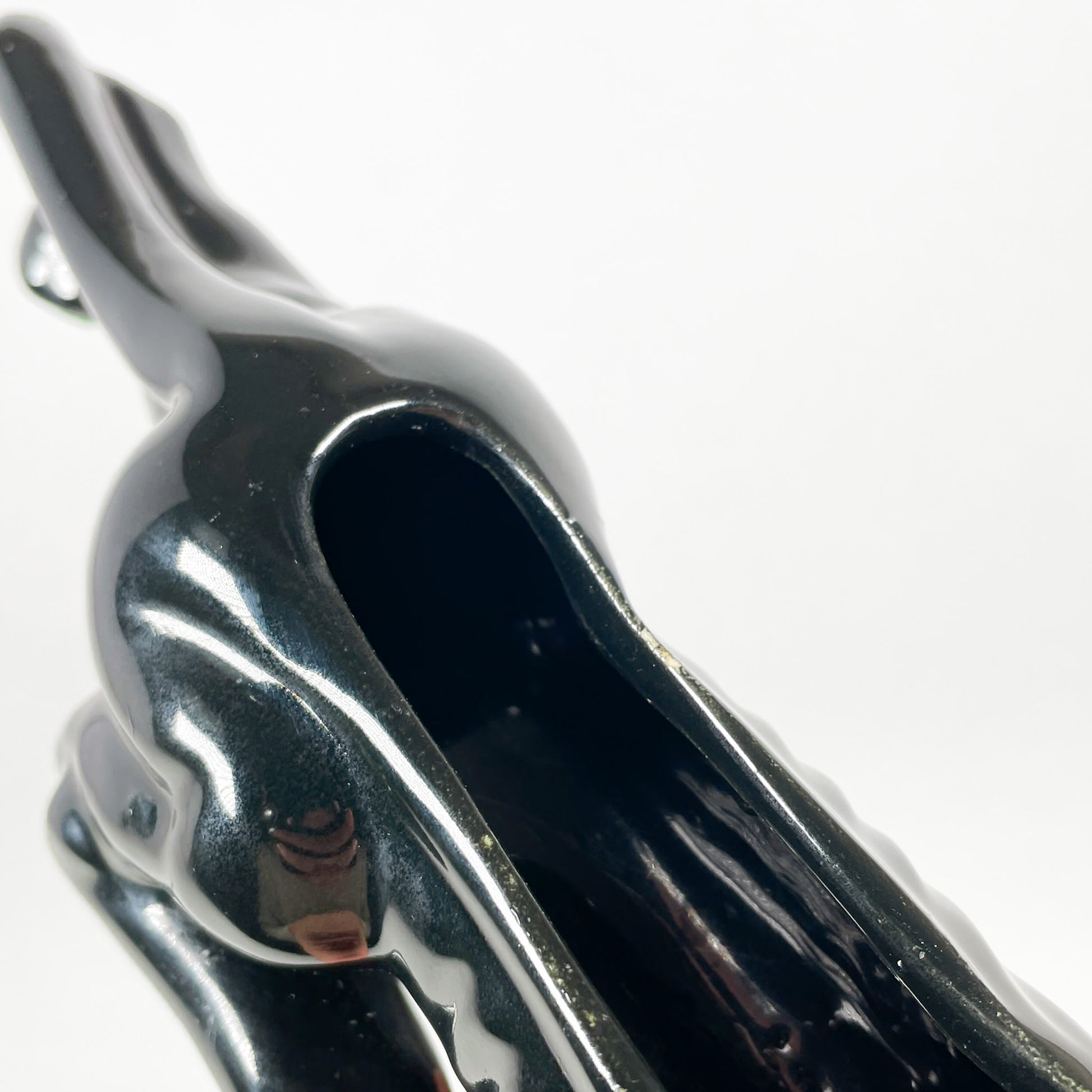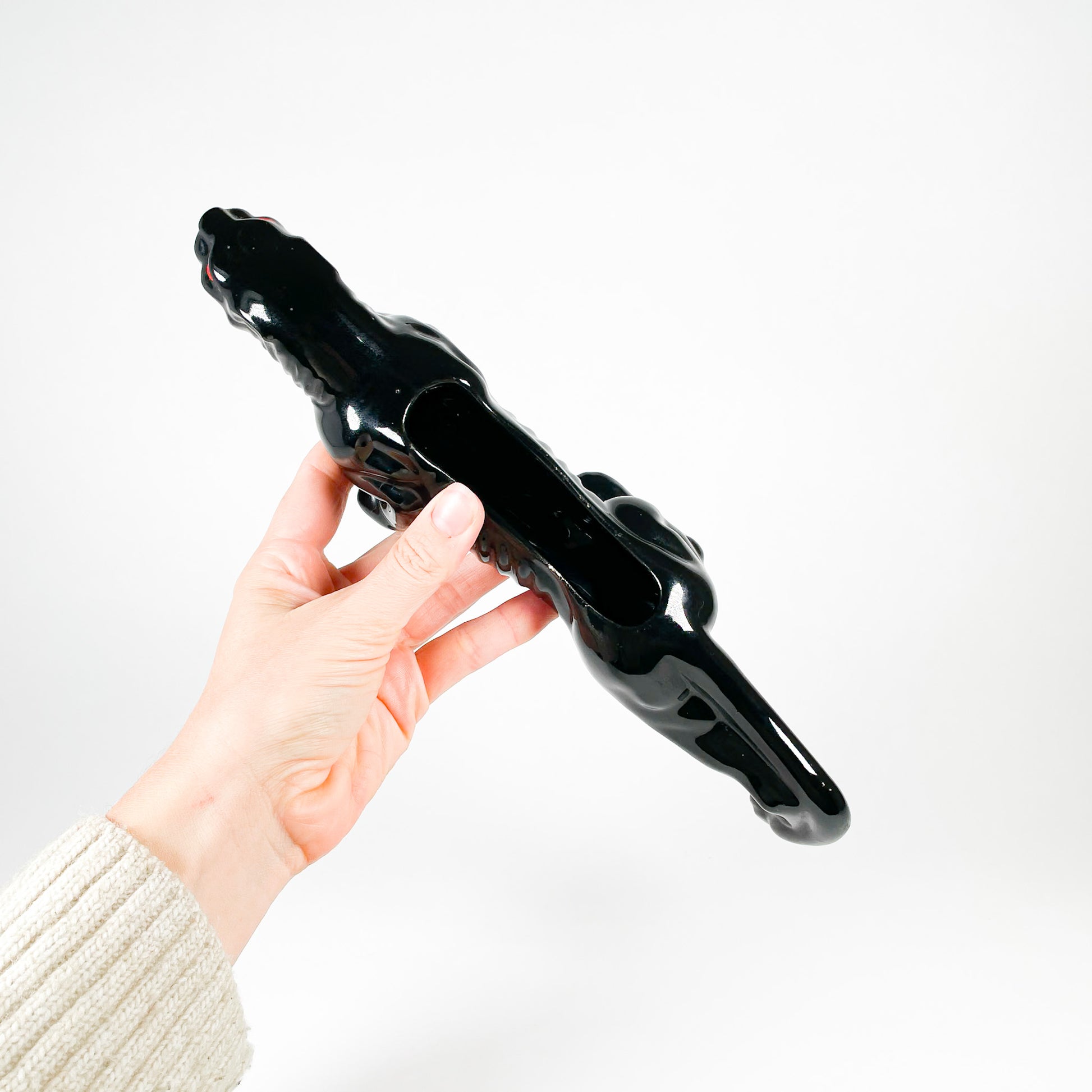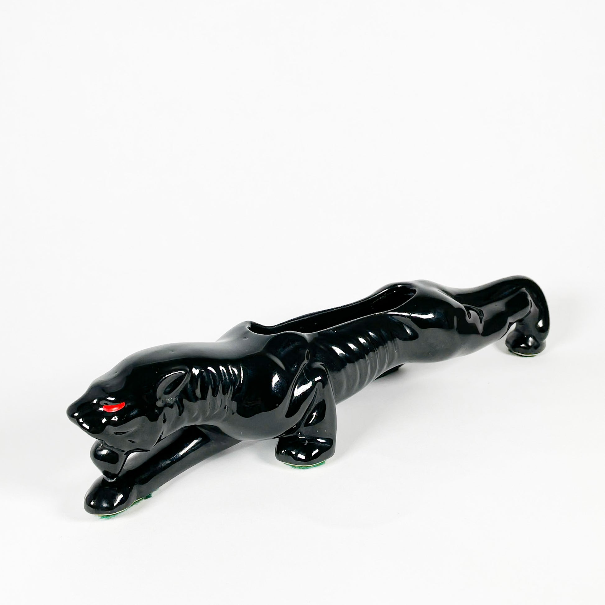 Panthère en céramique noire avec yeux rouges peints à la main. Il y a un trou au centre pour y mettre une petite plante ou des boutures.