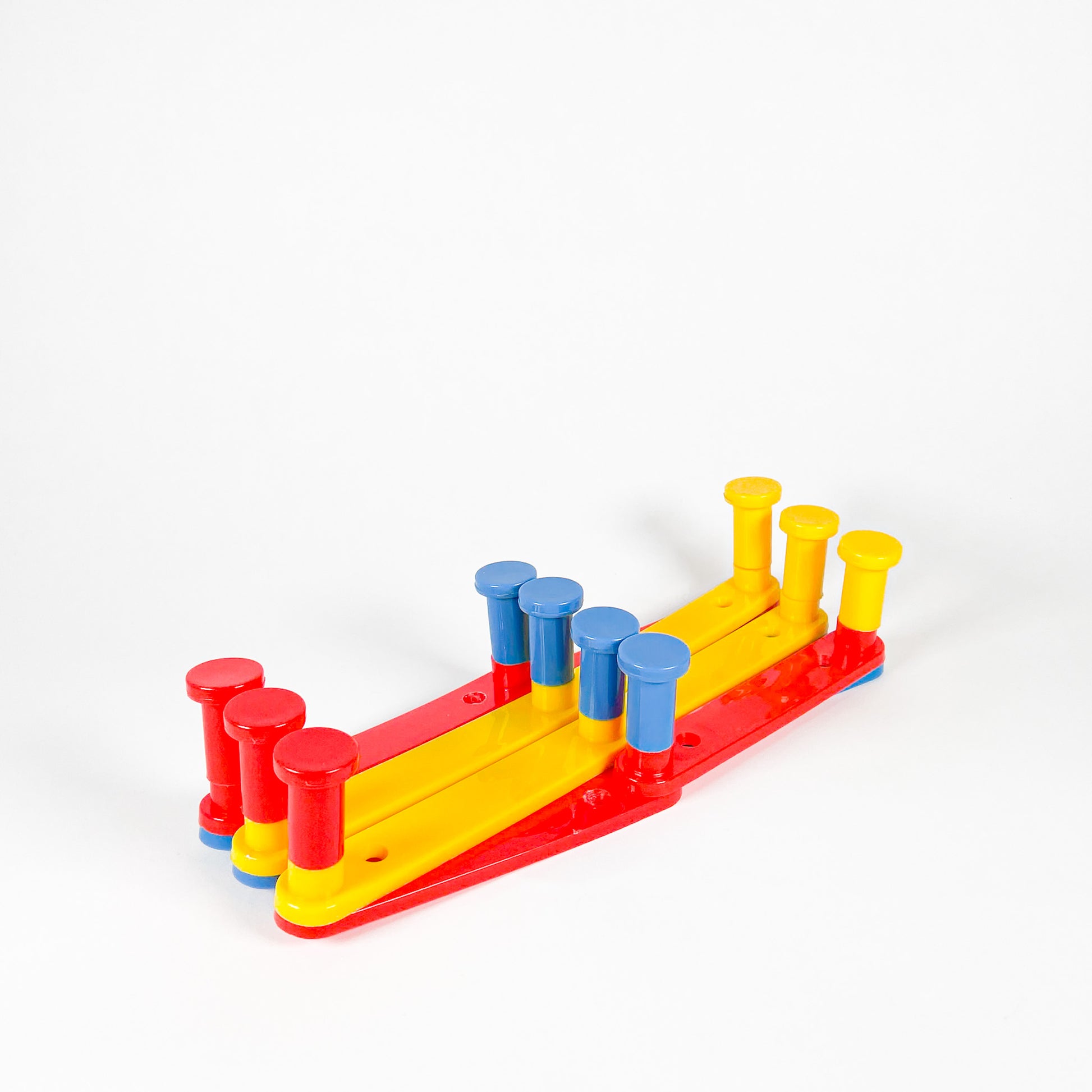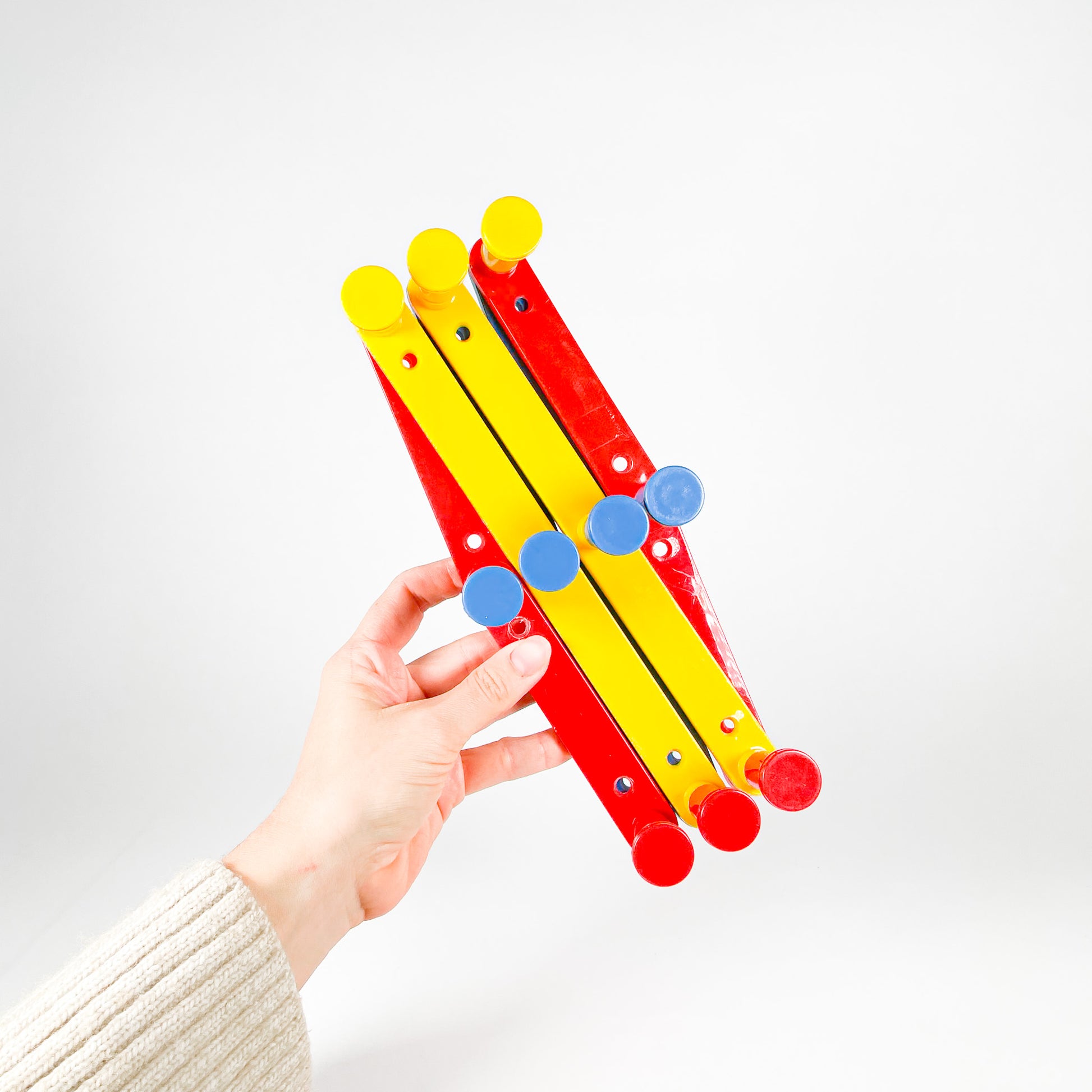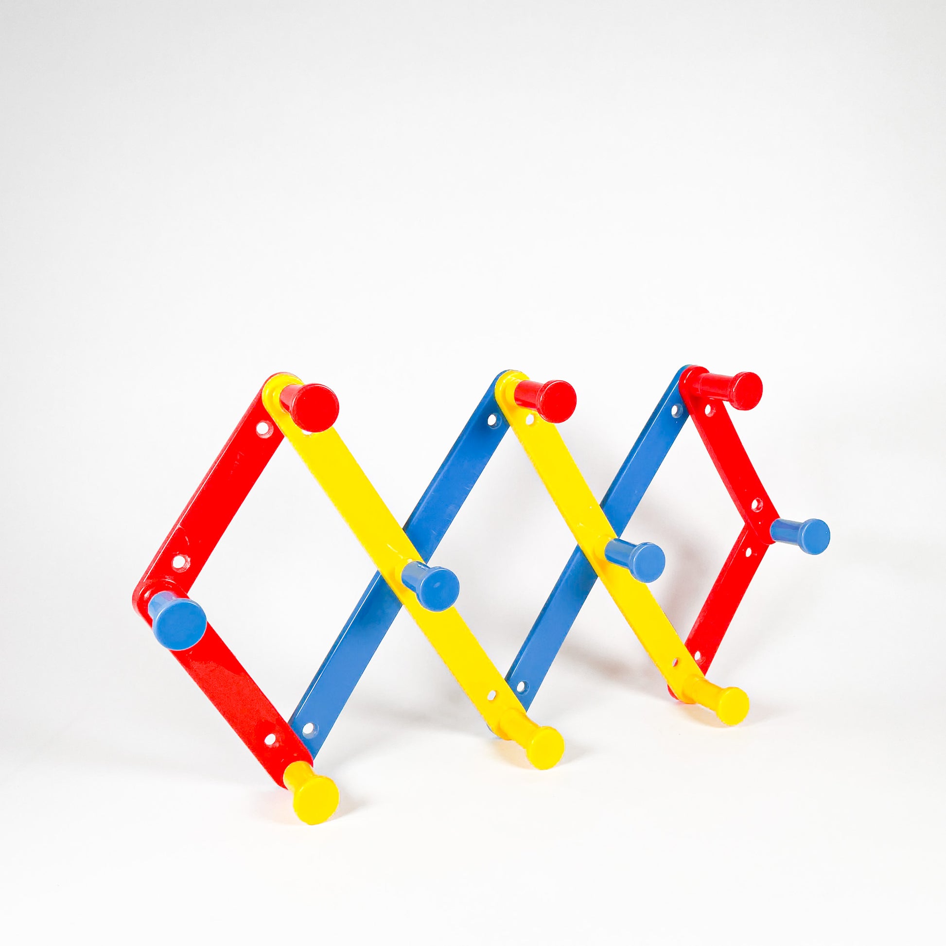 Patère accordéon 90s en plastique jaune, bleu et rouge.