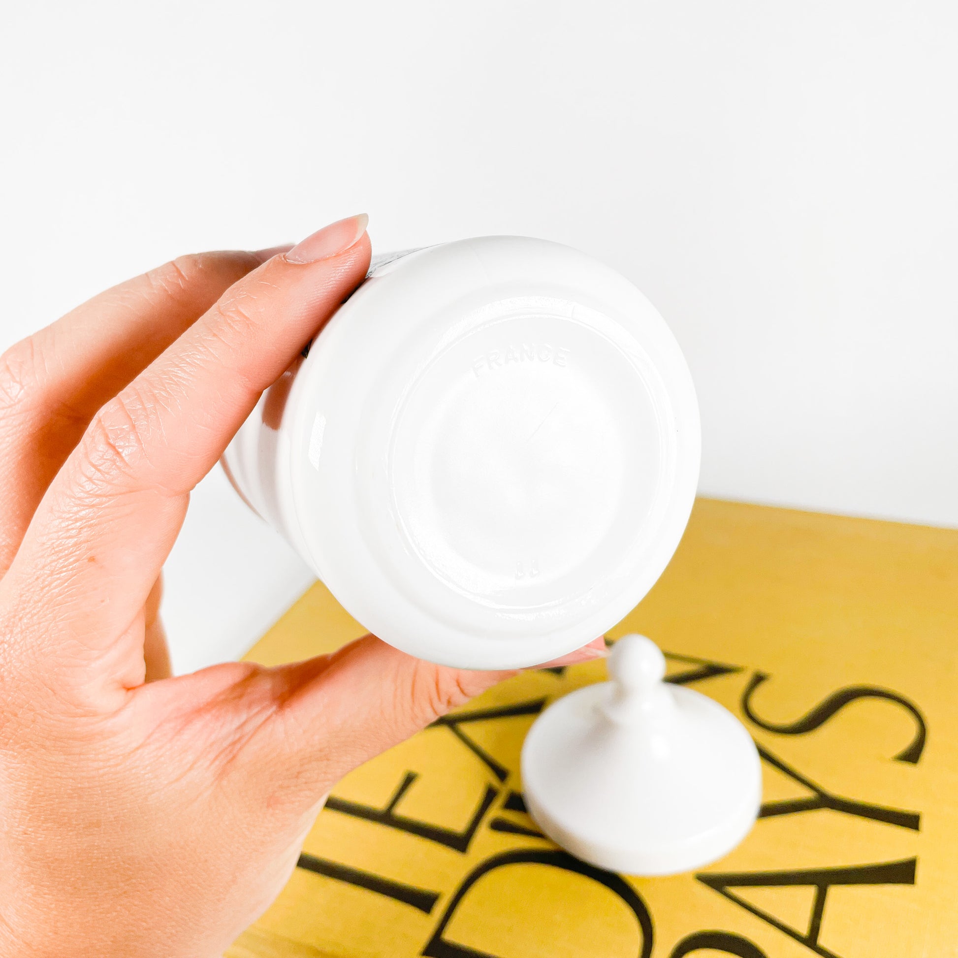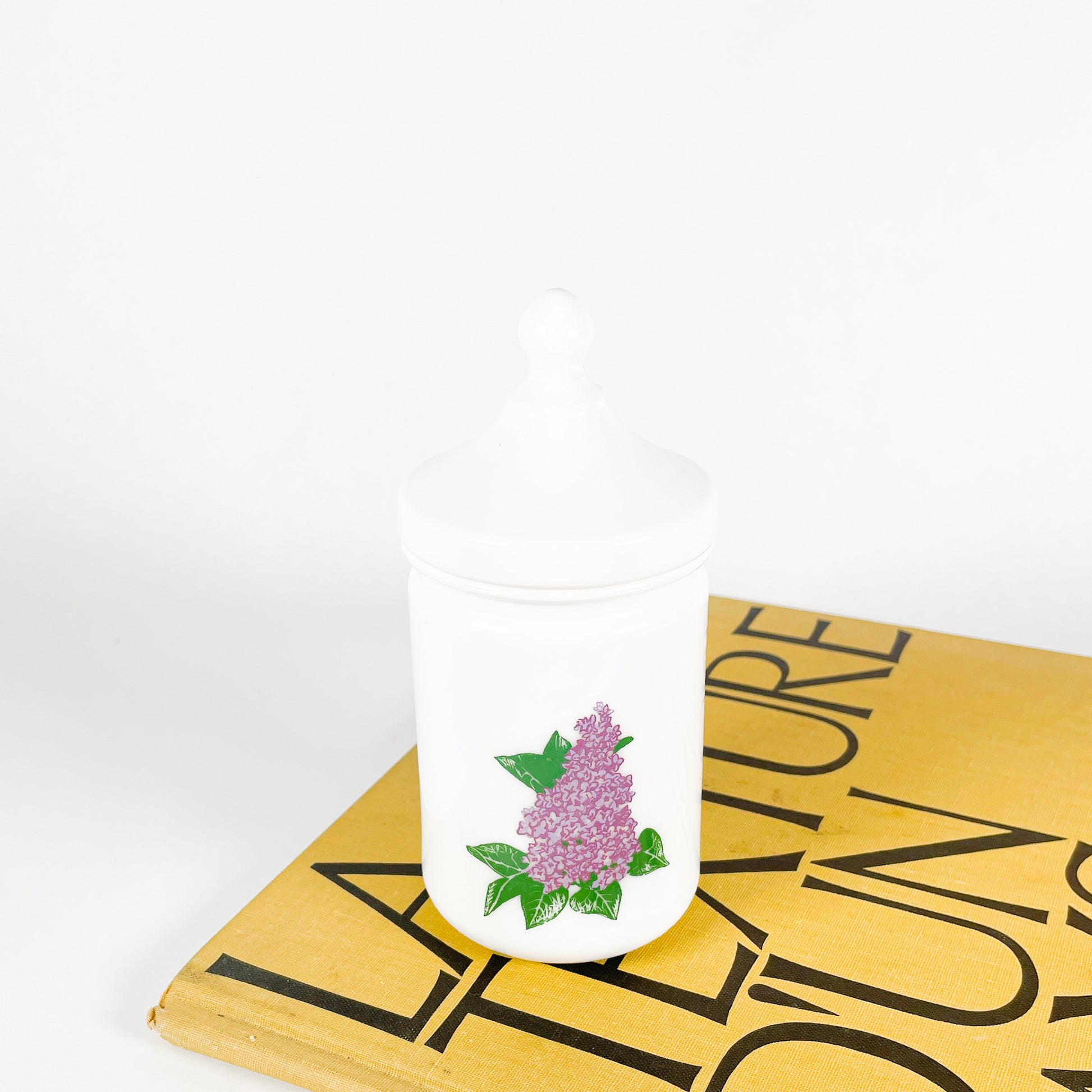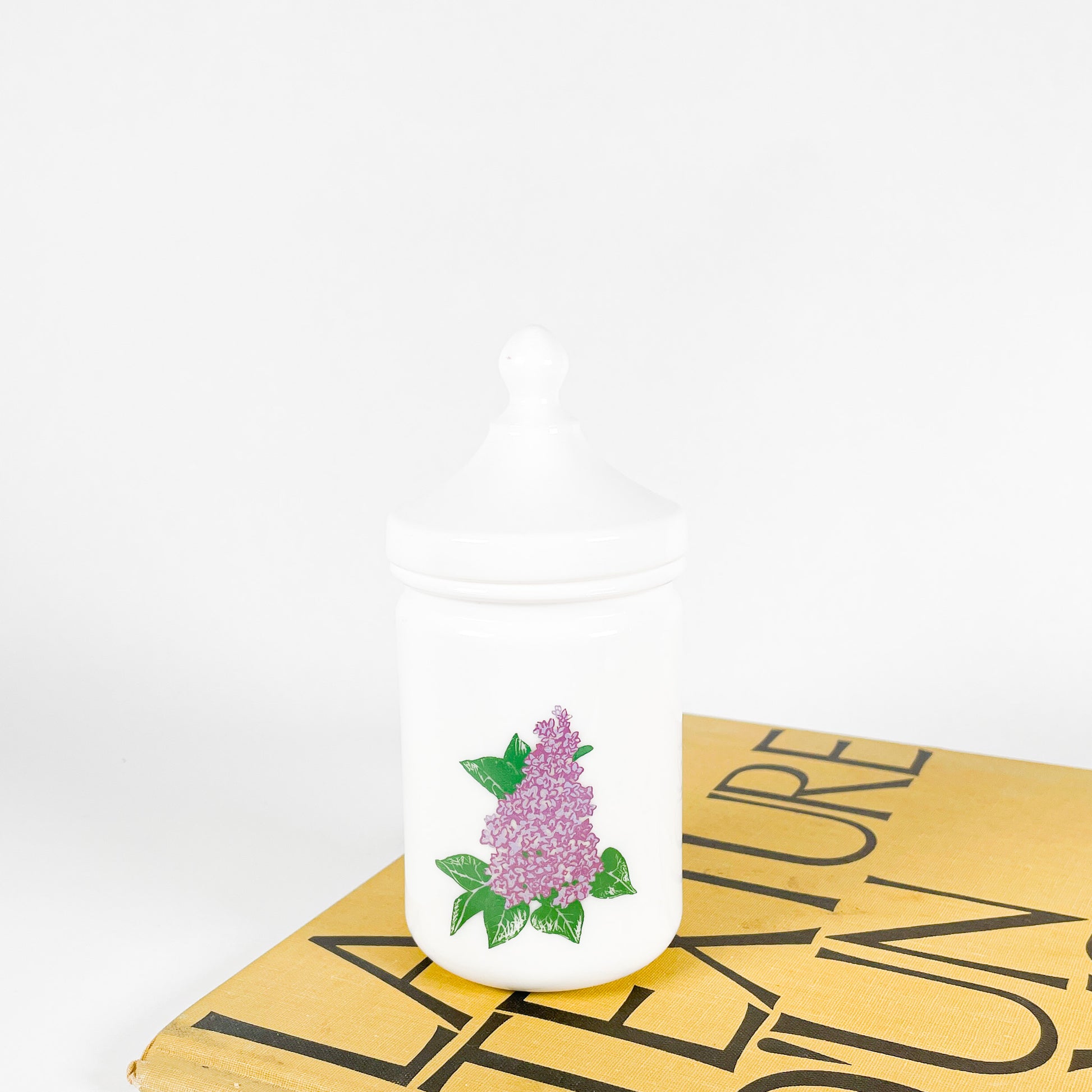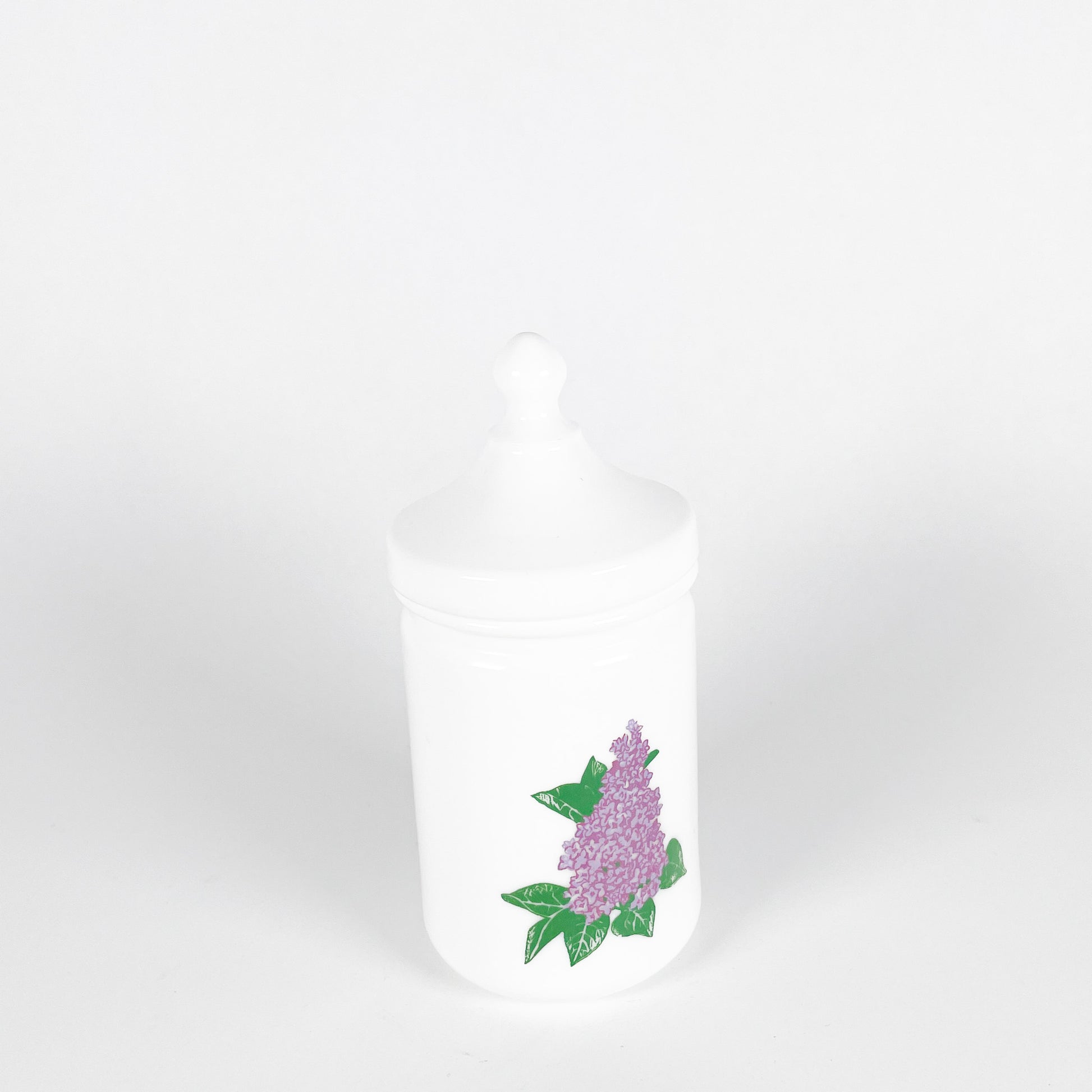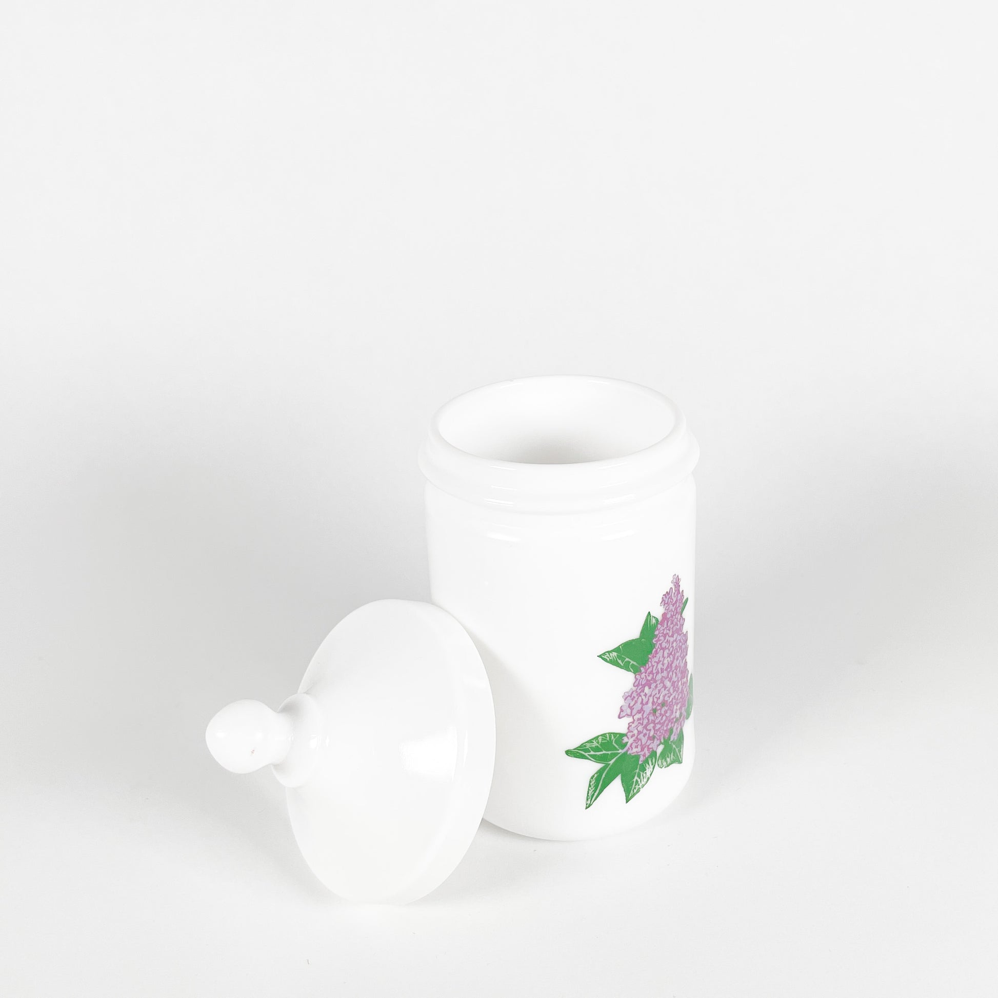 Petit contenant en milkglass fabriqué en France avec motif imprimé de lilas.