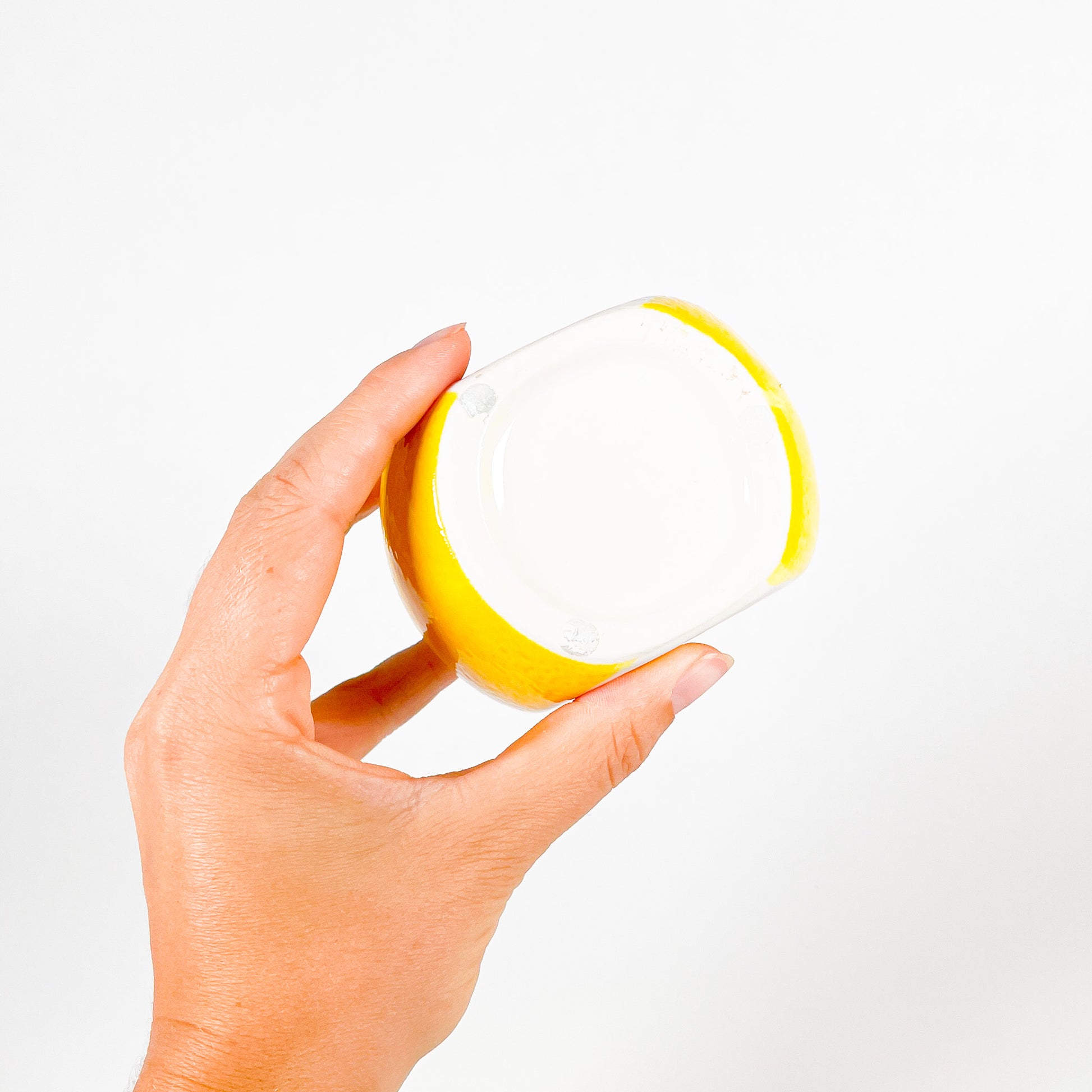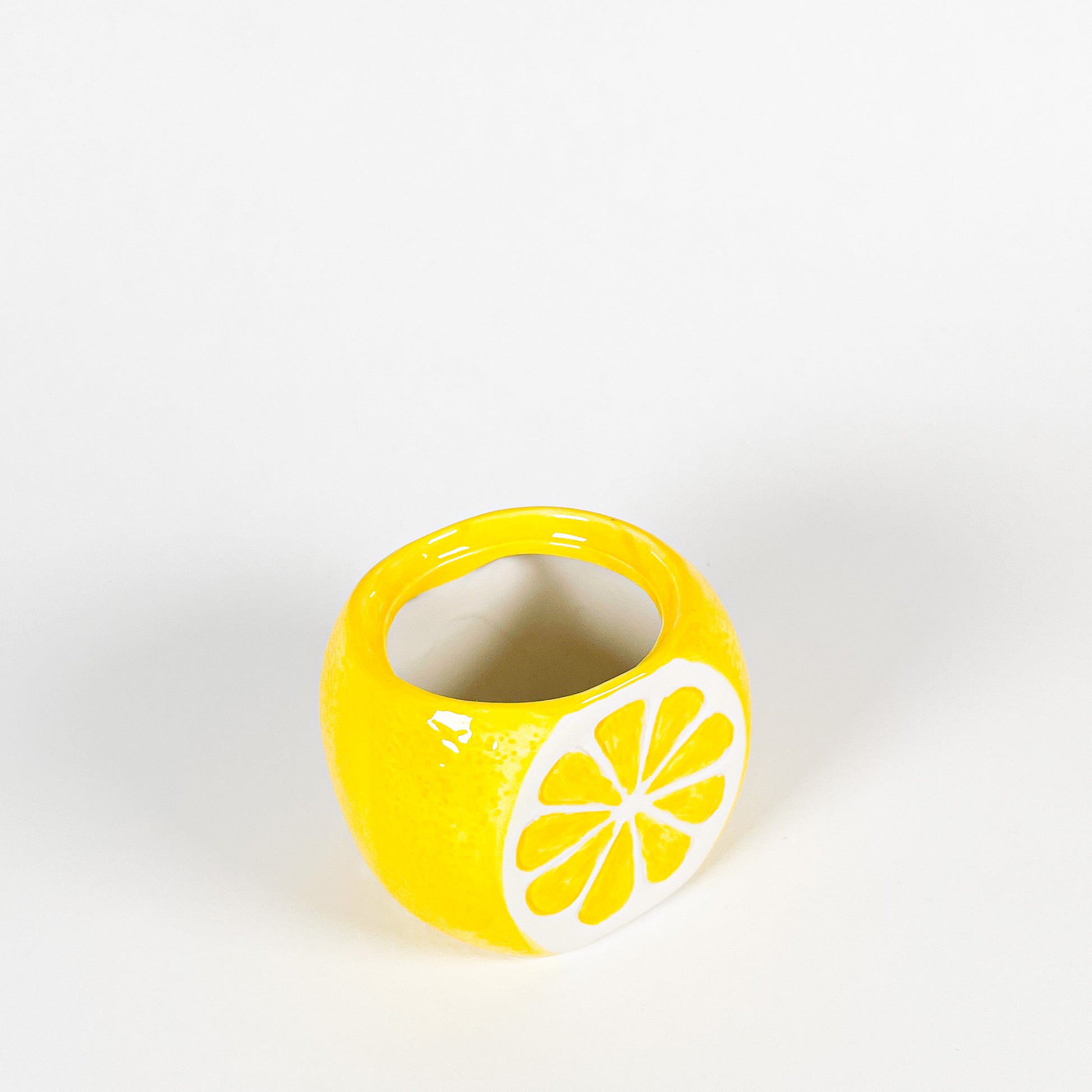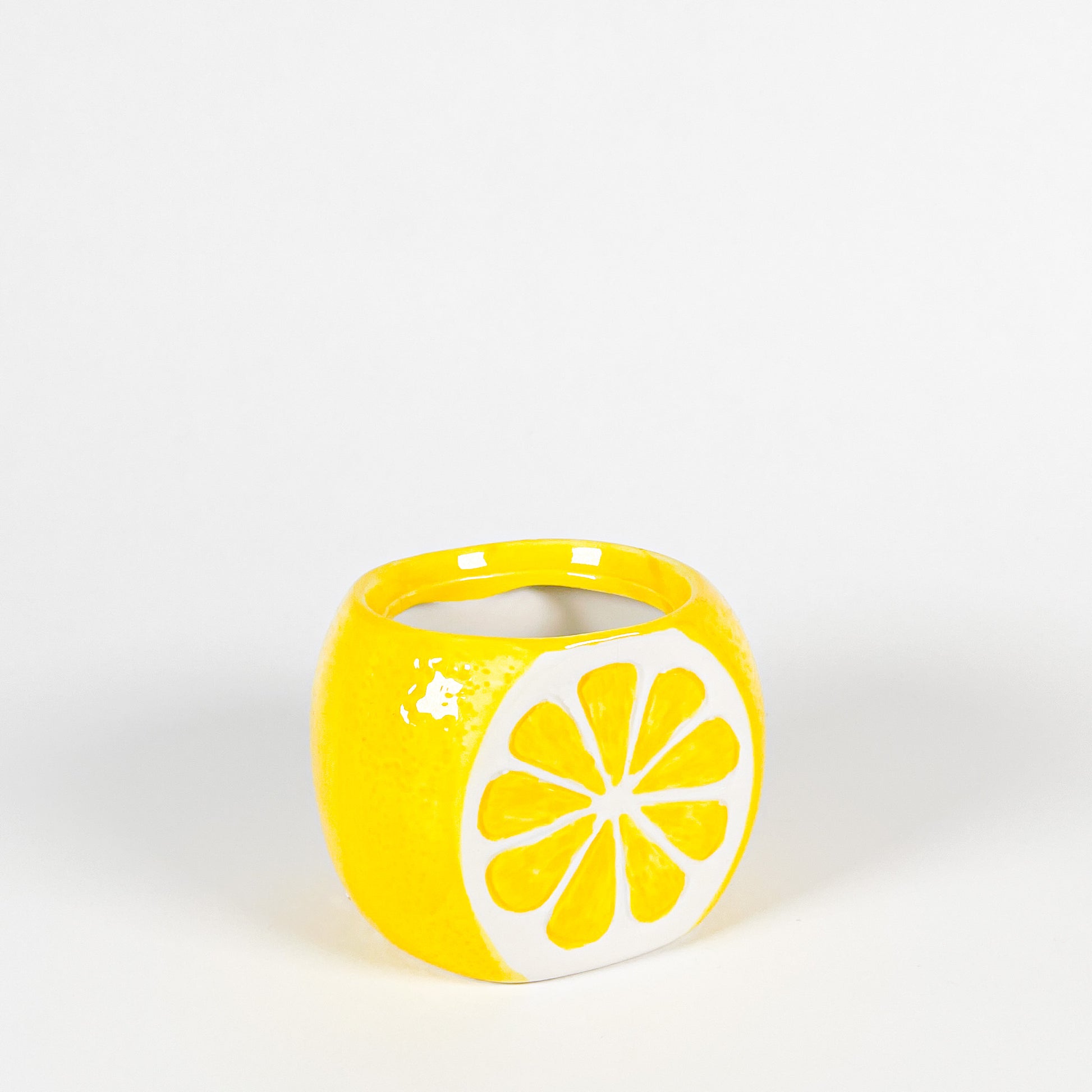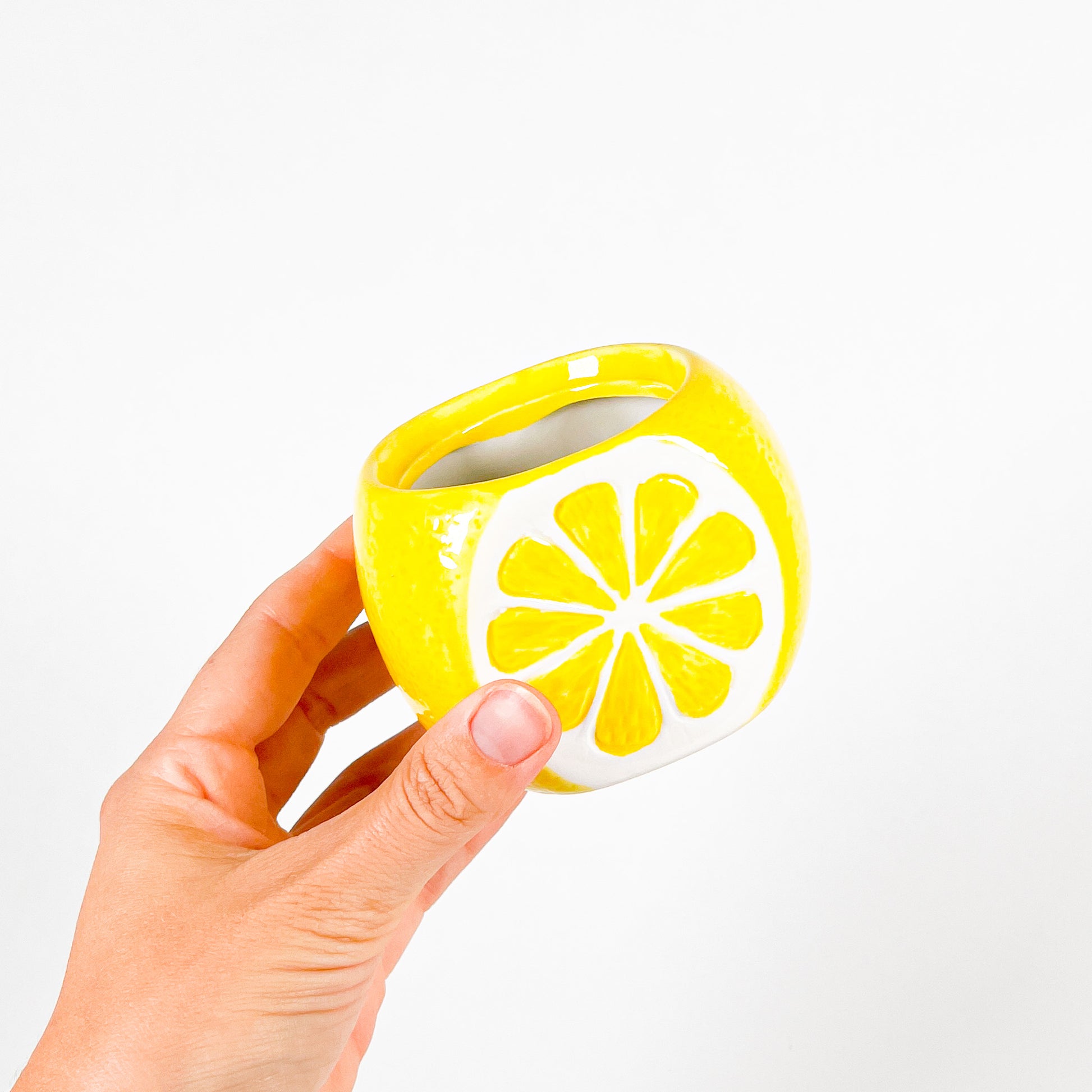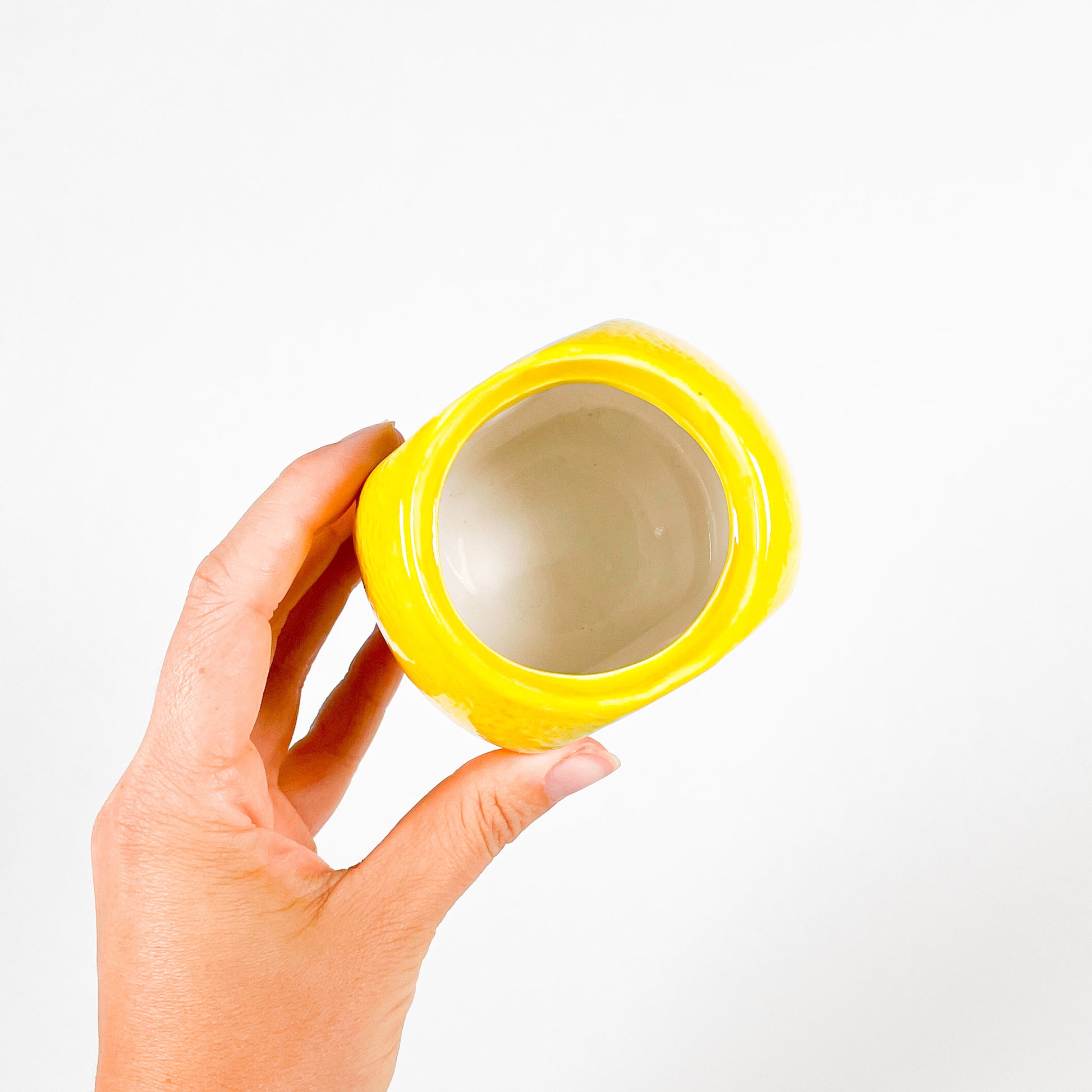 Petit pot en céramique en forme de citron. Il peut servir comme cache-pot ou bien comme pot pour ranger tes petites choses de bureau.
