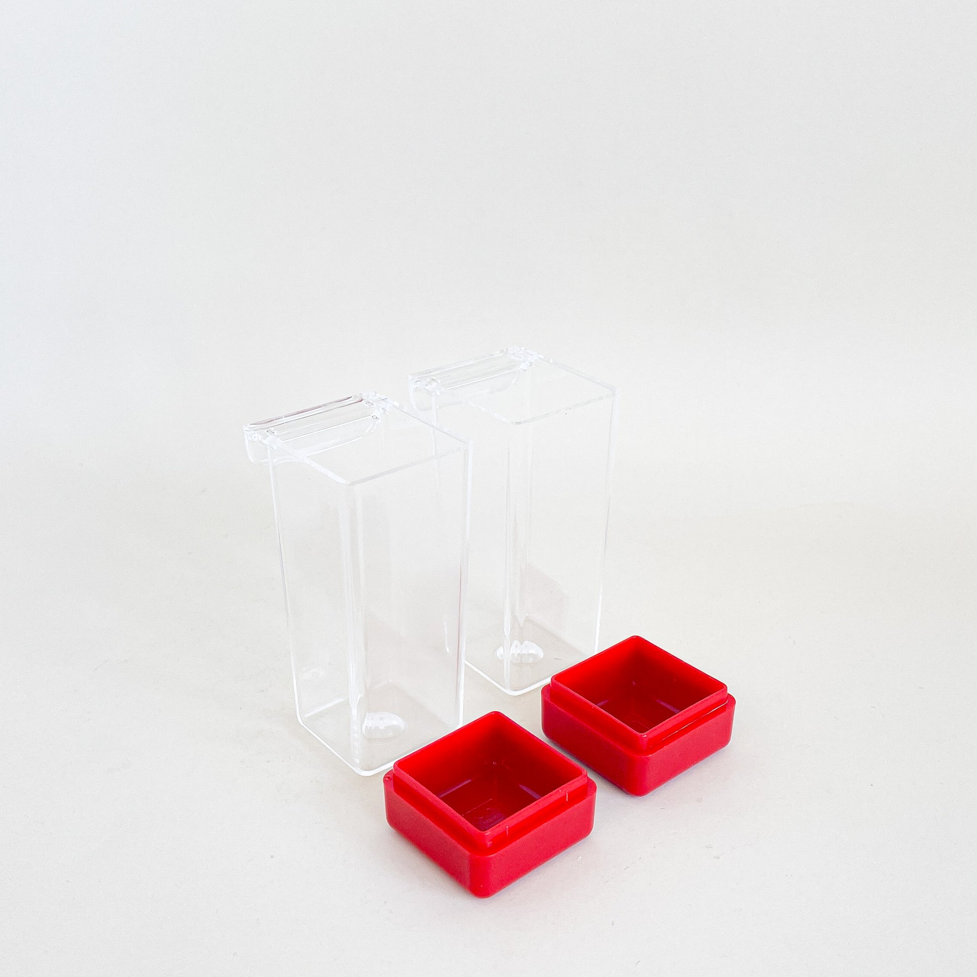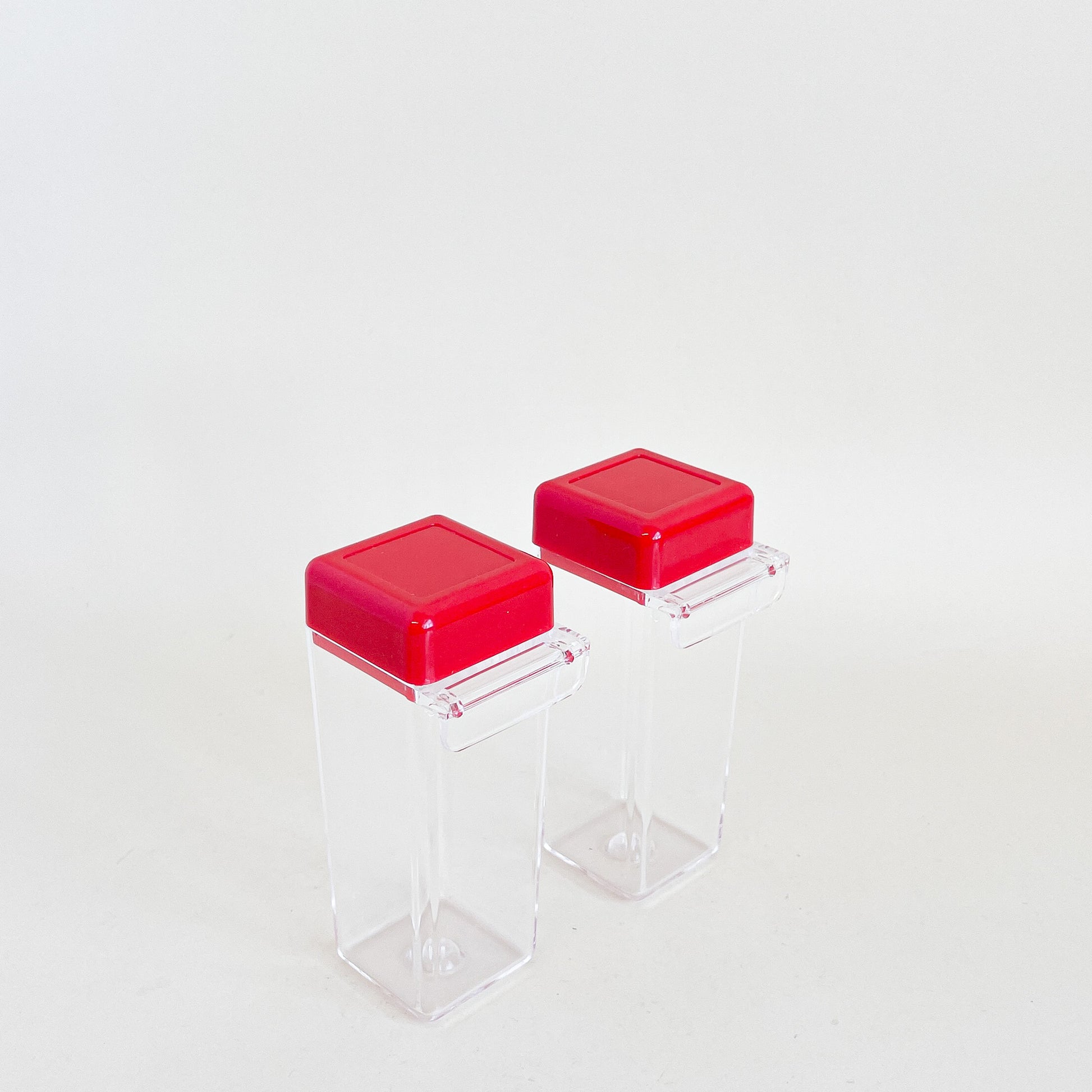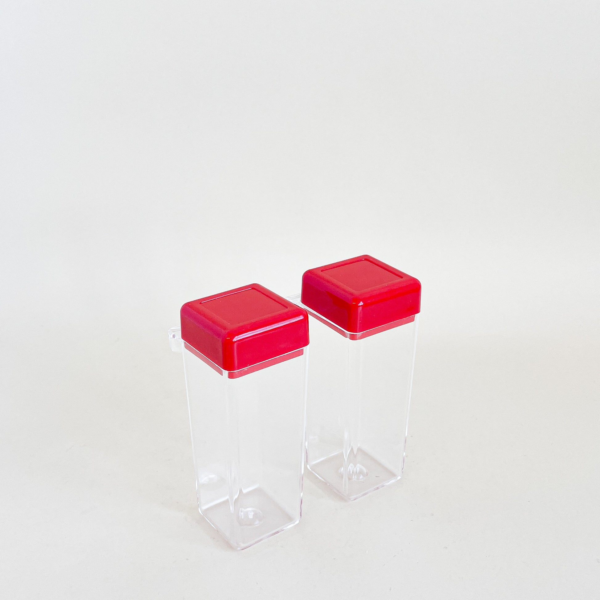 Ensemble de 2 petits contenants en acrylique et plastique rouge, design d'André Morin. Ils faisaient partis du (rare) système modulaire mural fait par le designer dans les années 1980. Les 2 pots ont donc une encoche pour les installer sur un rail au besoin.