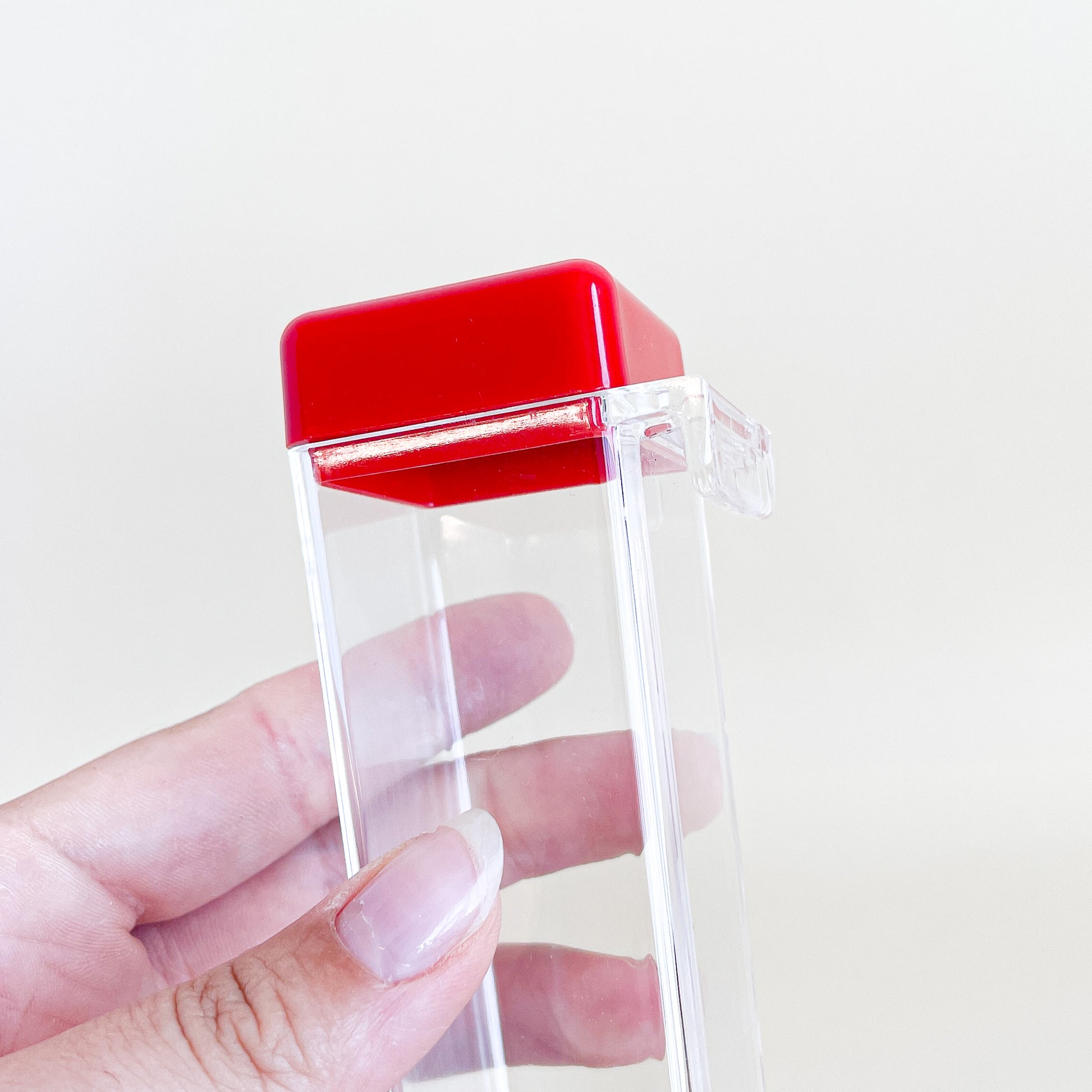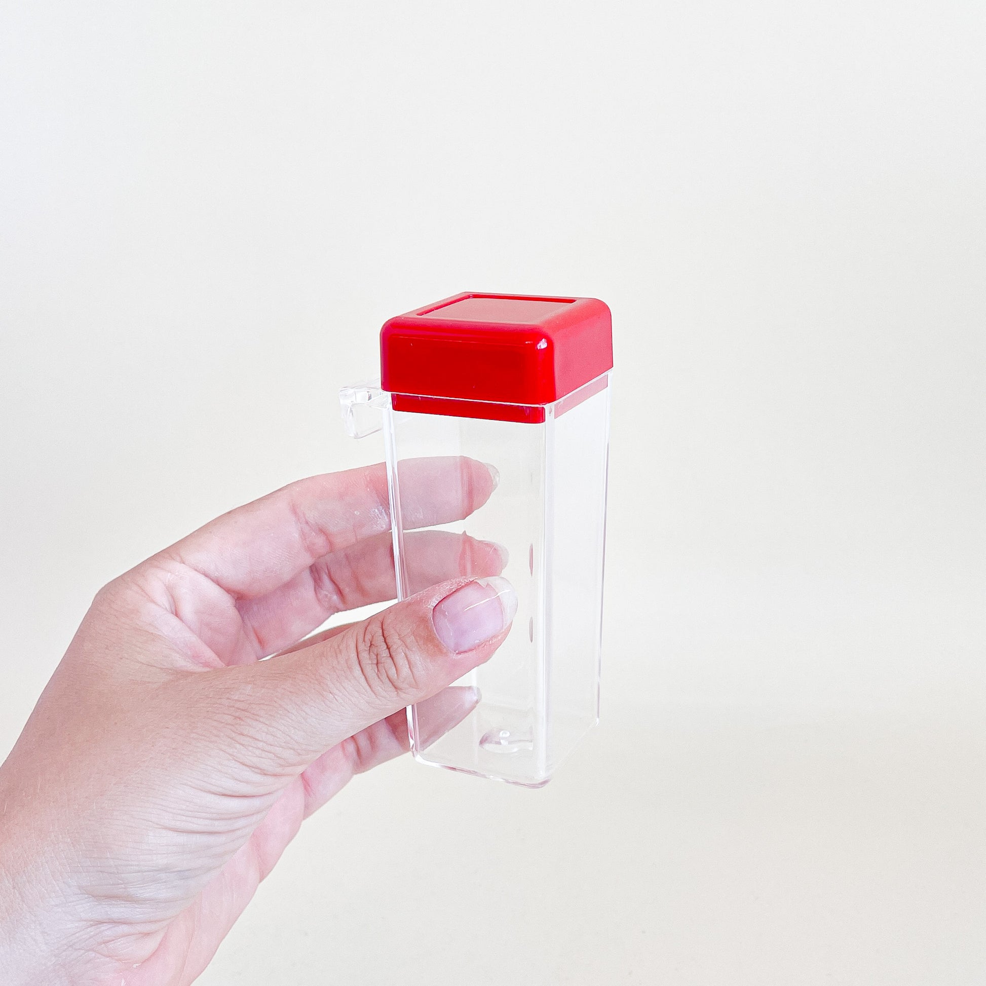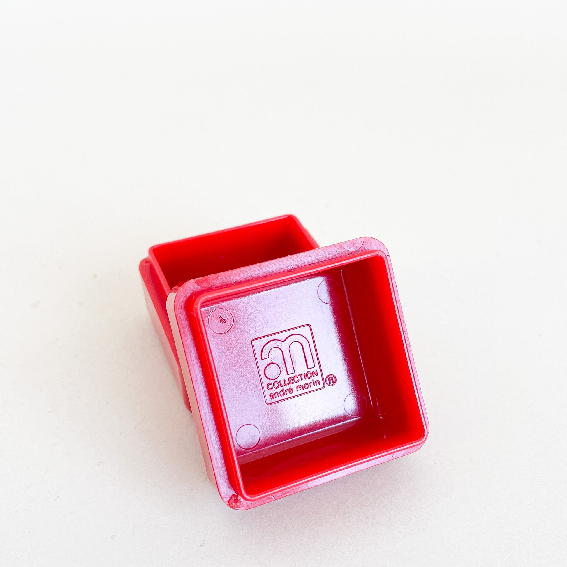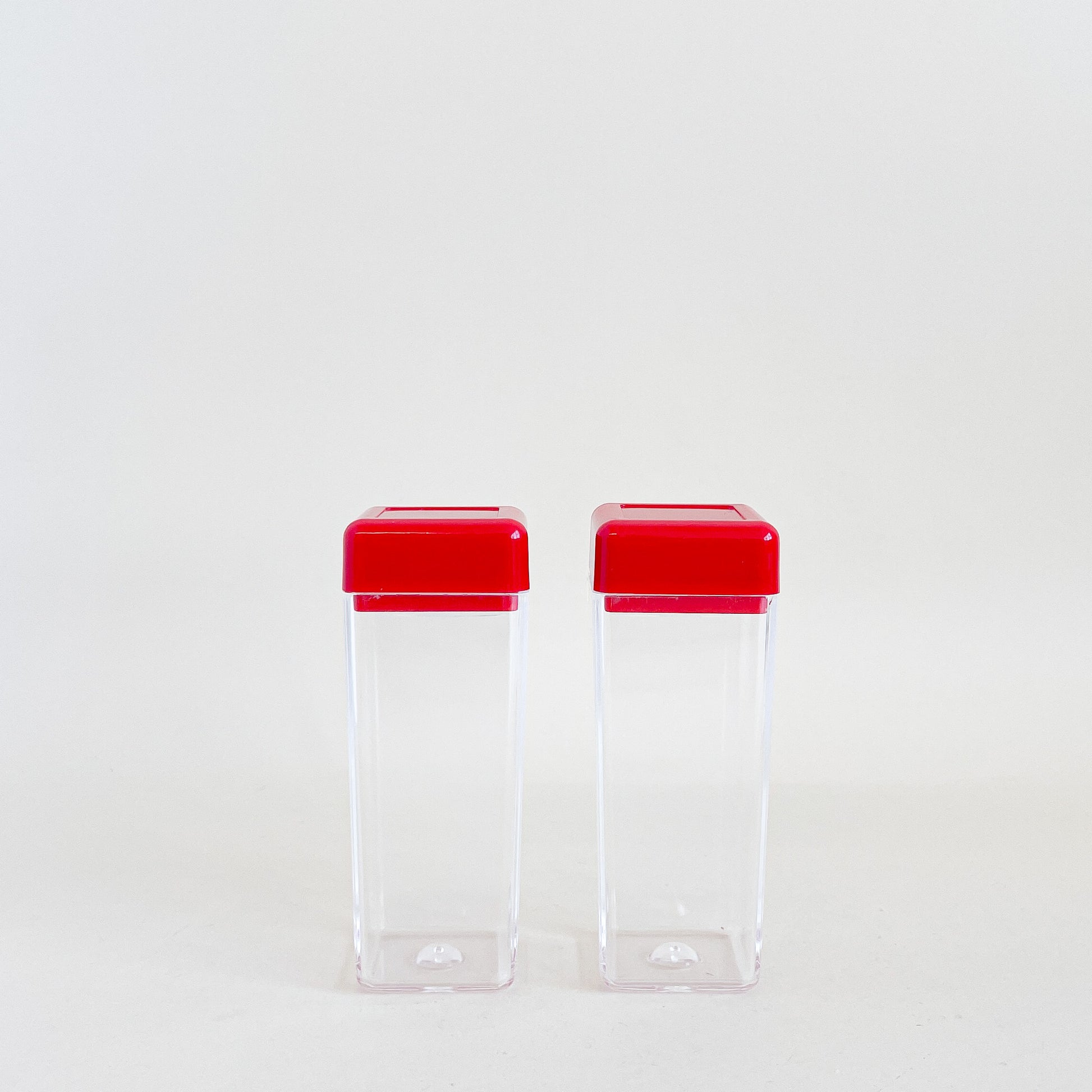 Ensemble de 2 petits contenants en acrylique et plastique rouge, design d'André Morin. Ils faisaient partis du (rare) système modulaire mural fait par le designer dans les années 1980. Les 2 pots ont donc une encoche pour les installer sur un rail au besoin.