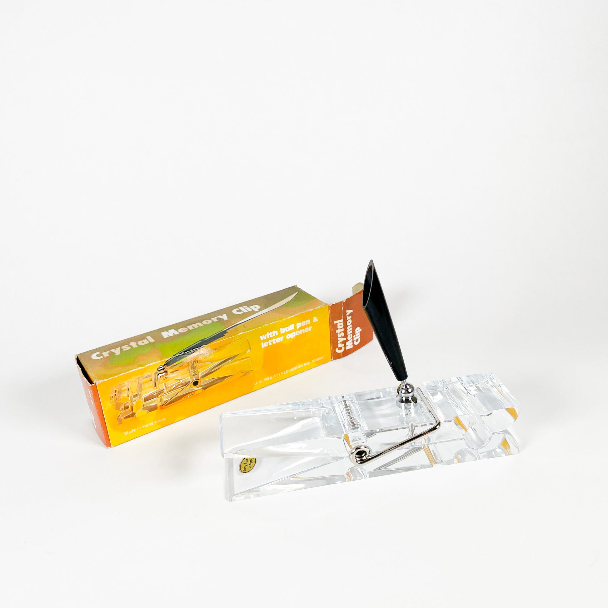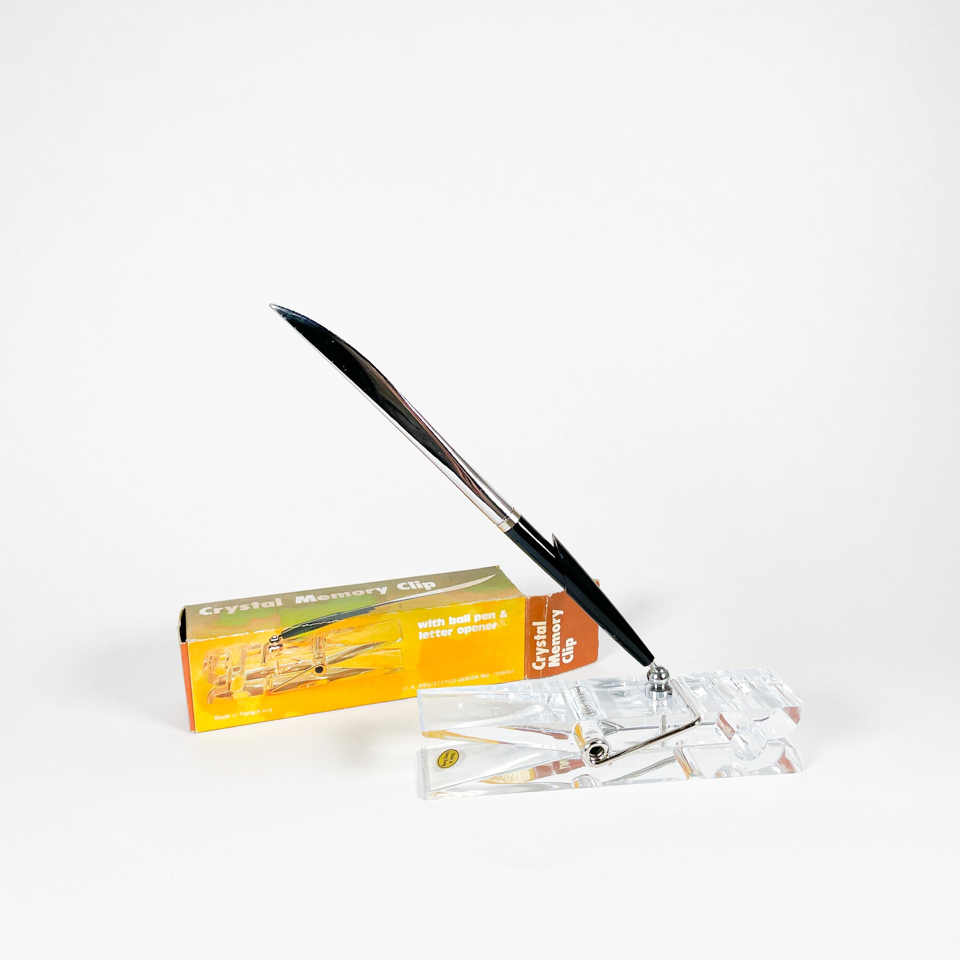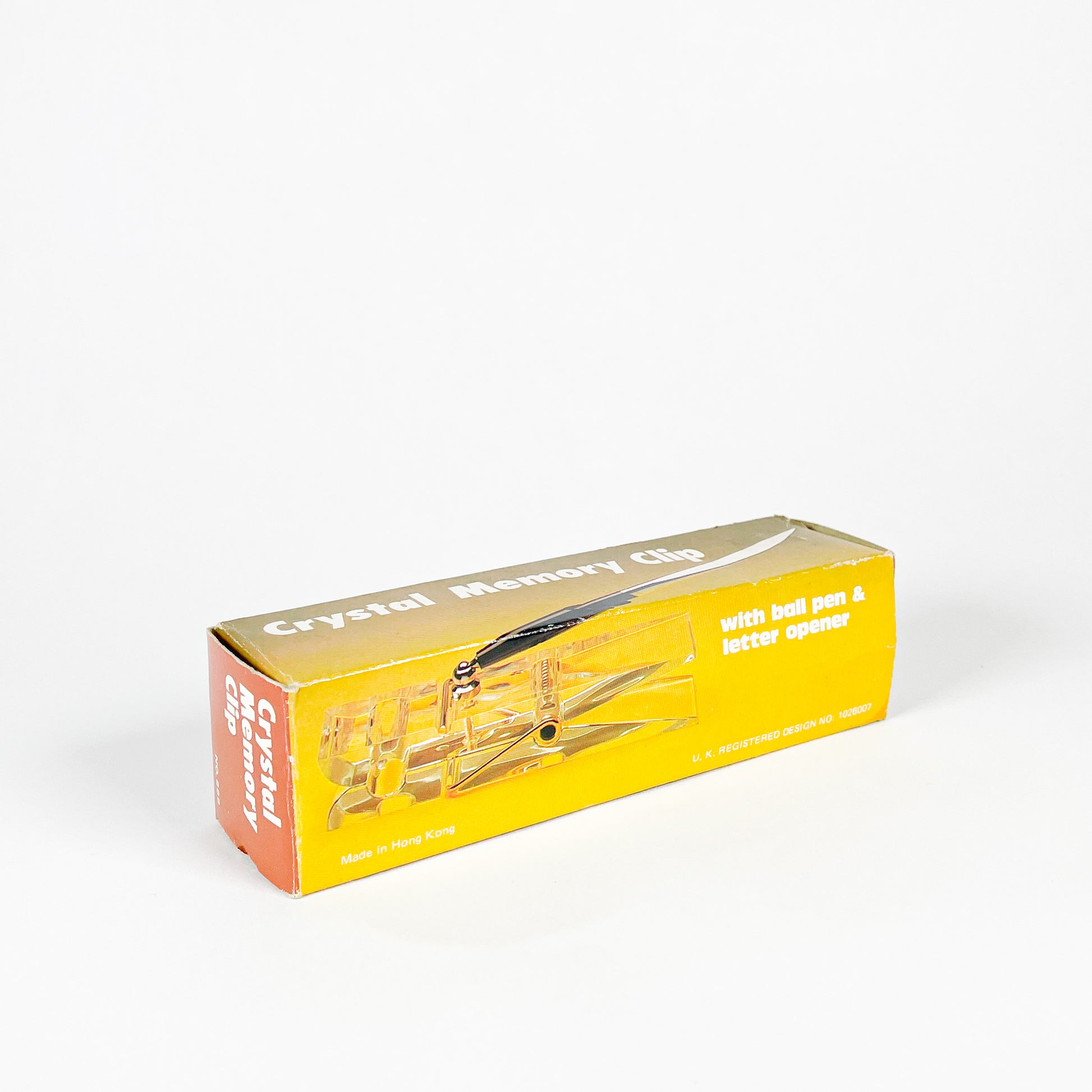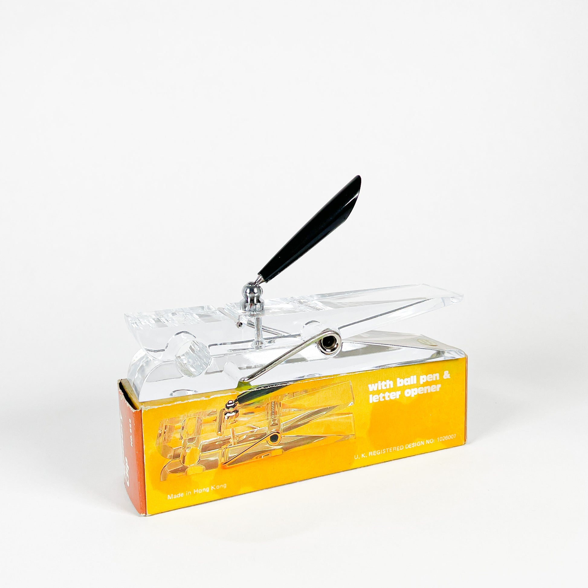 Neuf dans sa boîte ! Grande pince en lucite avec stylo/coupe-papier. Fabriqué à Hong-Kong dans les années 1970 ! Le stylo a été déballé que pour la photo.