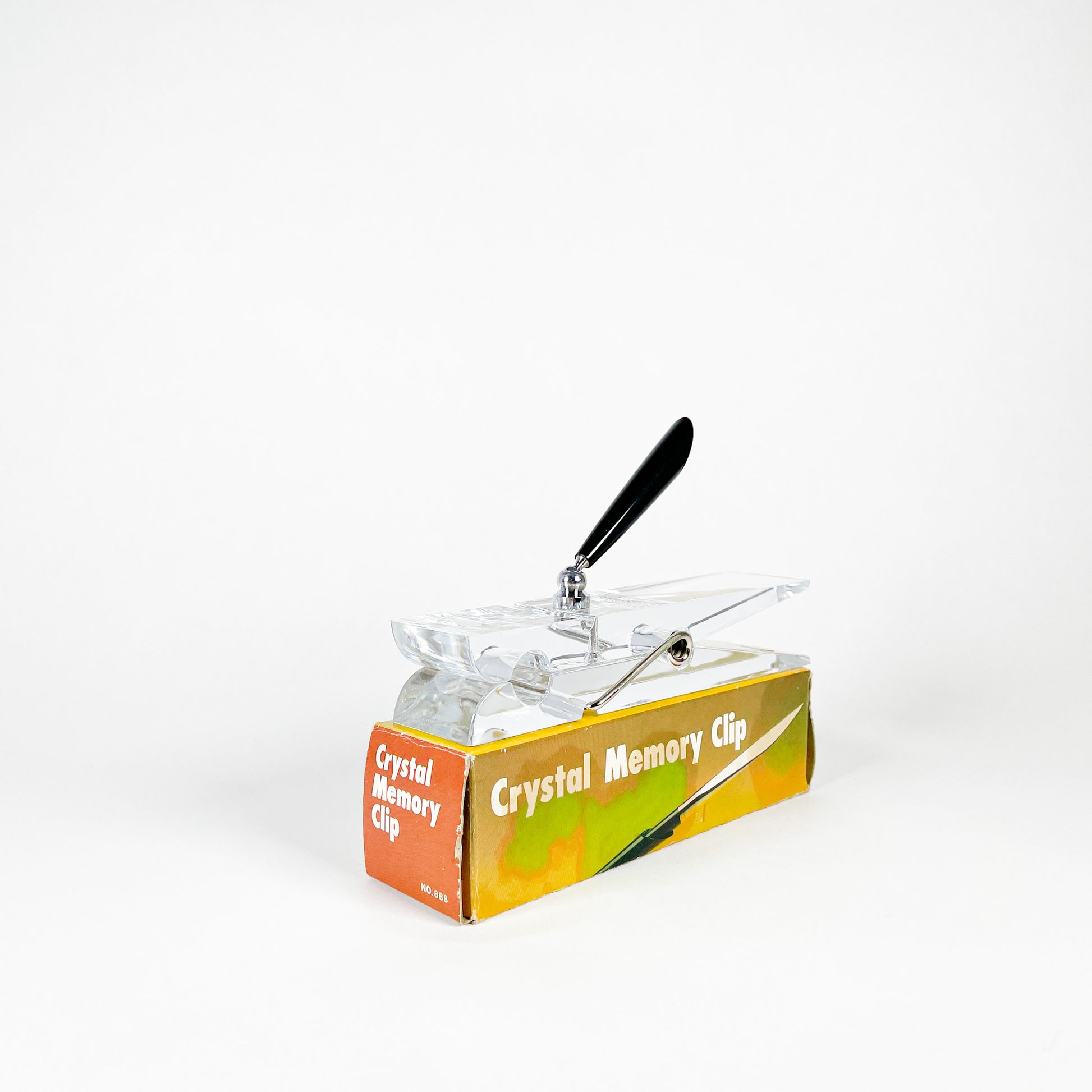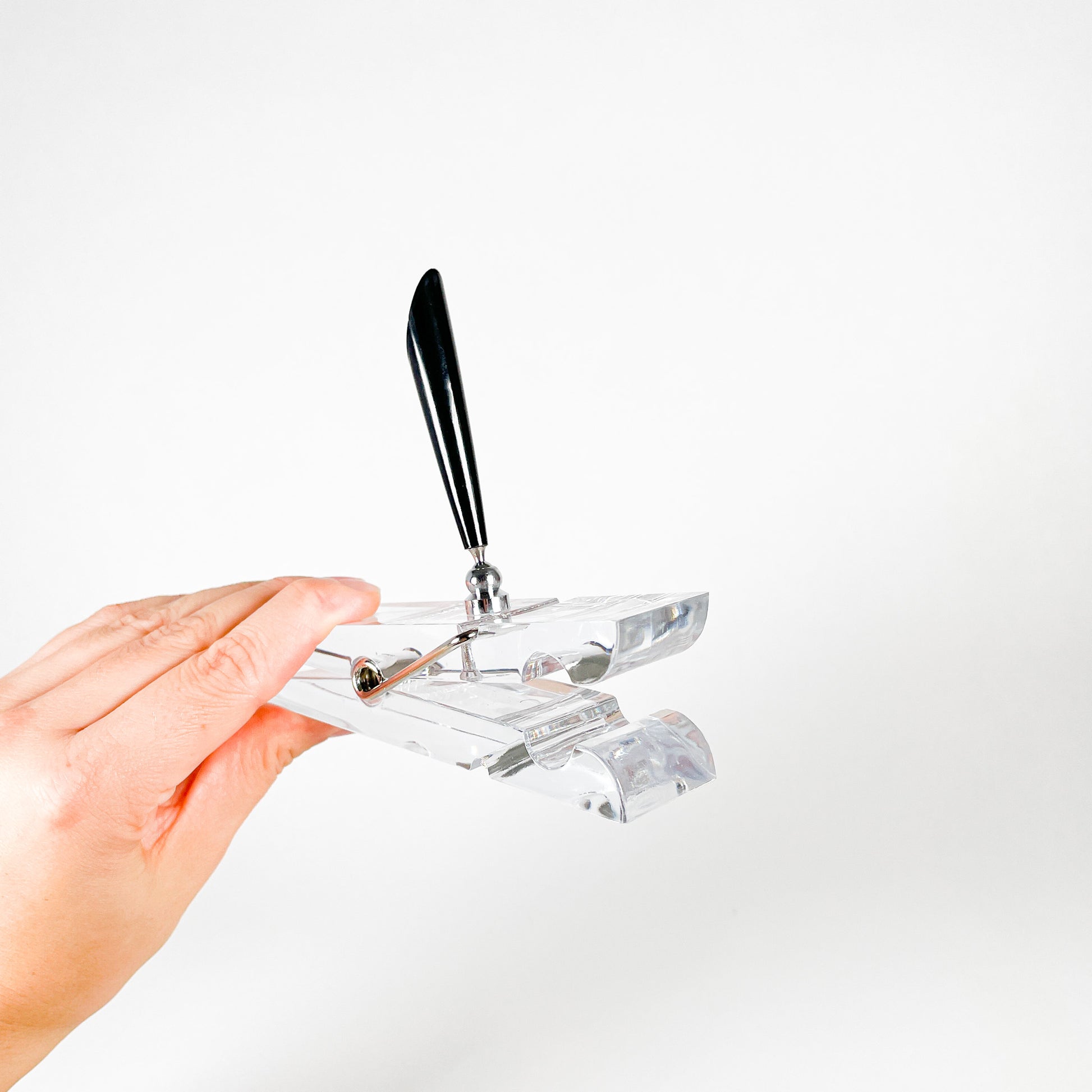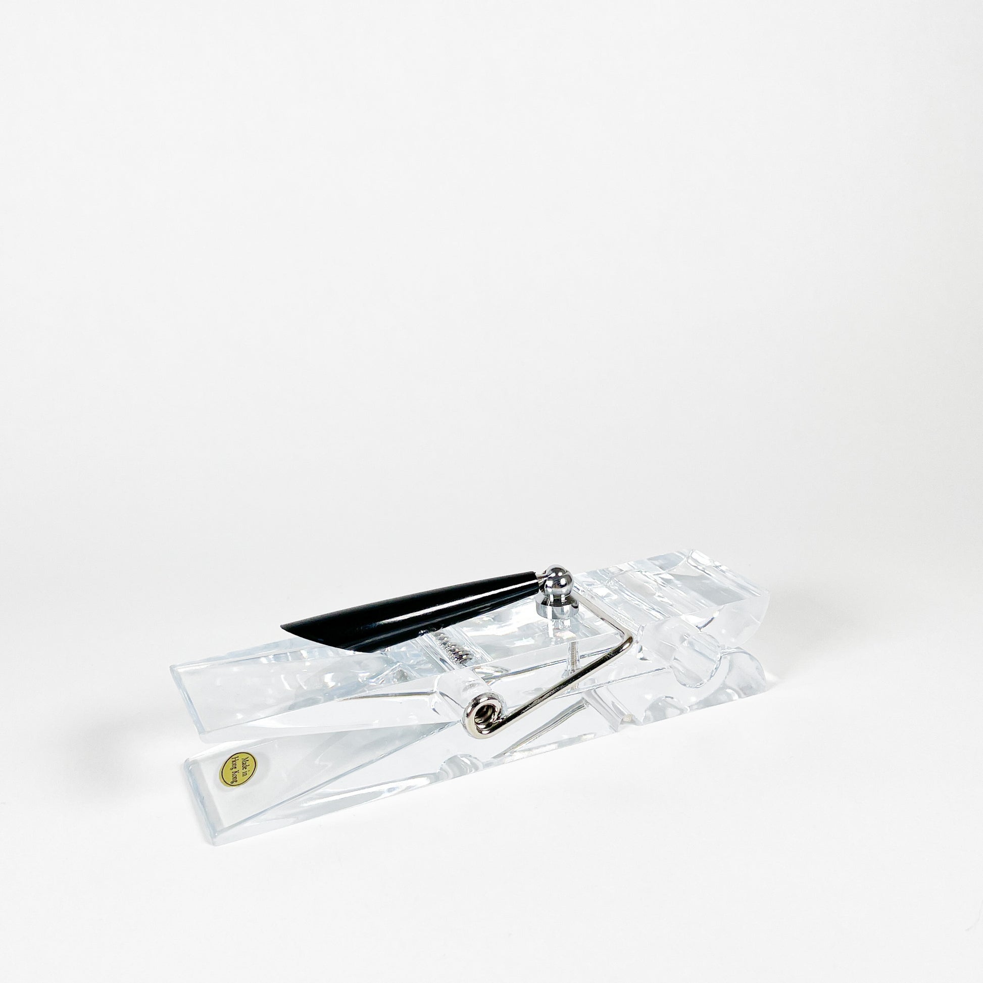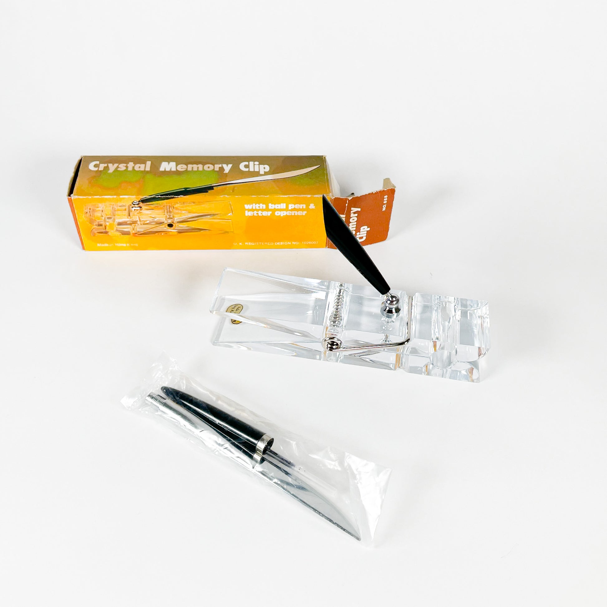 Neuf dans sa boîte ! Grande pince en lucite avec stylo/coupe-papier. Fabriqué à Hong-Kong dans les années 1970 ! Le stylo a été déballé que pour la photo.