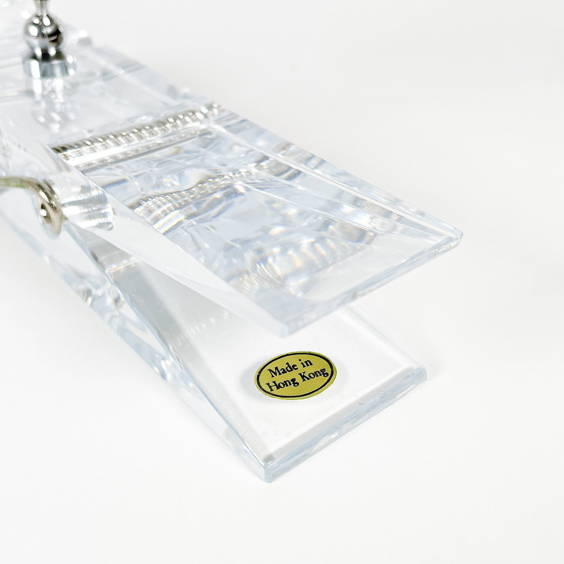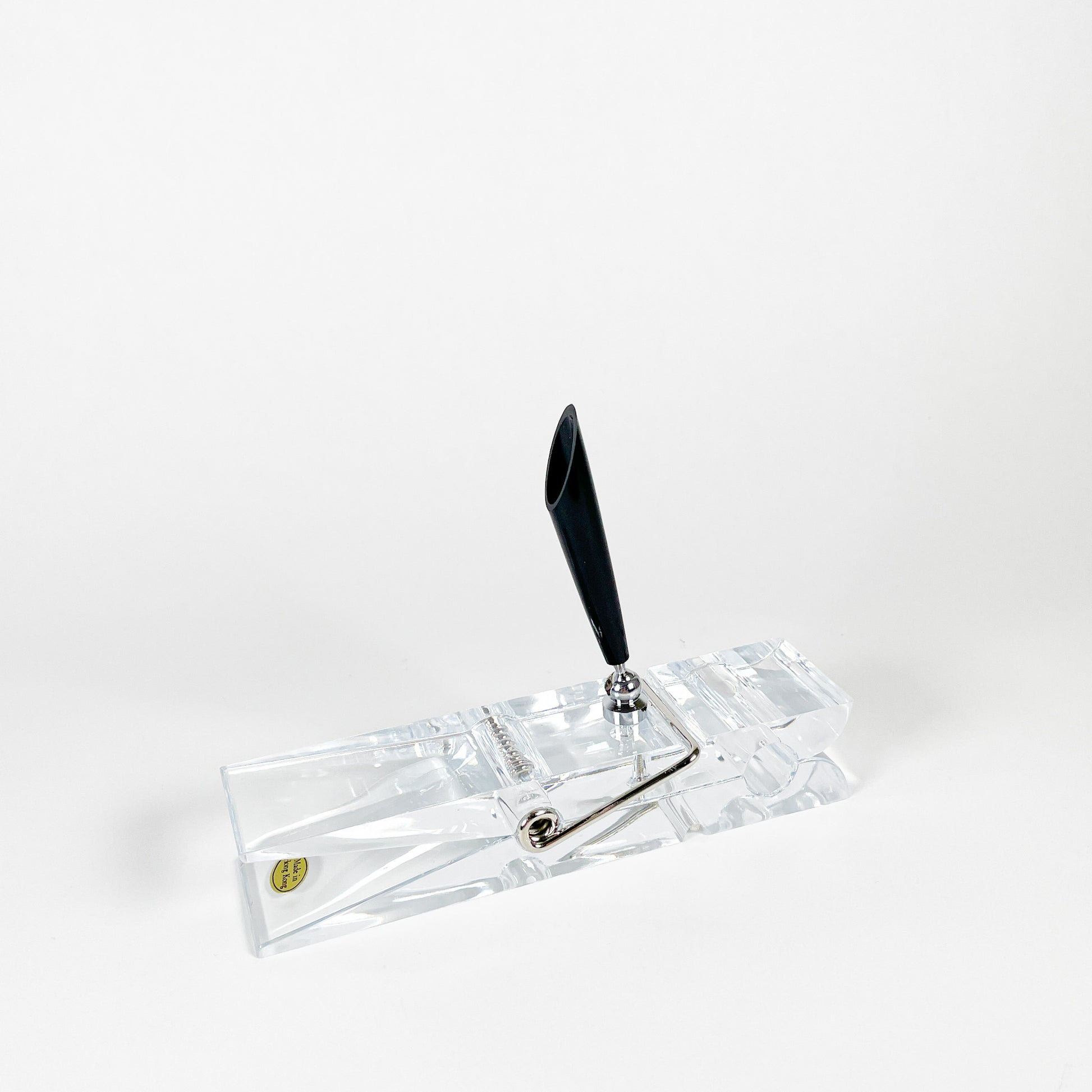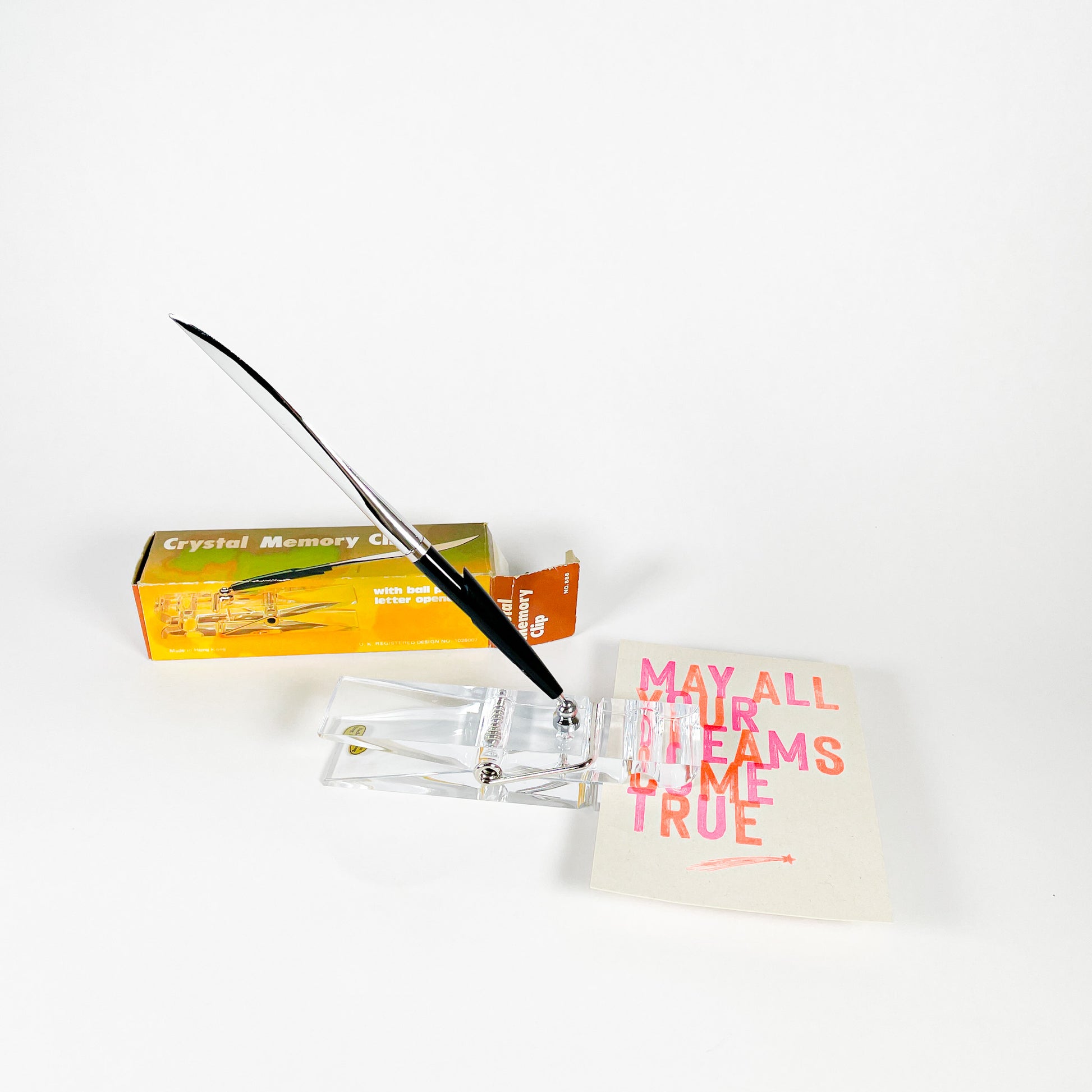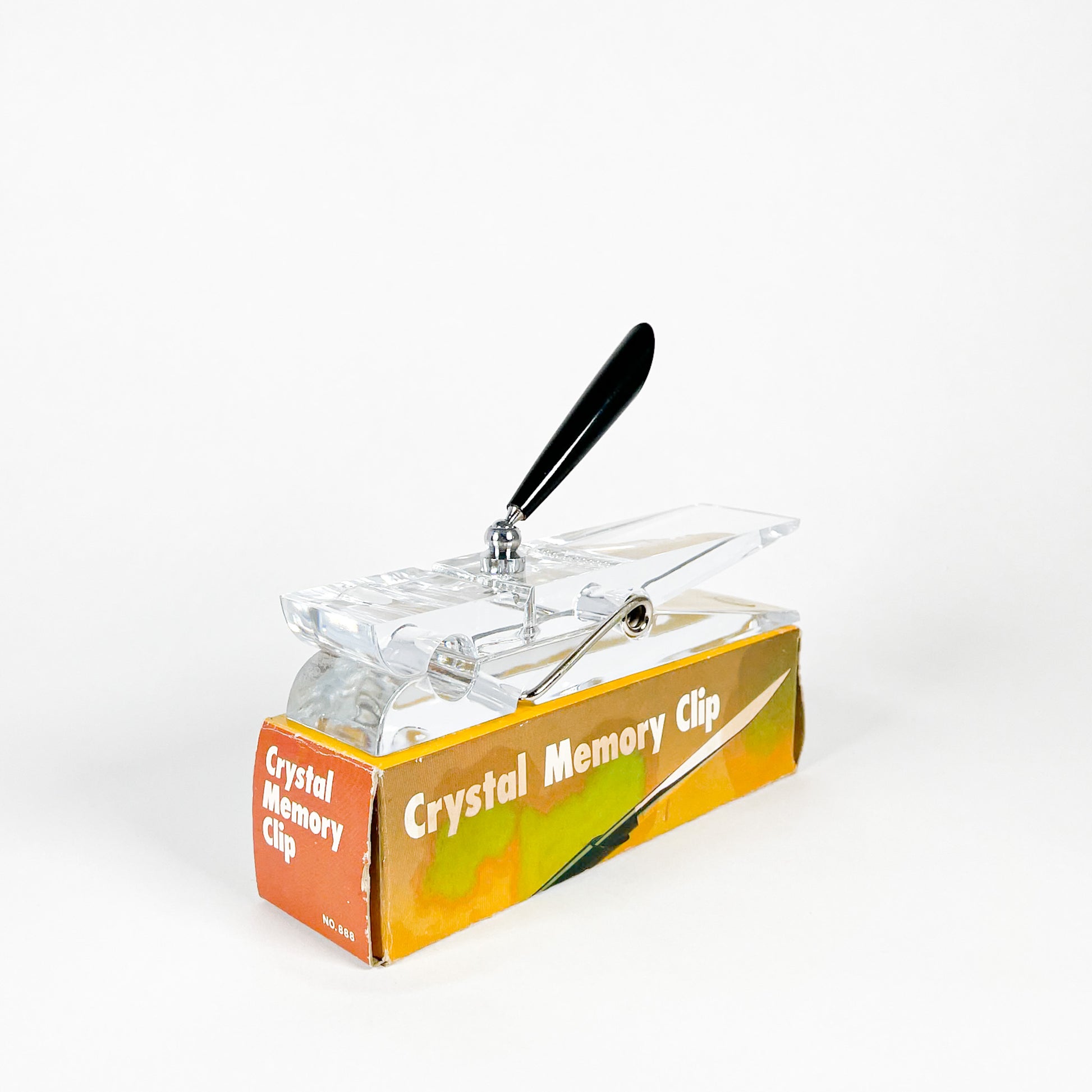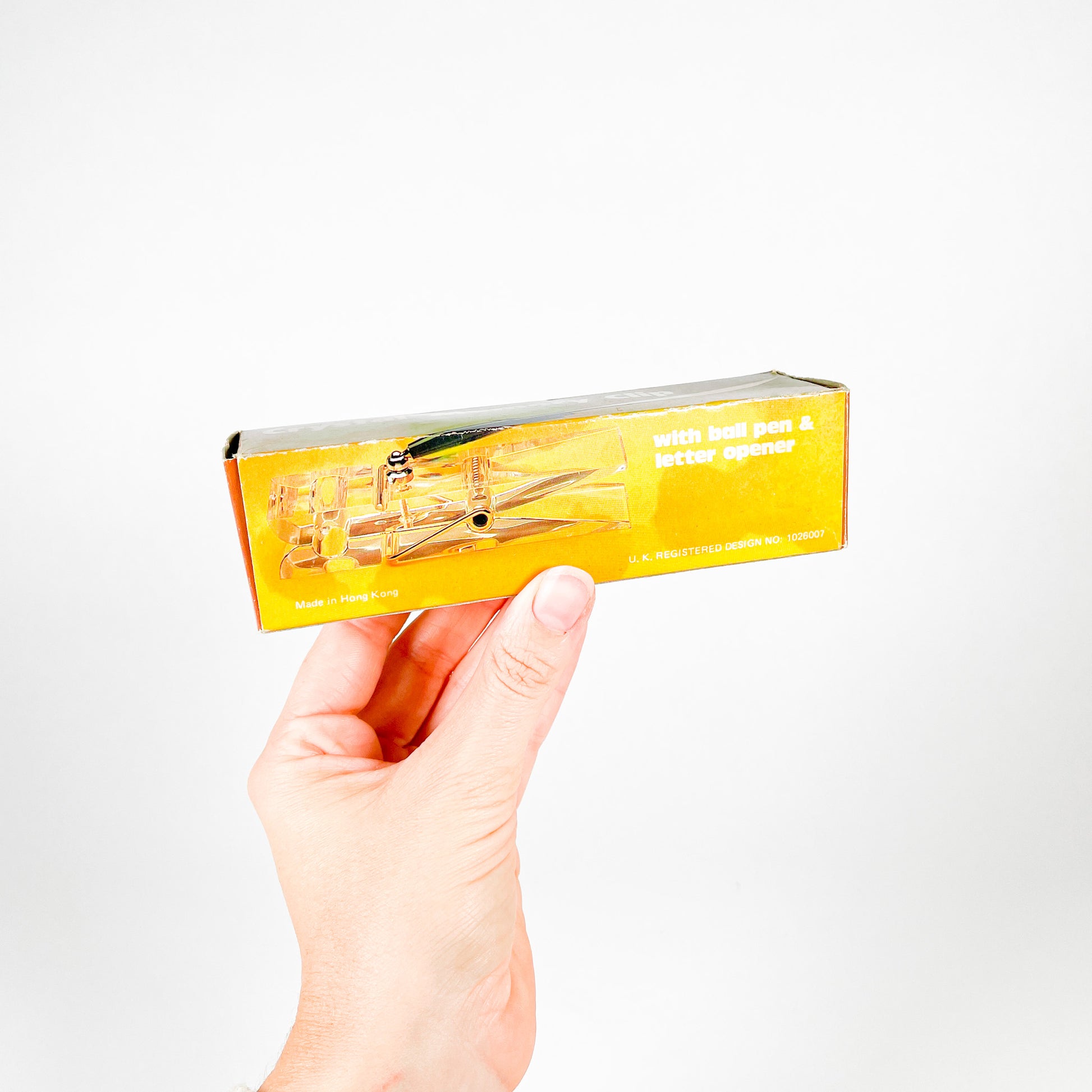 Neuf dans sa boîte ! Grande pince en lucite avec stylo/coupe-papier. Fabriqué à Hong-Kong dans les années 1970 ! Le stylo a été déballé que pour la photo.