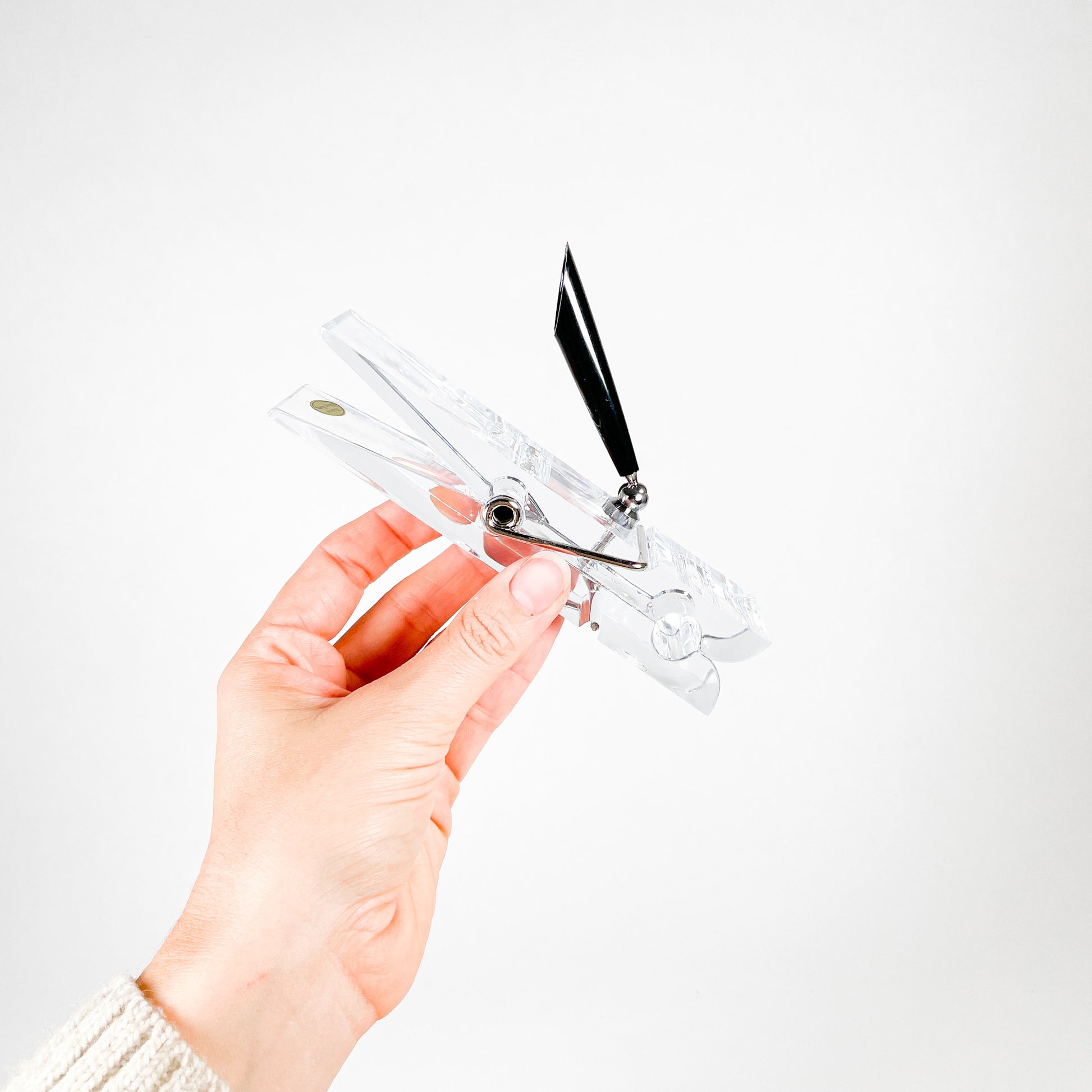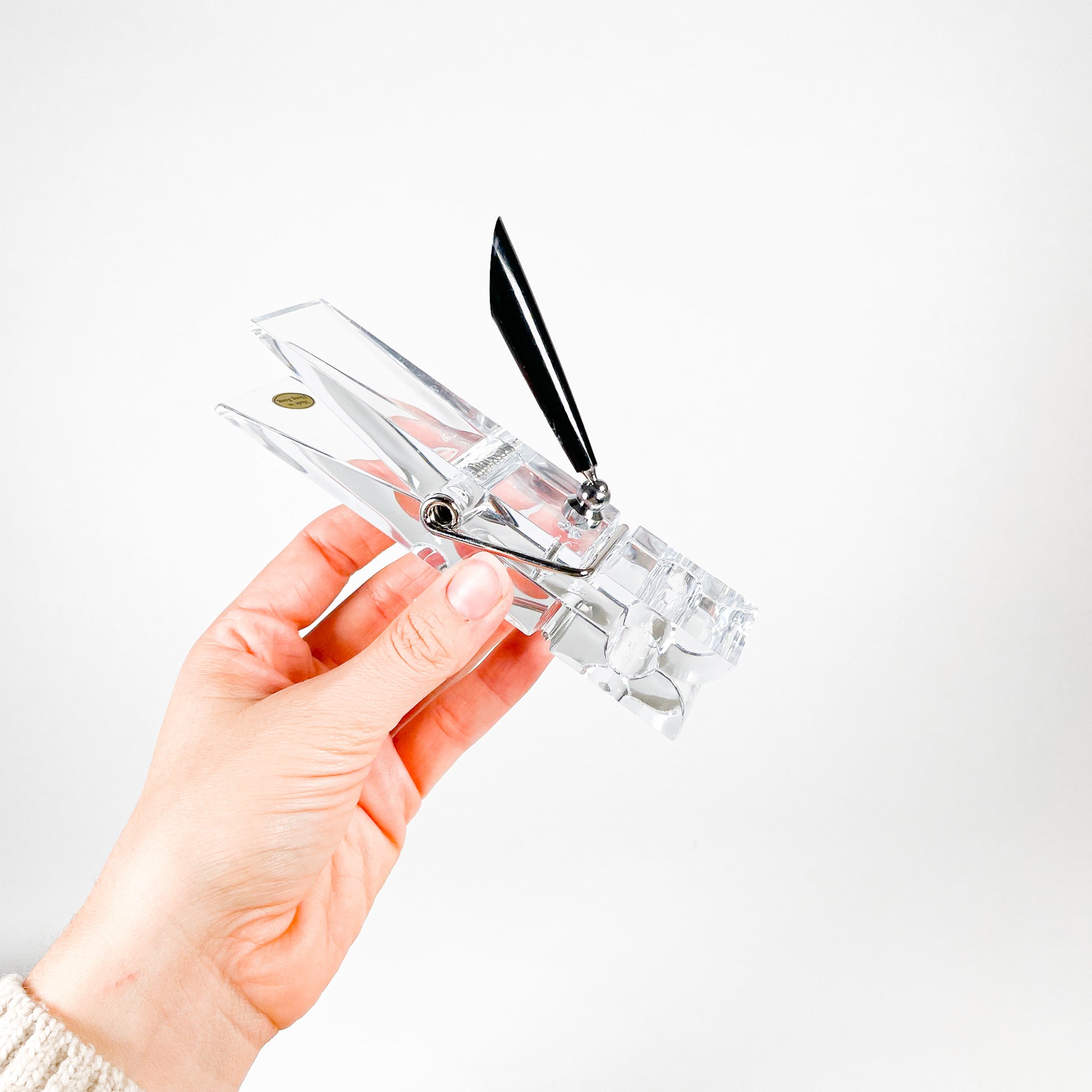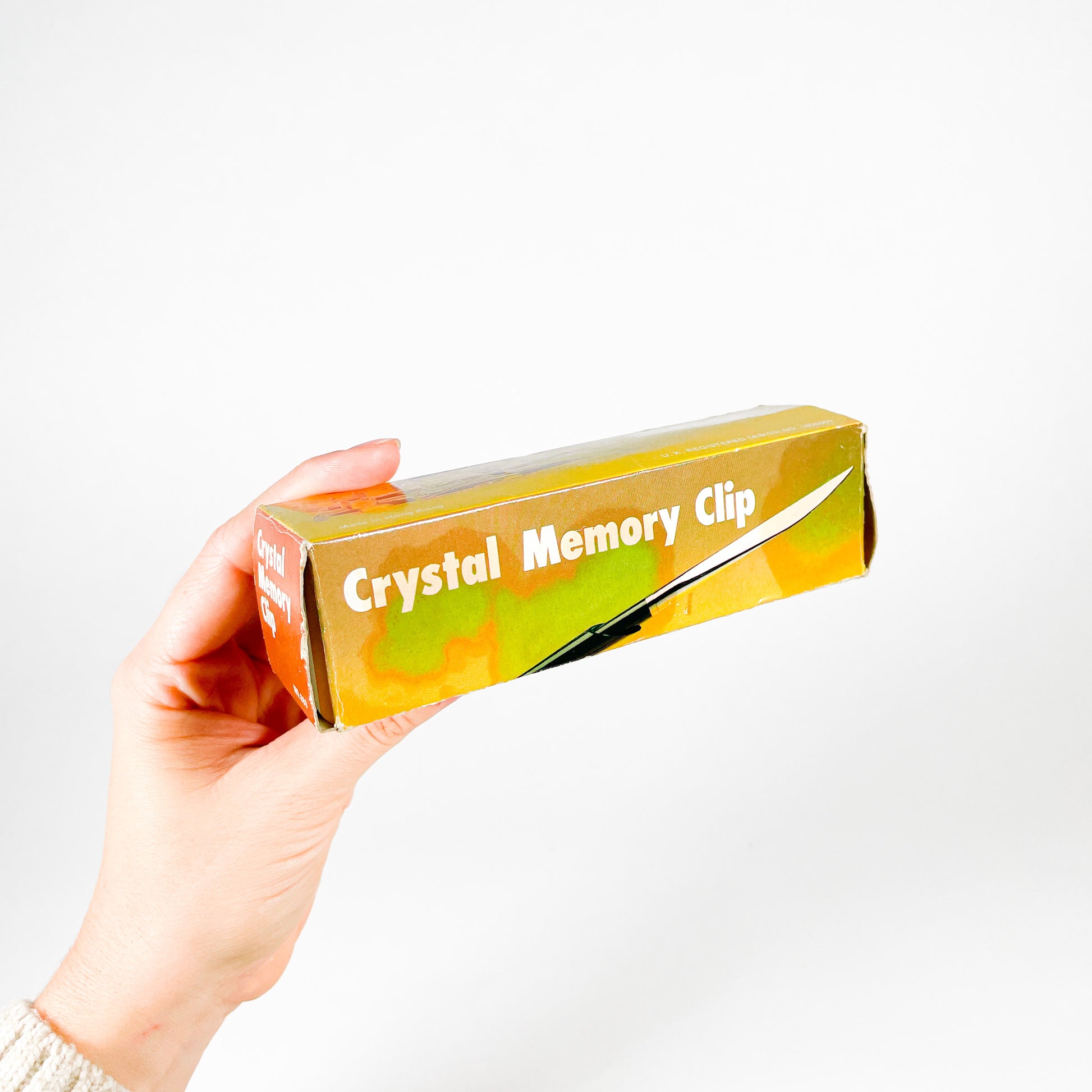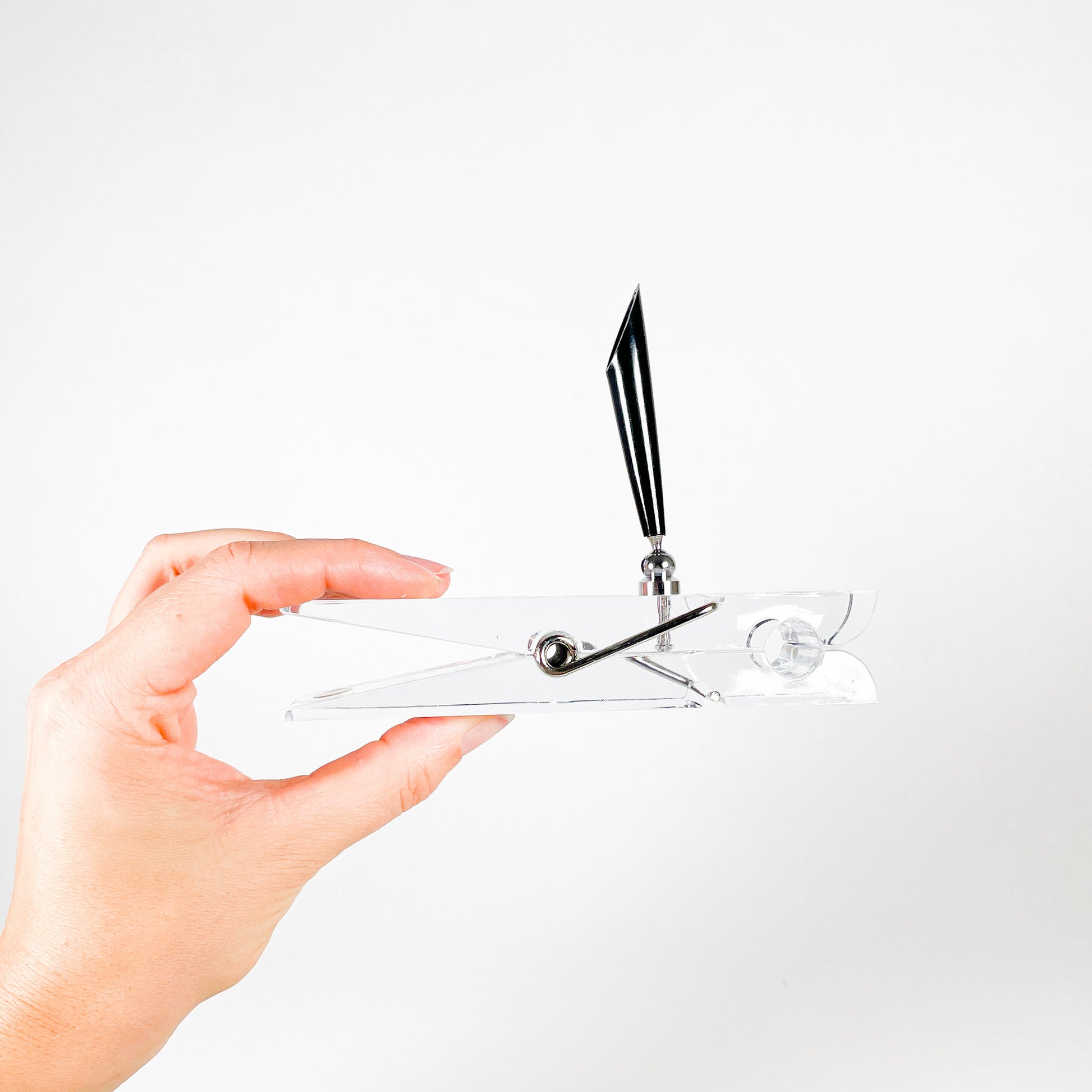 Neuf dans sa boîte ! Grande pince en lucite avec stylo/coupe-papier. Fabriqué à Hong-Kong dans les années 1970 ! Le stylo a été déballé que pour la photo.