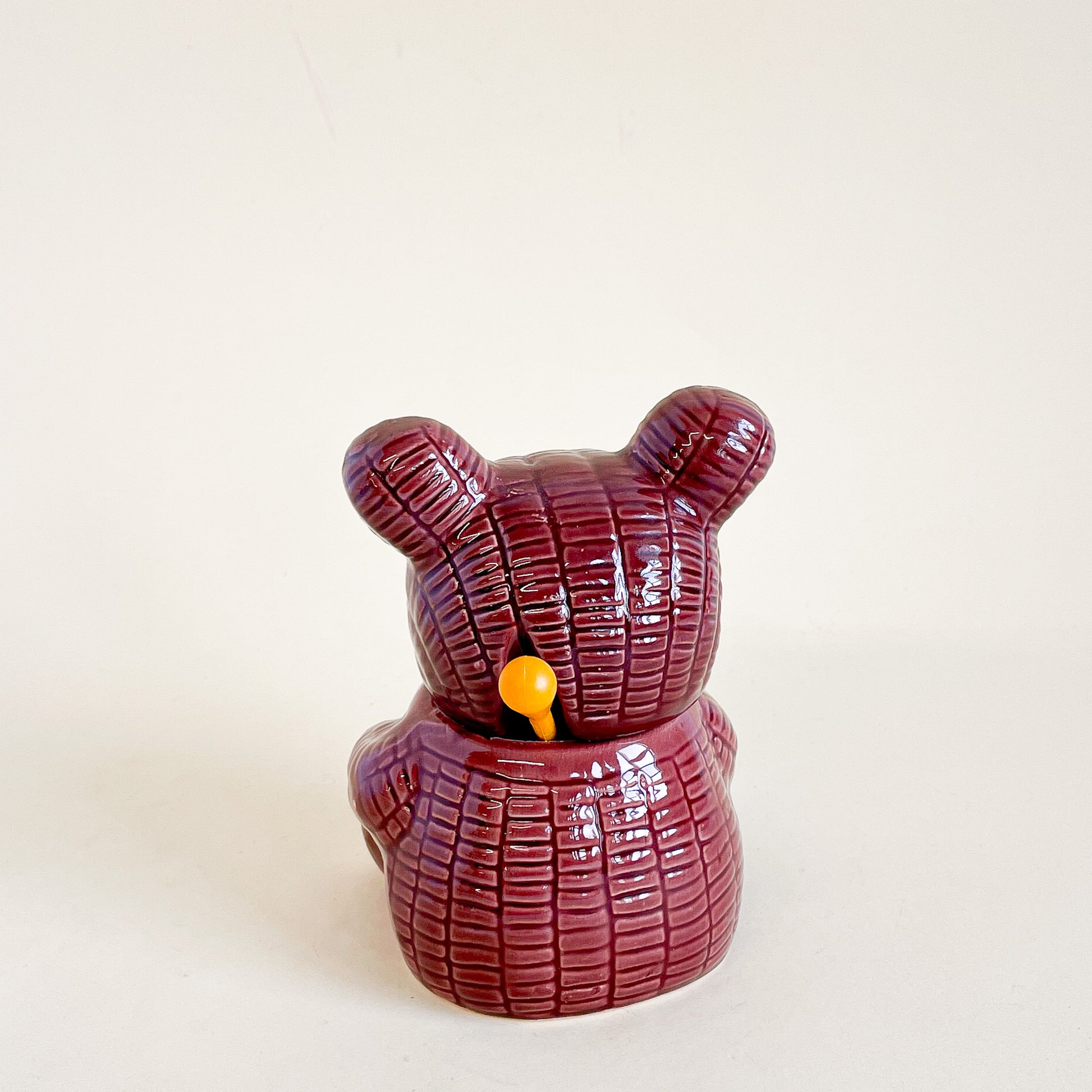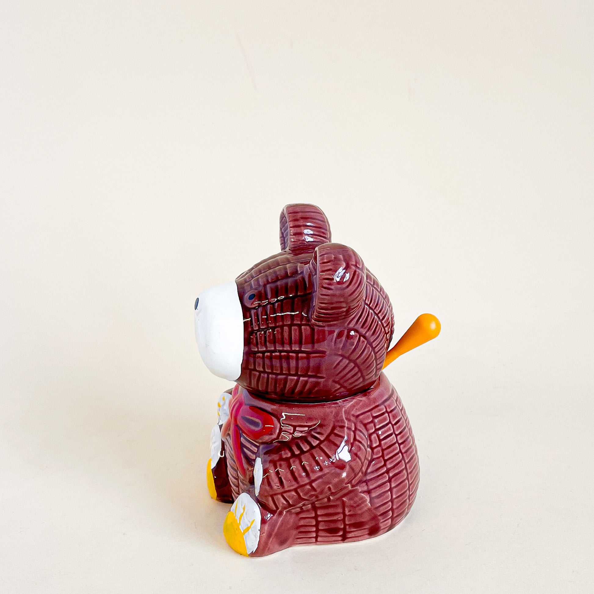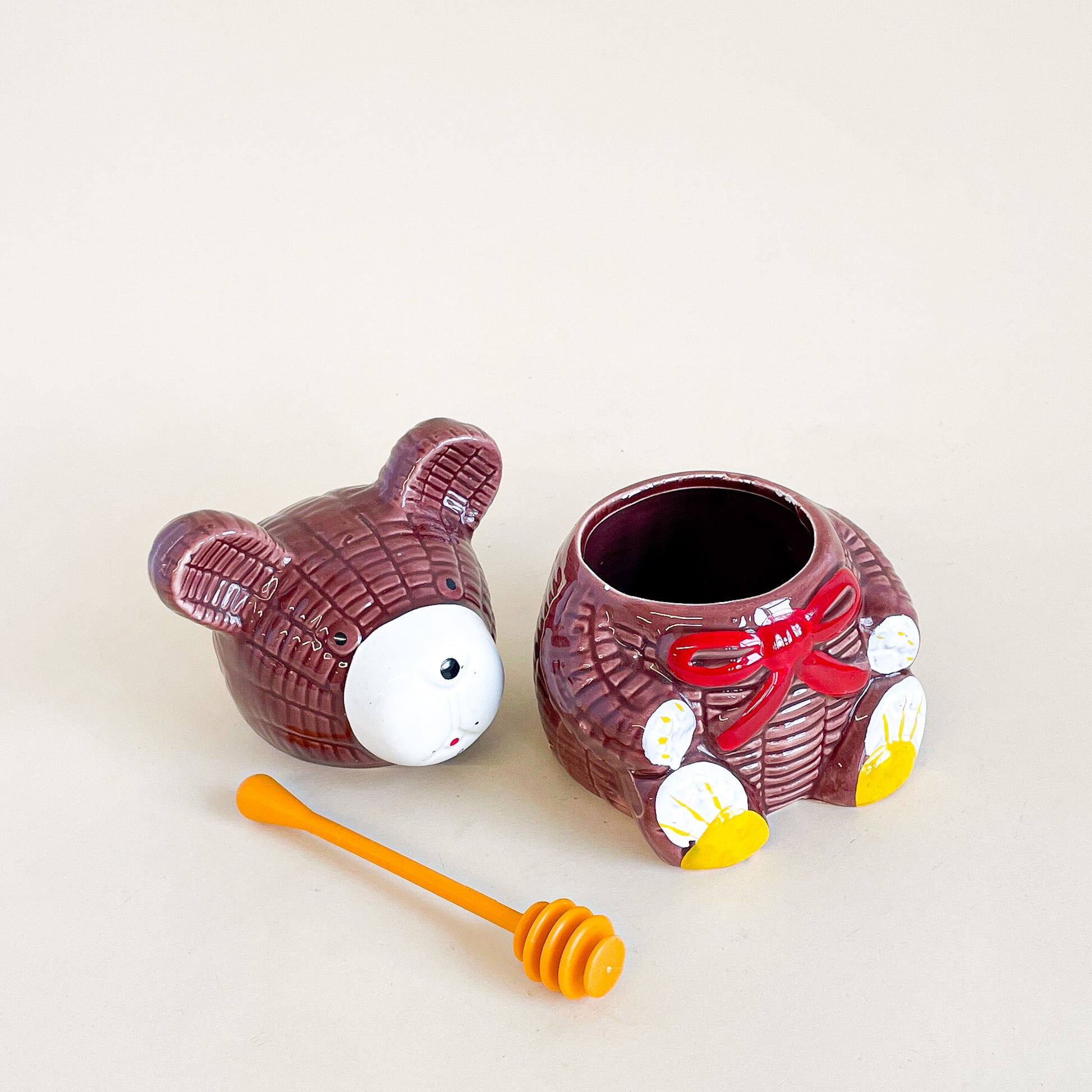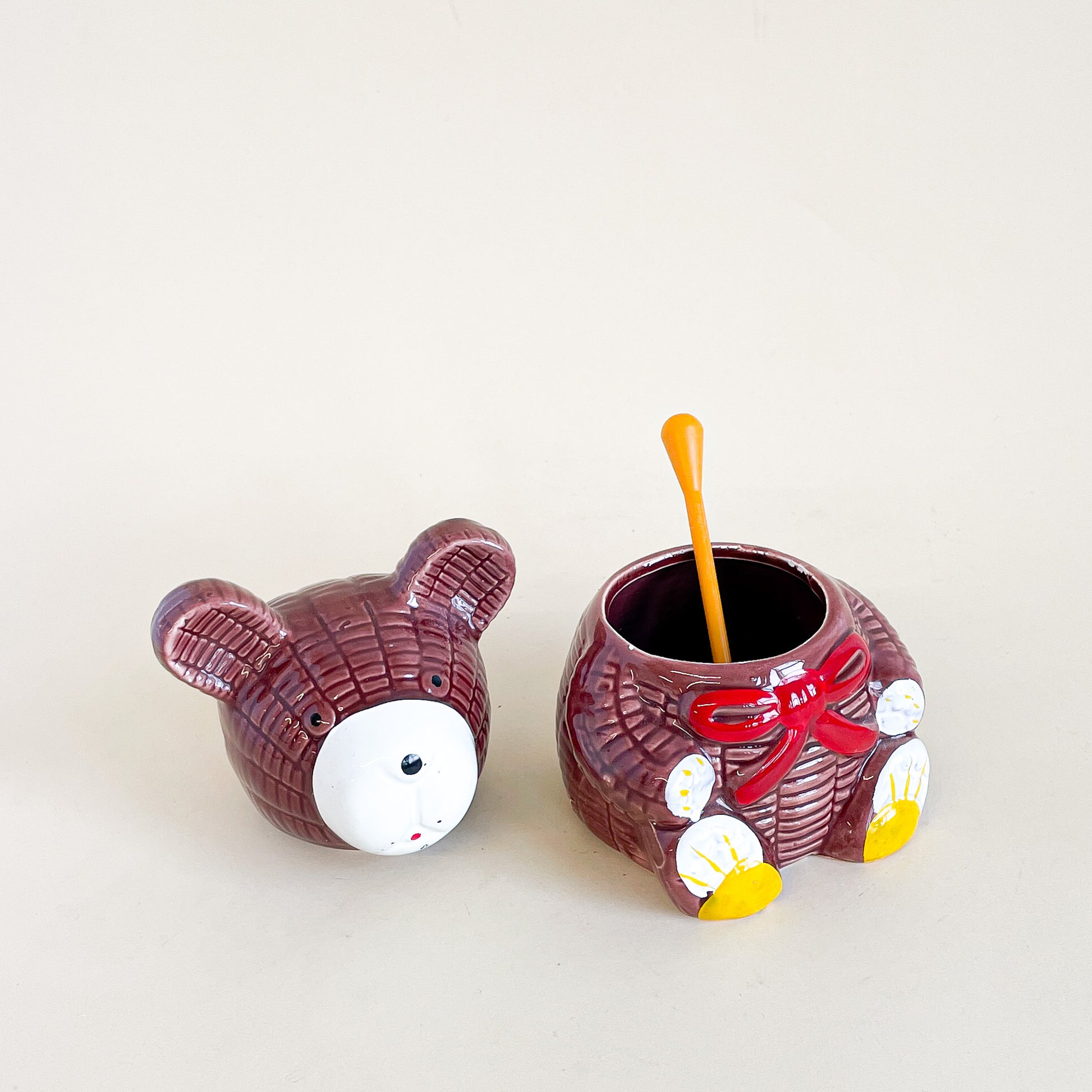 Cute pot de miel en céramique en forme d'ourson avec sa cuillère en plastique jaune.