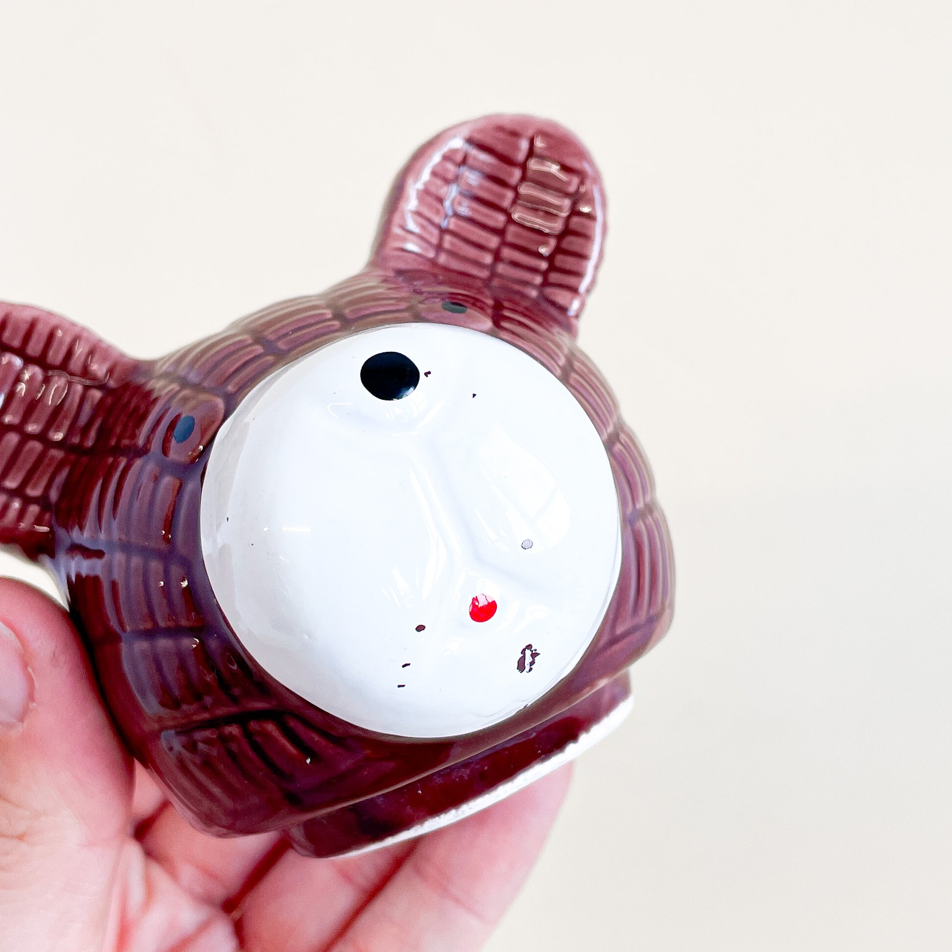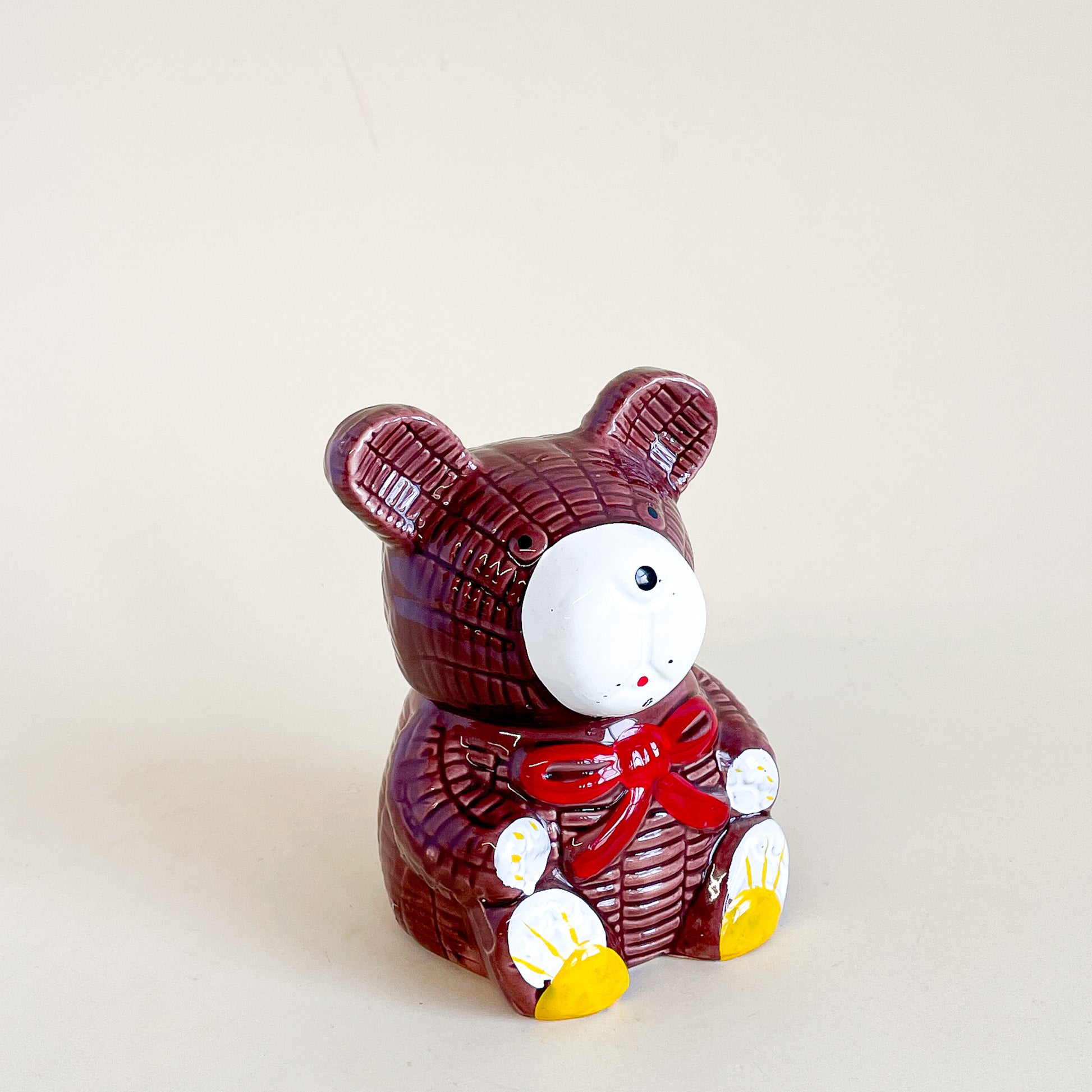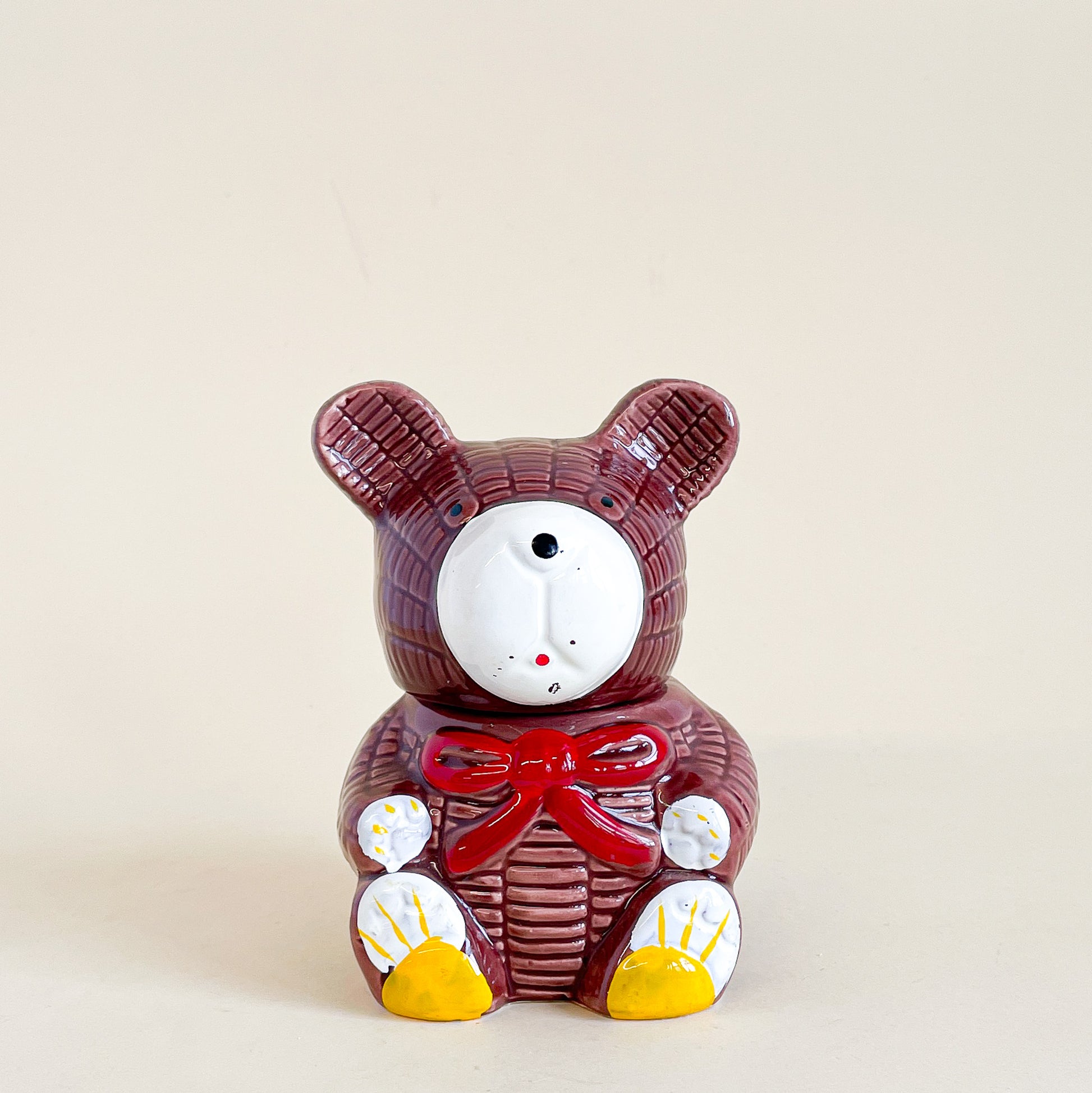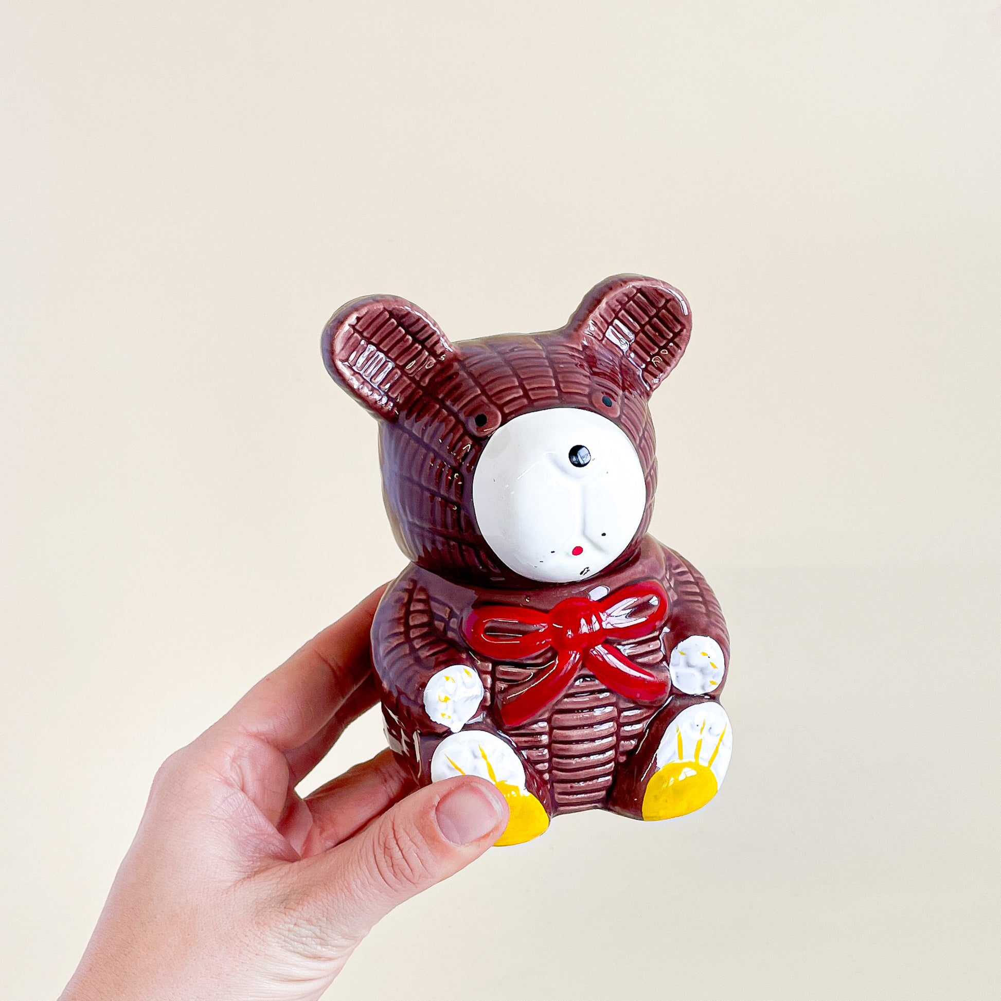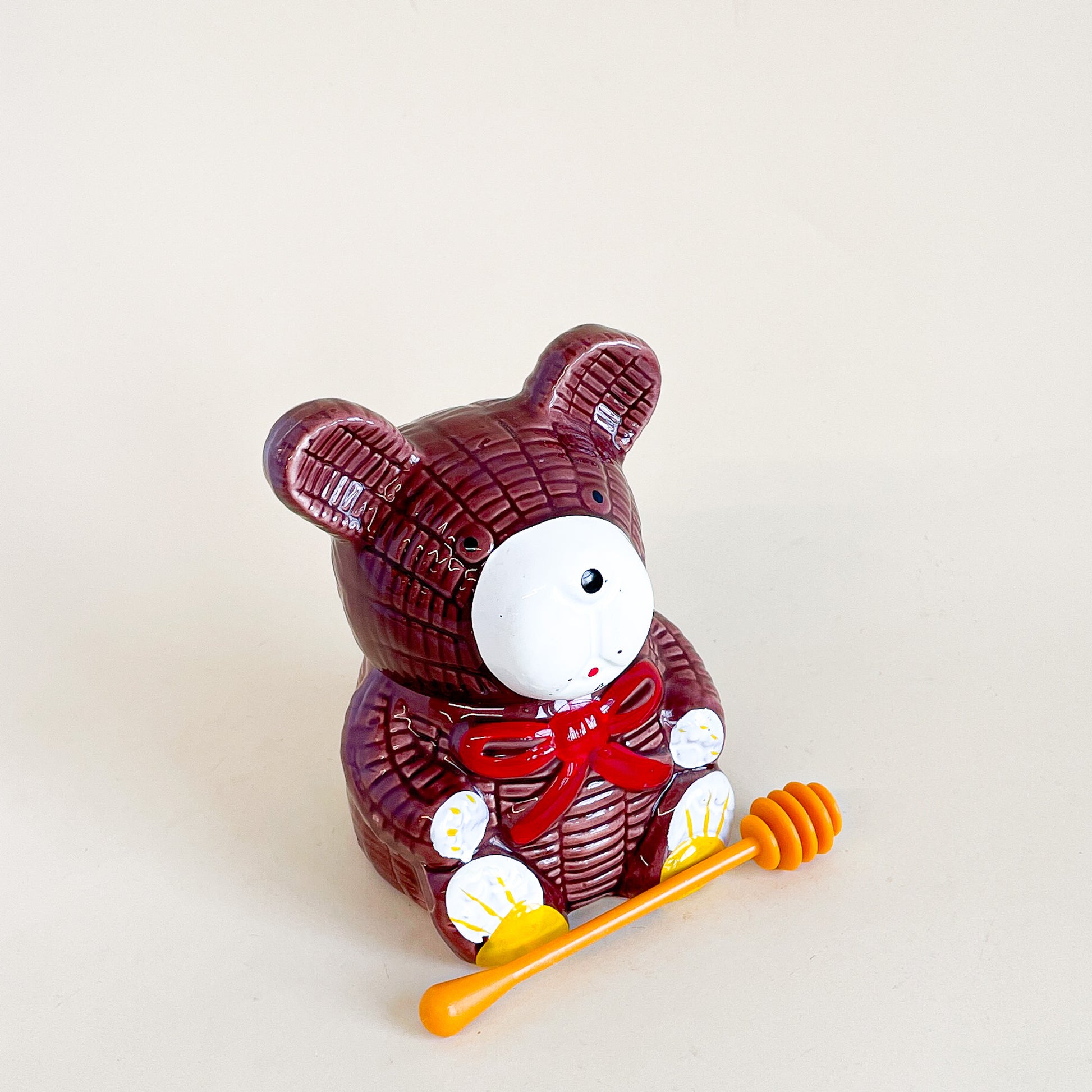 Cute pot de miel en céramique en forme d'ourson avec sa cuillère en plastique jaune.