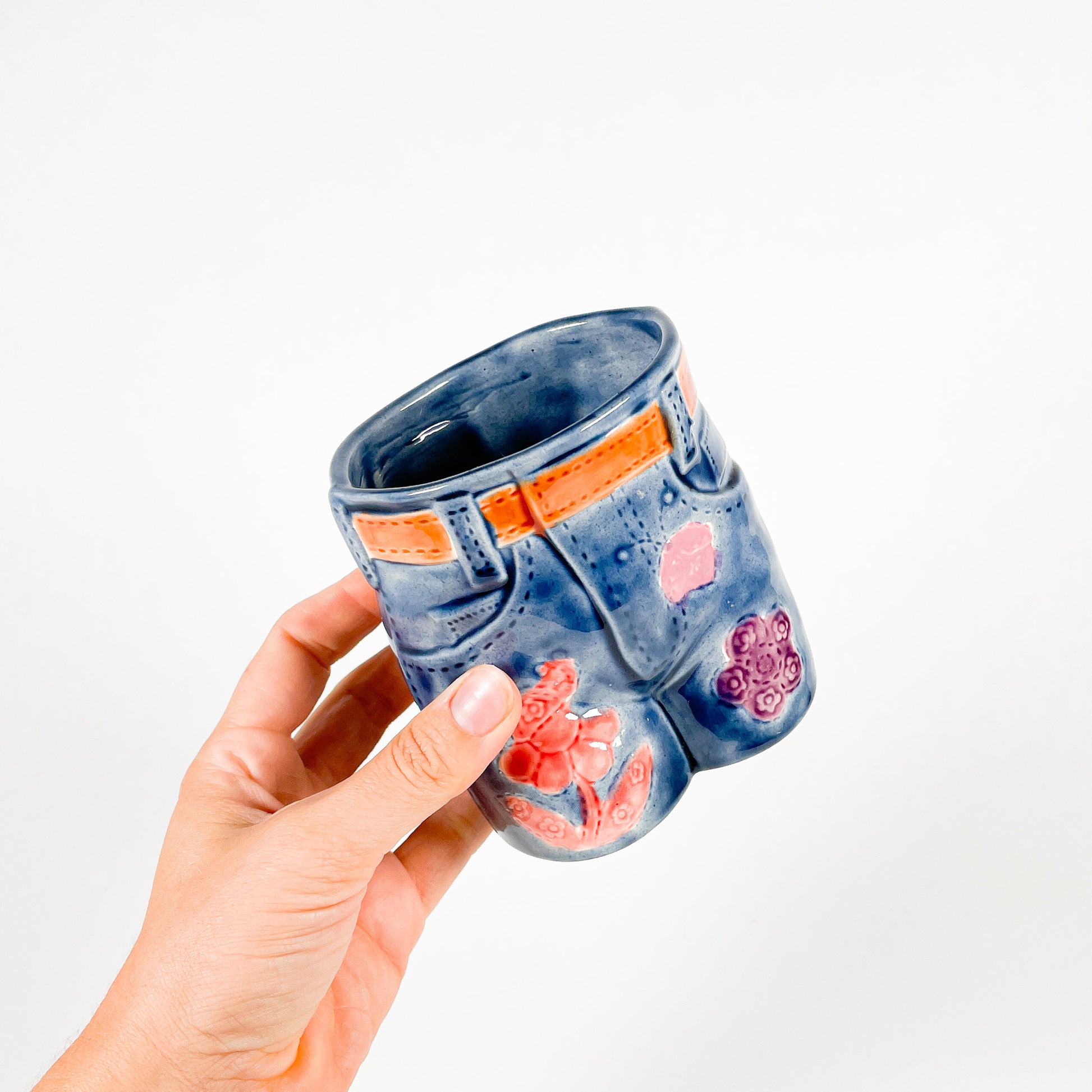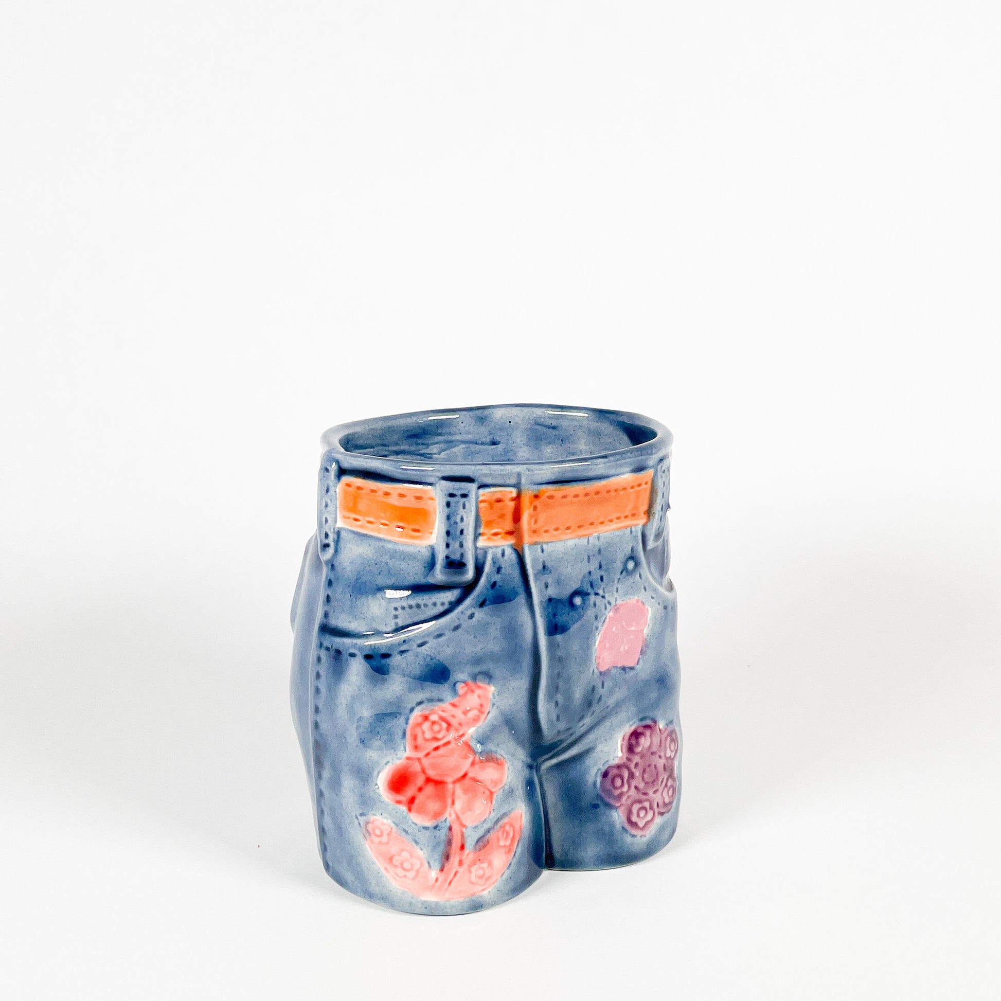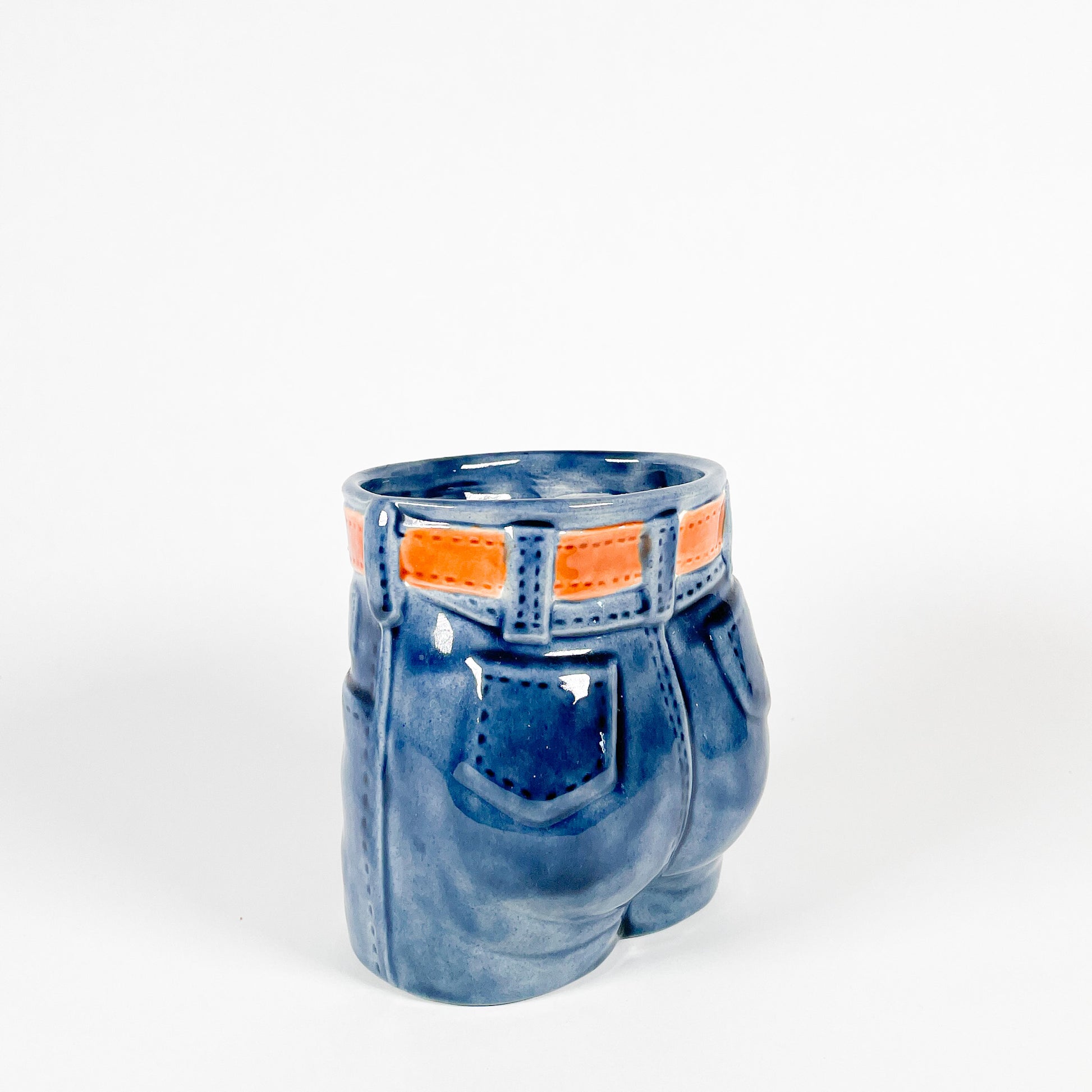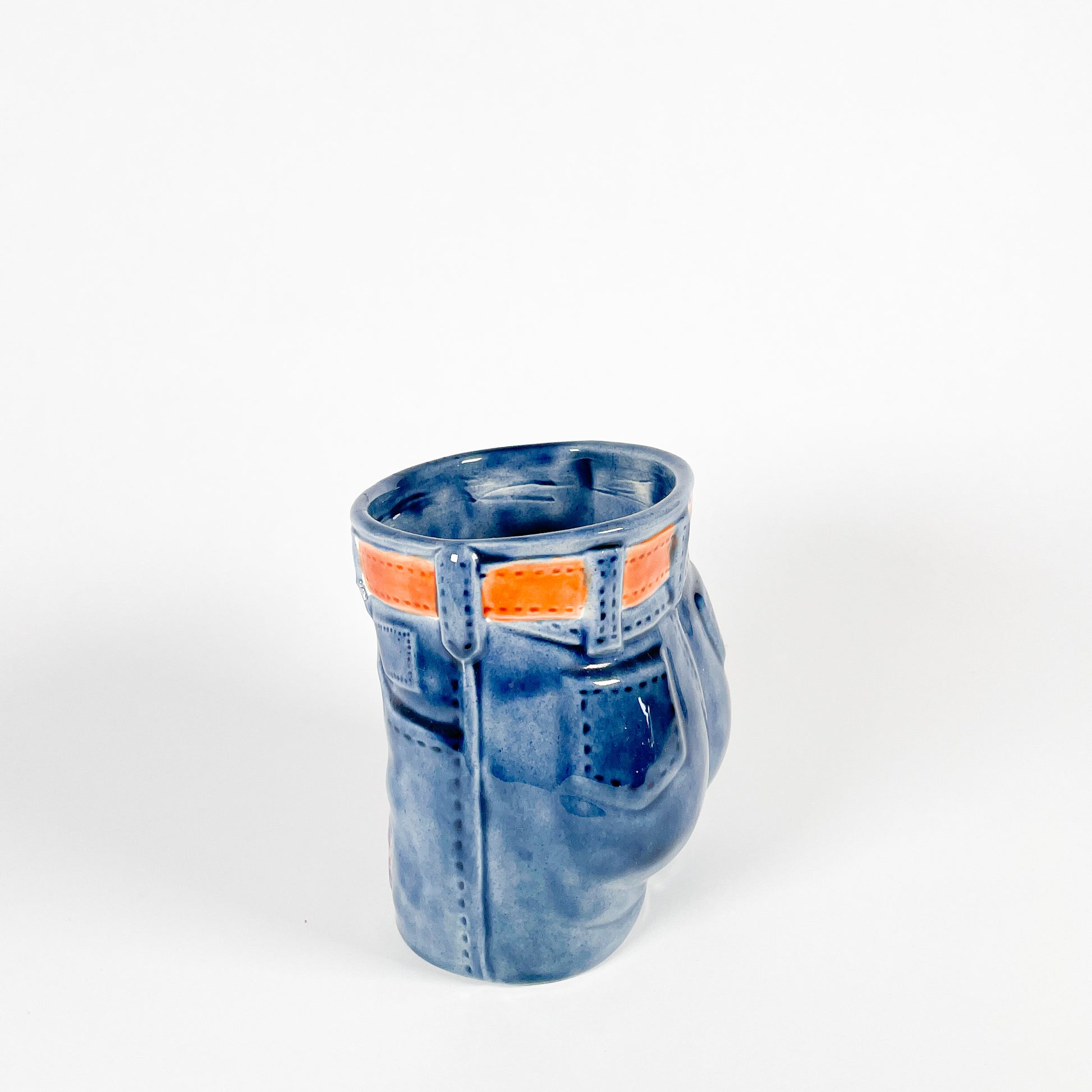 Super kitsch pot en céramique Byron Molds 1977 peint à la main en forme de jeans. À utiliser comme pot à crayons, cache-pot ou simplement en déco !